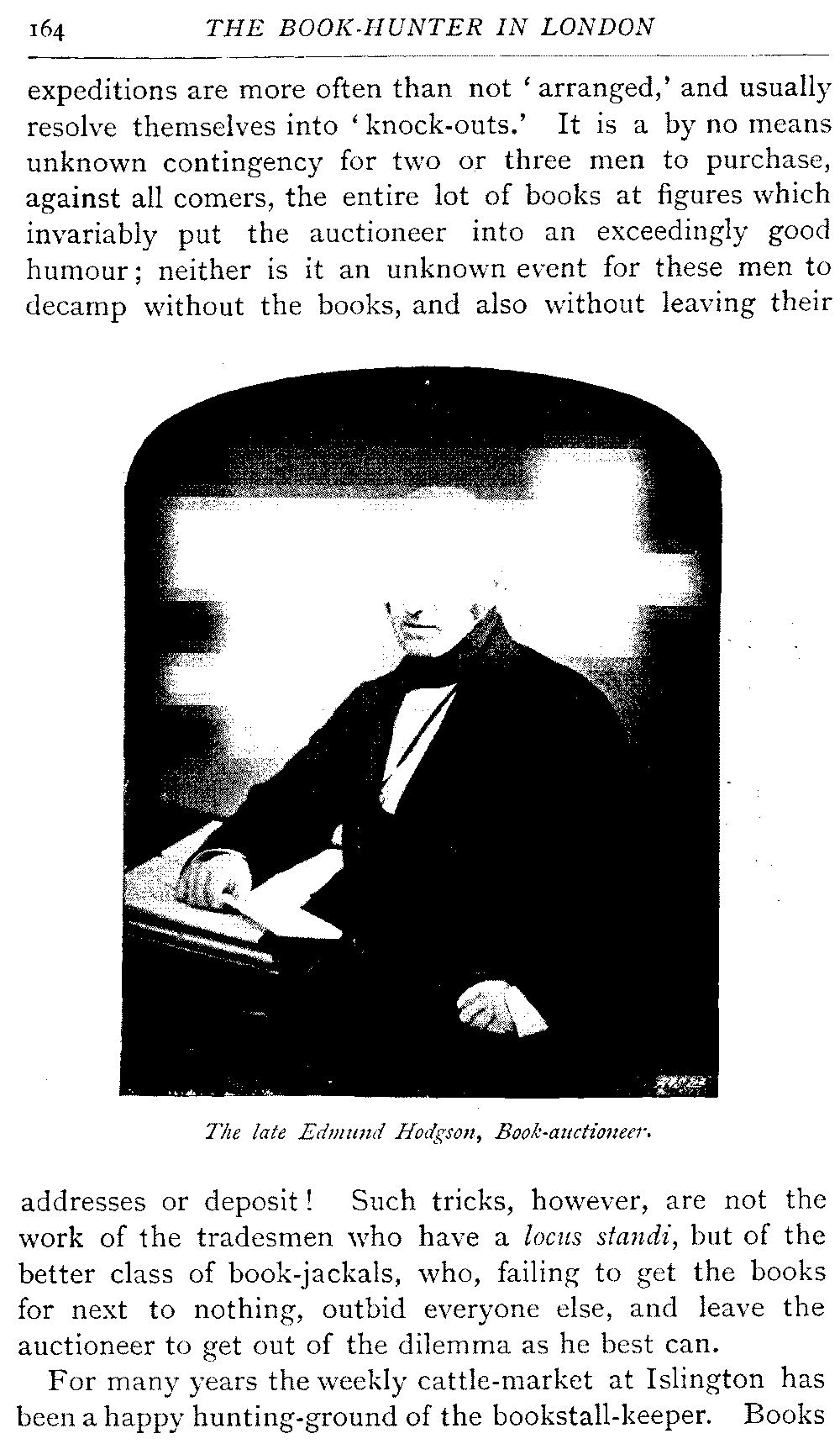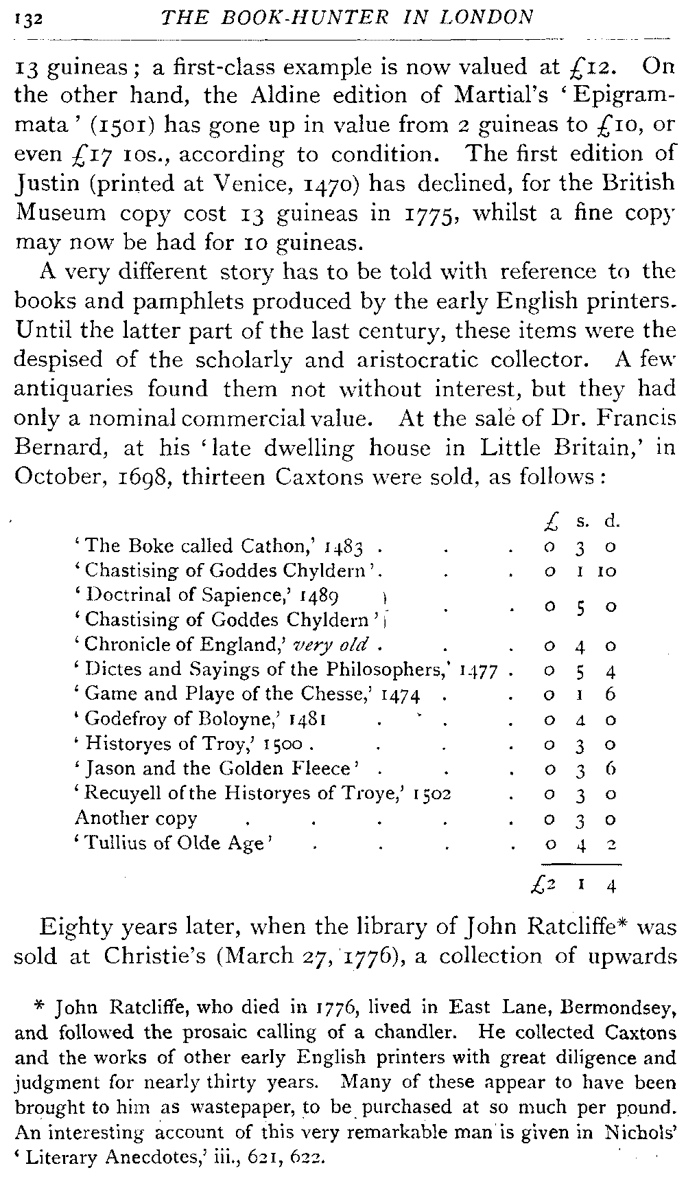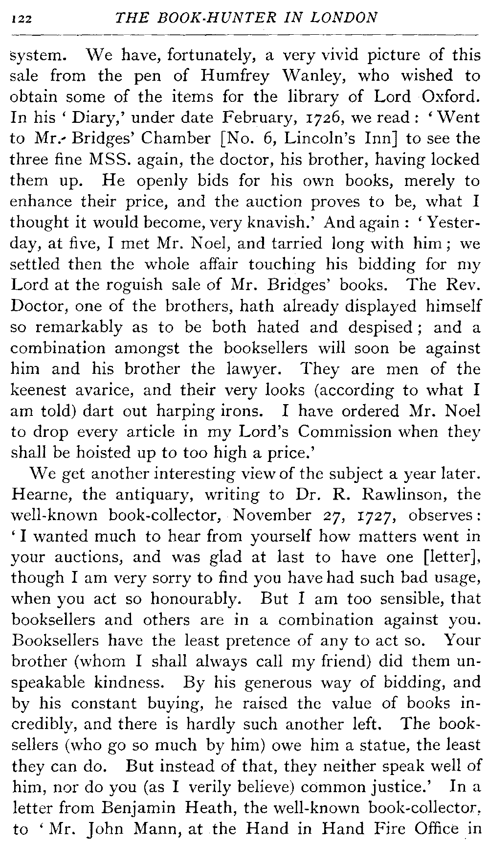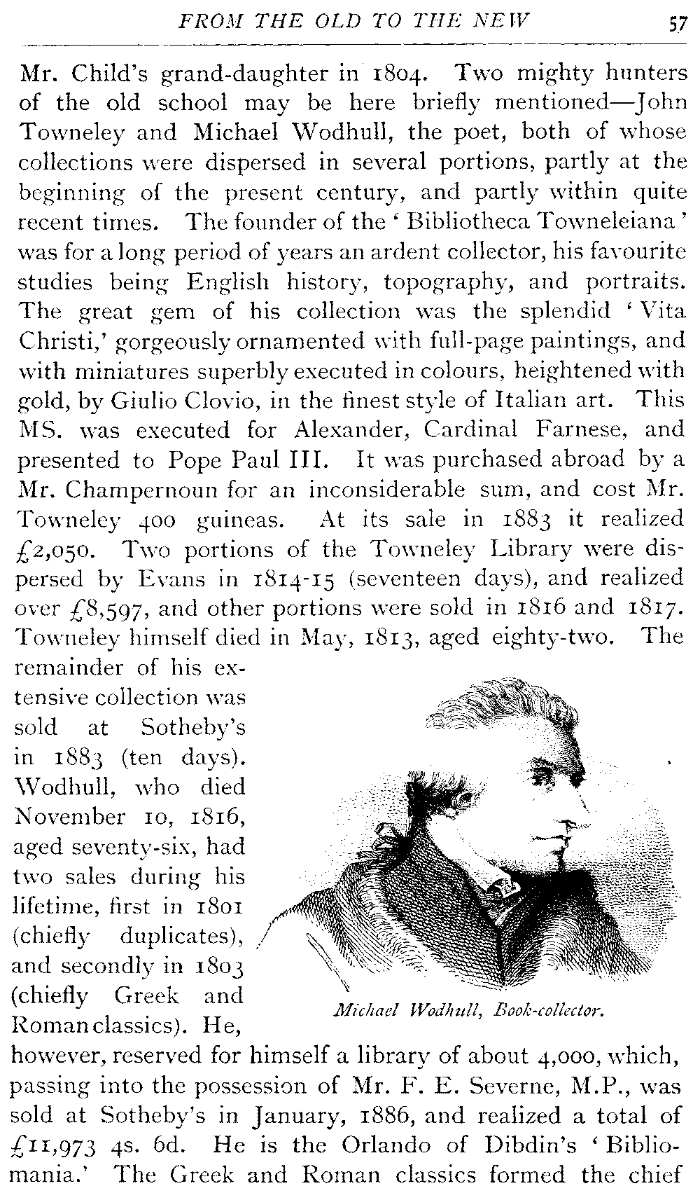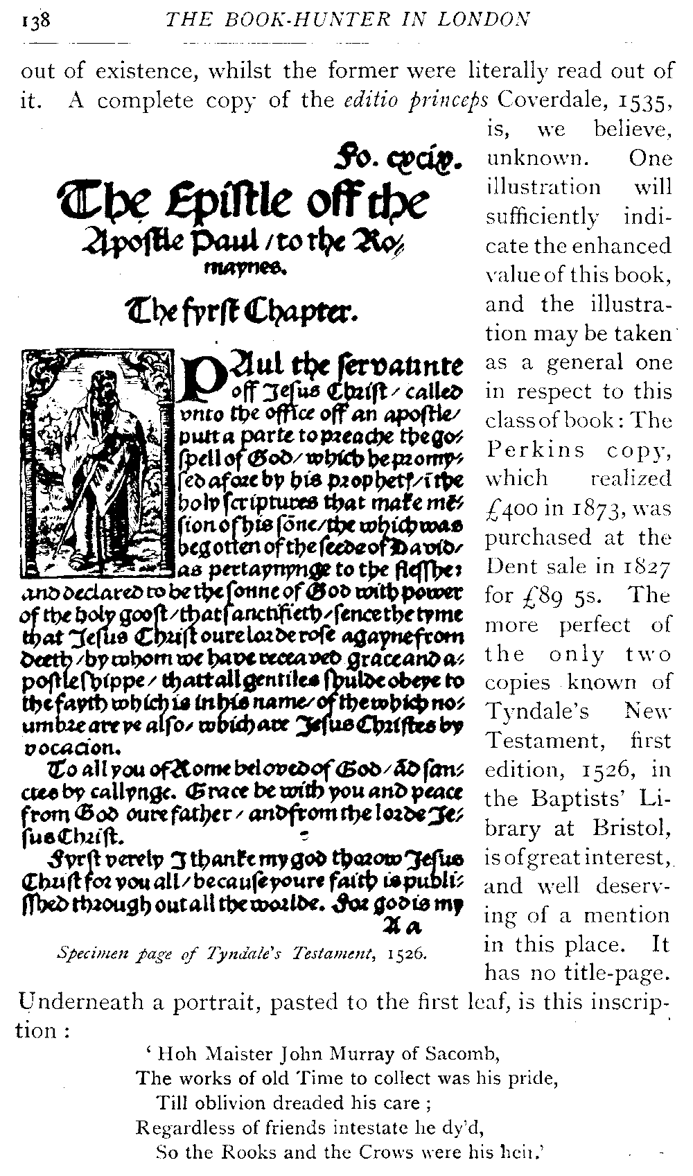 Half a century ago one of the most inveterate frequenters of book-auctions was a certain Dr. G., of diminutive stature, on account of an awkward deviation of the spine. At that time the appearance of a private purchaser at a sale was a very rare event, and one which, when it occurred, invariably met with a more or less hostile reception from the fraternity. Dr. G.'s first appearance produced a good deal of sensation. The hunchback, it is true, was rather shabbily dressed, but 'l'habit ne fait pas le moine,' and is certainly no trustworthy index to the pockets of the wearer. Excitement reached fever-heat when a Wynkyn de Worde was put up and persistently contested for by the doctor, who ran it up against the booksellers present (some of whom quickly desisted from the fun for fear of burning their fingers), one of whom, far exceeding his commission, obstinately refused to give in until the book was knocked down to him to his own dismay, and the delight and ironical compliments of his colleagues. After this contretemps the doctor had it pretty much his own way; his name was duly entered on the sale catalogue, and his address was known. The next day our bookseller, sobered by reflection, called on the doctor, confessed his sin of the previous day, humbly asked for absolution, and offered him the book at an immense loss on the sale price. 'If you were,' replied the doctor, 'to bring the book at my door for nothing, I would take it with a pair of tongs and drop it into the gutter.' It was a puzzle to everyone what the little doctor did with all his purchases, which were limited chiefly to classical books. At [xxx]his death, however, it transpired that he bought for the various Universities of the United Kingdom. The doctor's son, a poor curate, entered his late father's library for the first time, and found there a mass of books, which occupied nearly a month in selling, and realized, to his delight, a large sum of money.