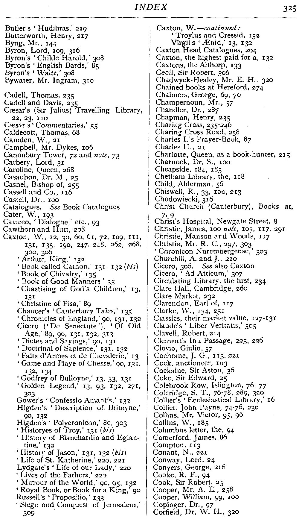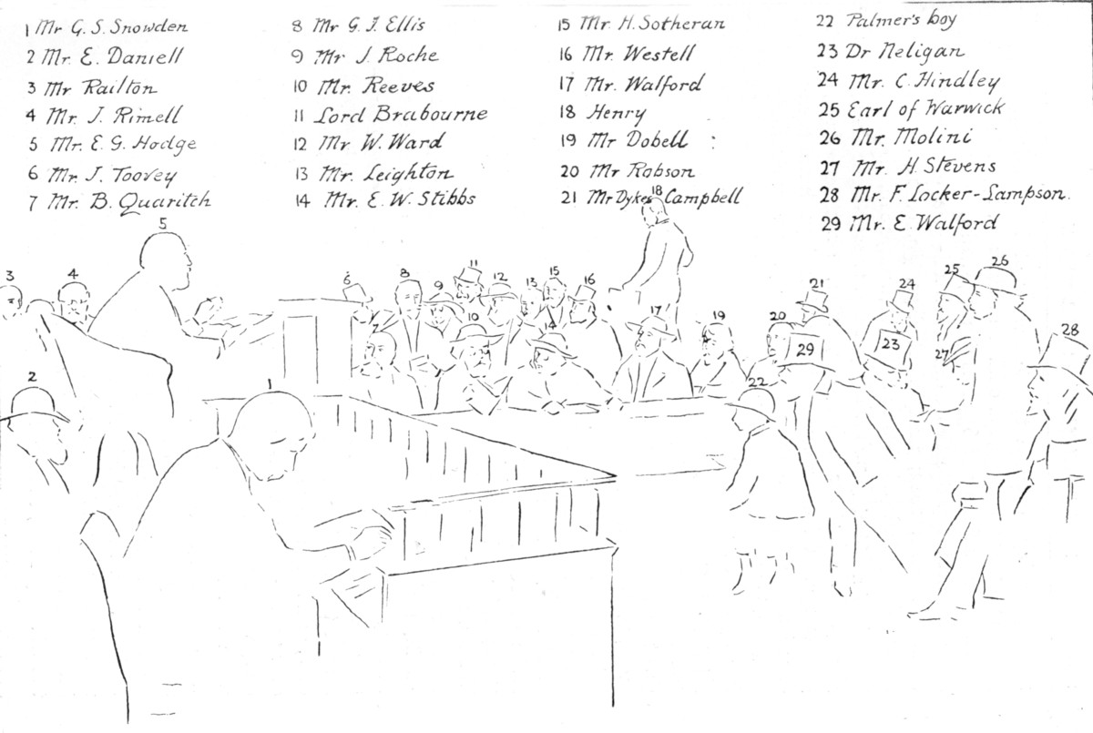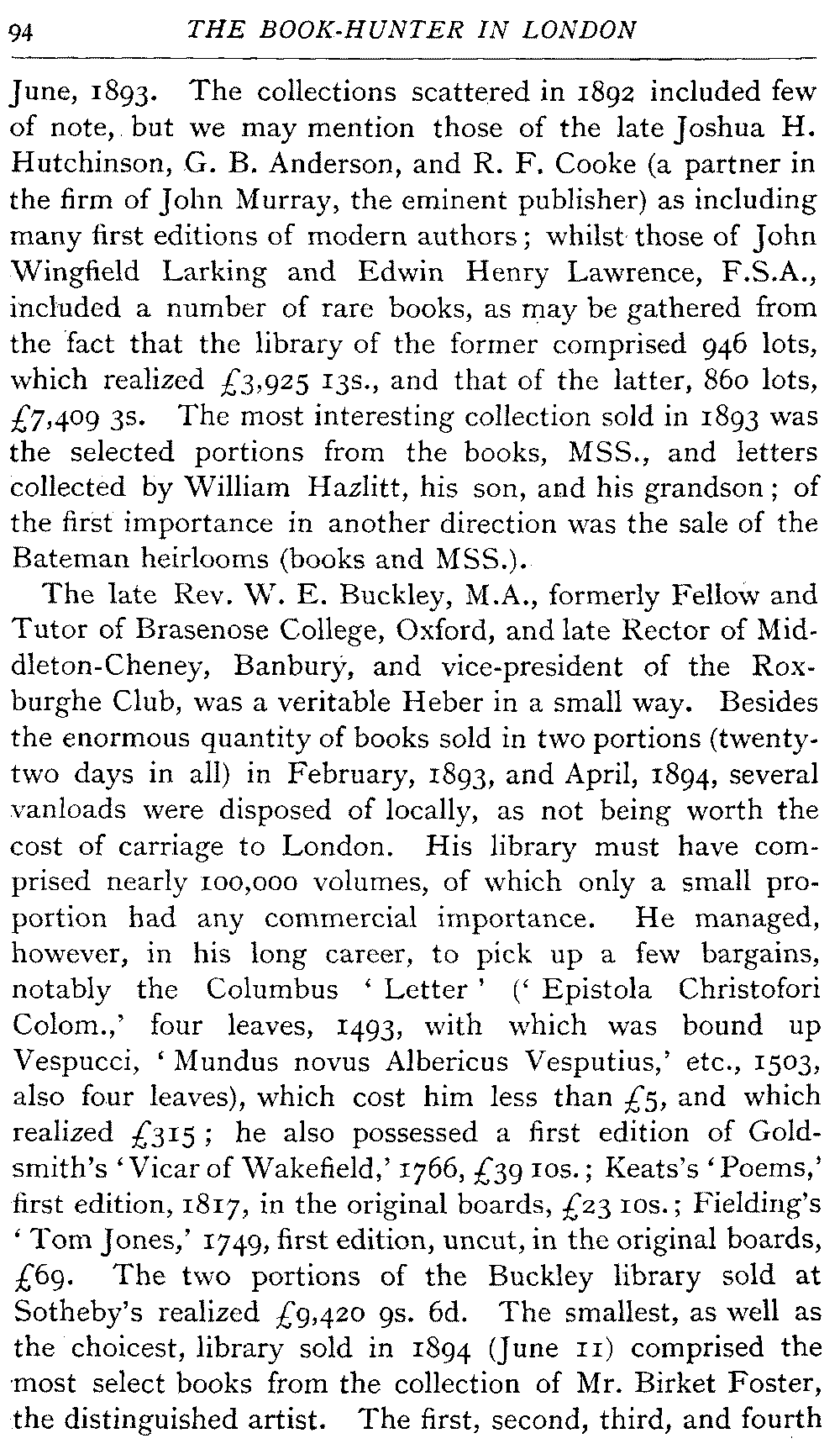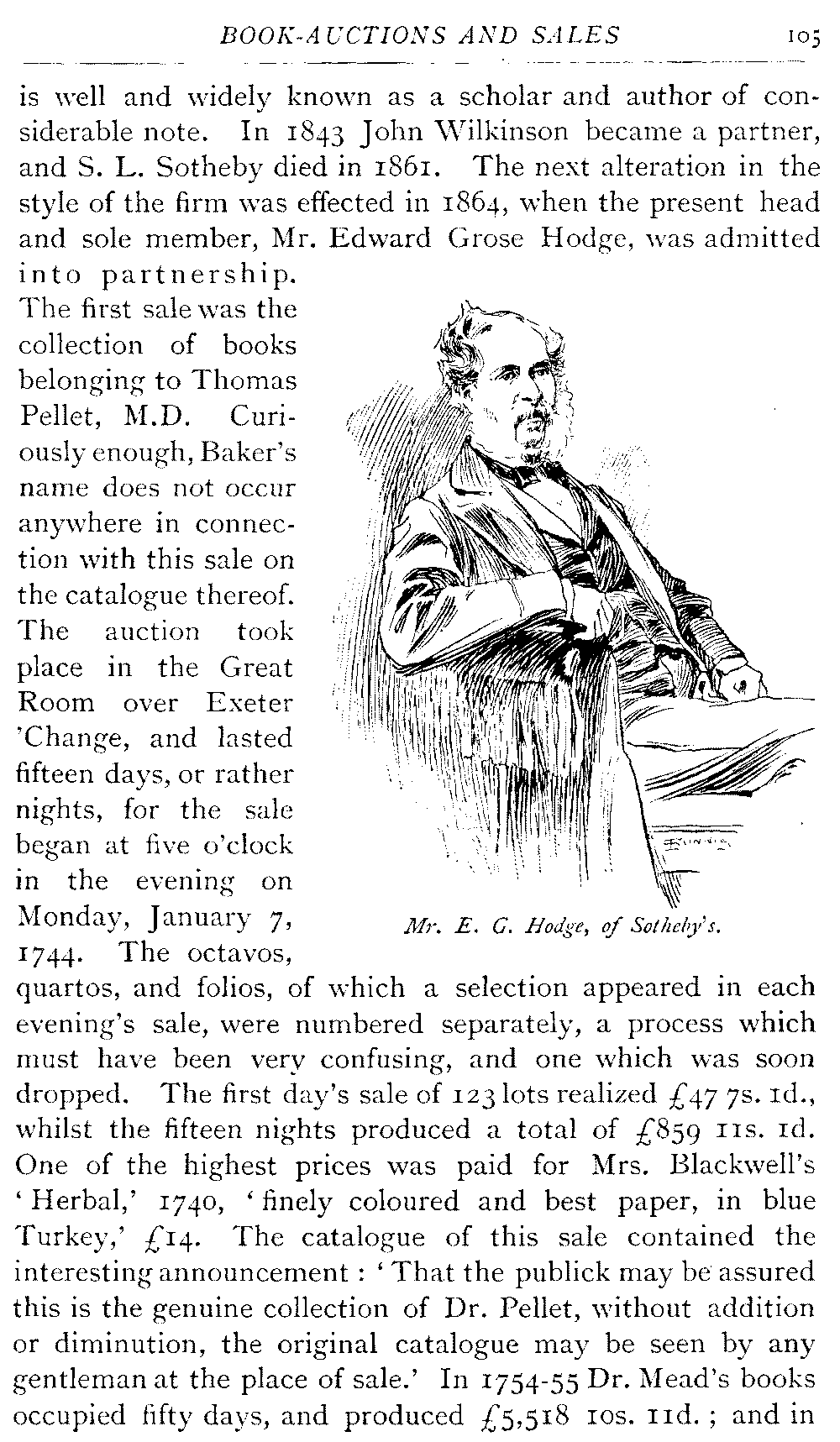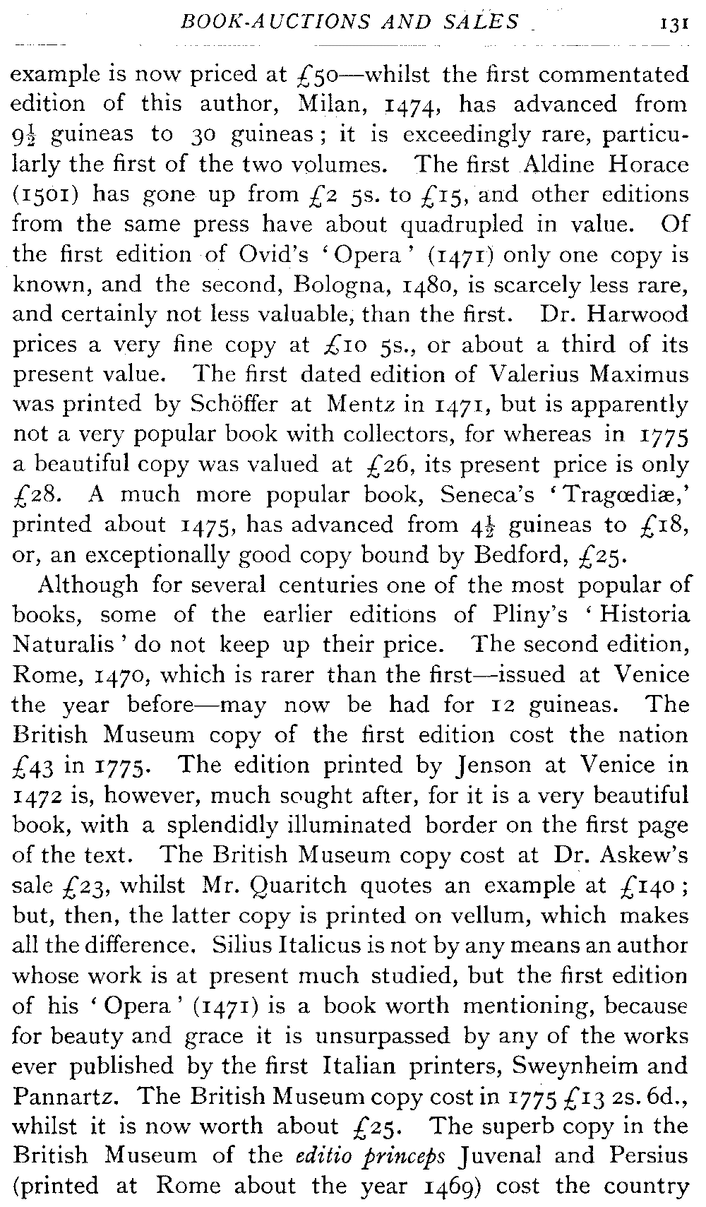 Half a century ago one of the most inveterate frequenters of book-auctions was a certain Dr. G., of diminutive stature, on account of an awkward deviation of the spine. At that time the appearance of a private purchaser at a sale was a very rare event, and one which, when it occurred, invariably met with a more or less hostile reception from the fraternity. Dr. G.'s first appearance produced a good deal of sensation. The hunchback, it is true, was rather shabbily dressed, but 'l'habit ne fait pas le moine,' and is certainly no trustworthy index to the pockets of the wearer. Excitement reached fever-heat when a Wynkyn de Worde was put up and persistently contested for by the doctor, who ran it up against the booksellers present (some of whom quickly desisted from the fun for fear of burning their fingers), one of whom, far exceeding his commission, obstinately refused to give in until the book was knocked down to him to his own dismay, and the delight and ironical compliments of his colleagues. After this contretemps the doctor had it pretty much his own way; his name was duly entered on the sale catalogue, and his address was known. The next day our bookseller, sobered by reflection, called on the doctor, confessed his sin of the previous day, humbly asked for absolution, and offered him the book at an immense loss on the sale price. 'If you were,' replied the doctor, 'to bring the book at my door for nothing, I would take it with a pair of tongs and drop it into the gutter.' It was a puzzle to everyone what the little doctor did with all his purchases, which were limited chiefly to classical books. At [xxx]his death, however, it transpired that he bought for the various Universities of the United Kingdom. The doctor's son, a poor curate, entered his late father's library for the first time, and found there a mass of books, which occupied nearly a month in selling, and realized, to his delight, a large sum of money.