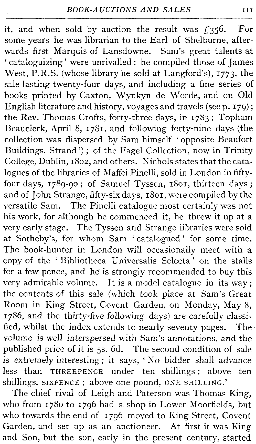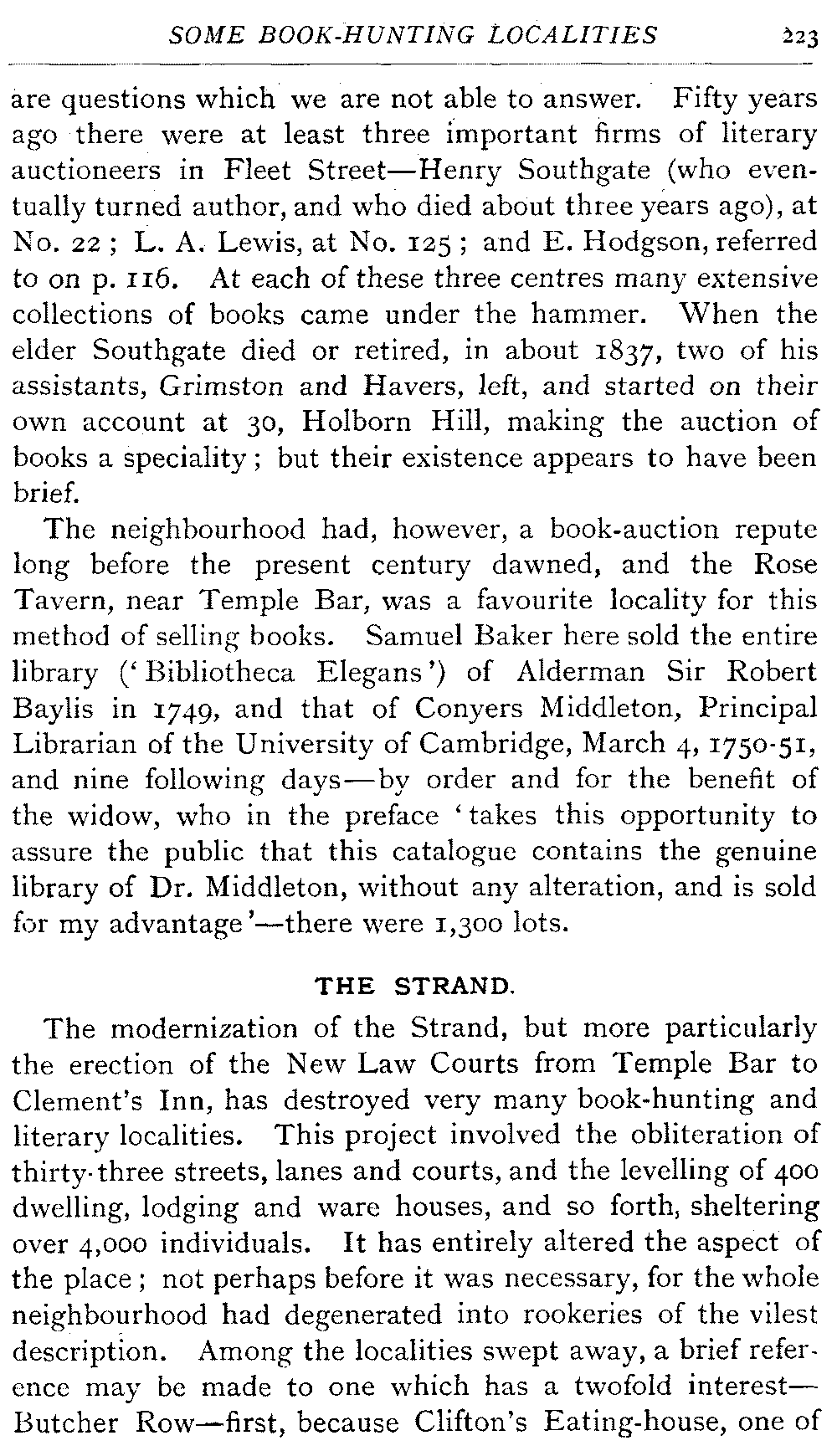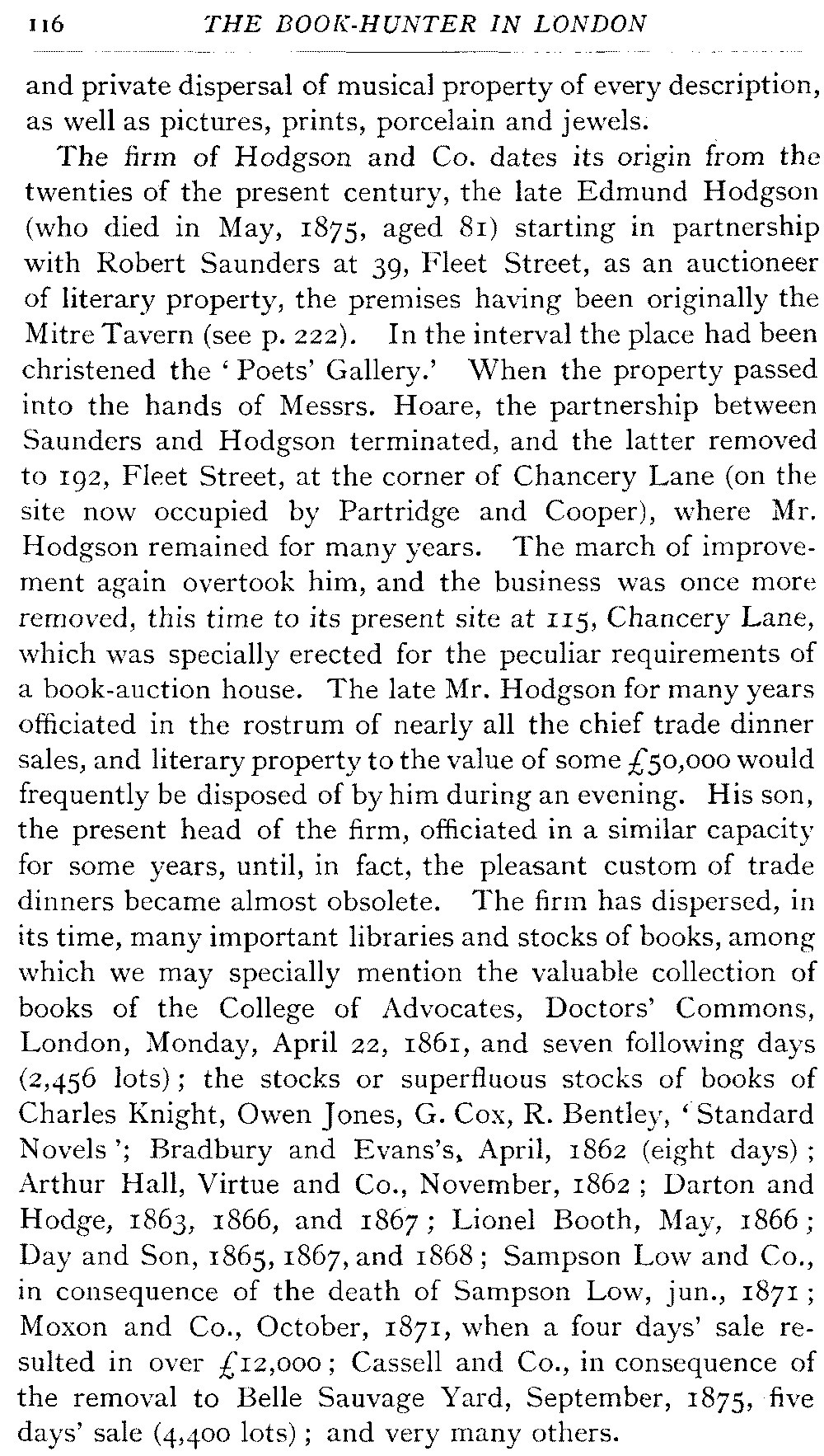 The greatest possible care has been taken to prevent inaccuracy of any kind, but whilst freedom from error is a consummation which every author desires, it is also one of which few can boast. The reader will be doing the author a favour by informing him of any mistake which may be detected in the following pages. An omission in the account of Stewart, the founder of Puttick's, may be here made good: he had the privilege of selling David Garrick's choice library in 1823. The author regrets to learn that Purcell (p. 165), a very intelligent bookseller, died some months ago.