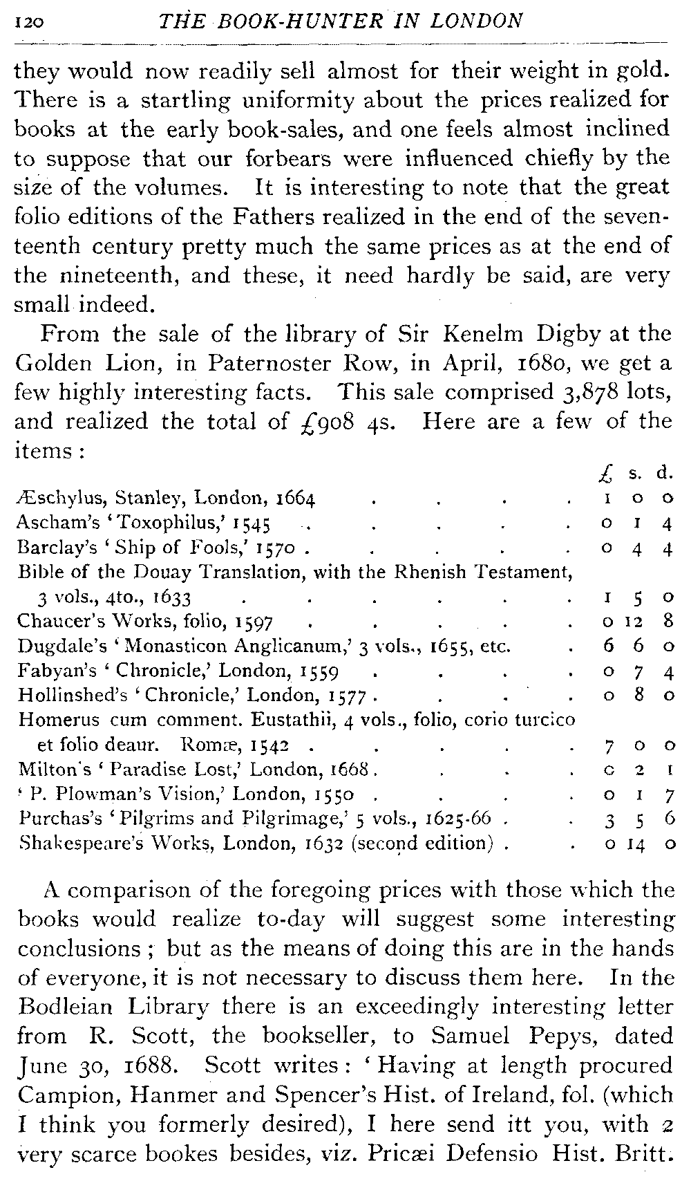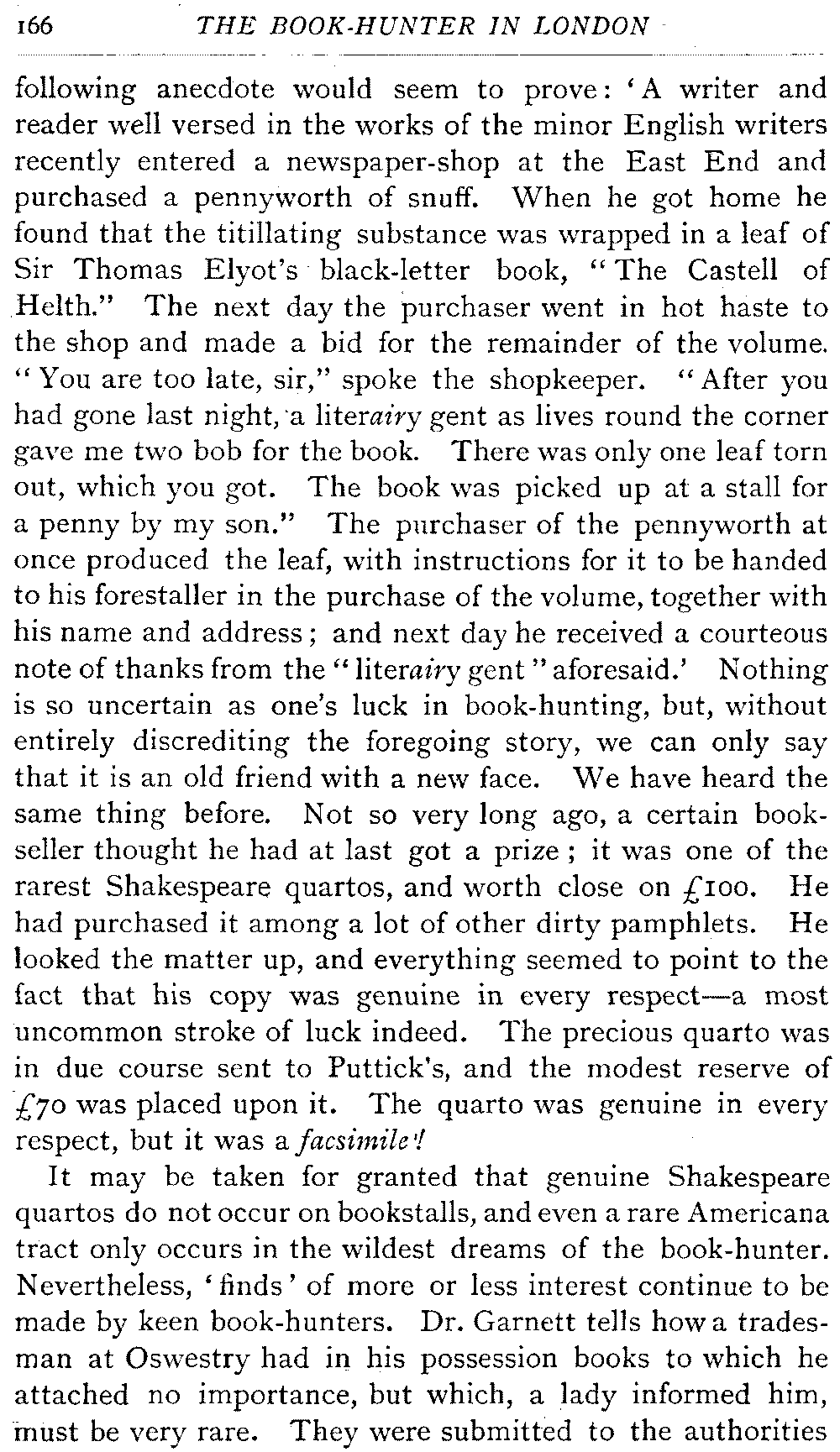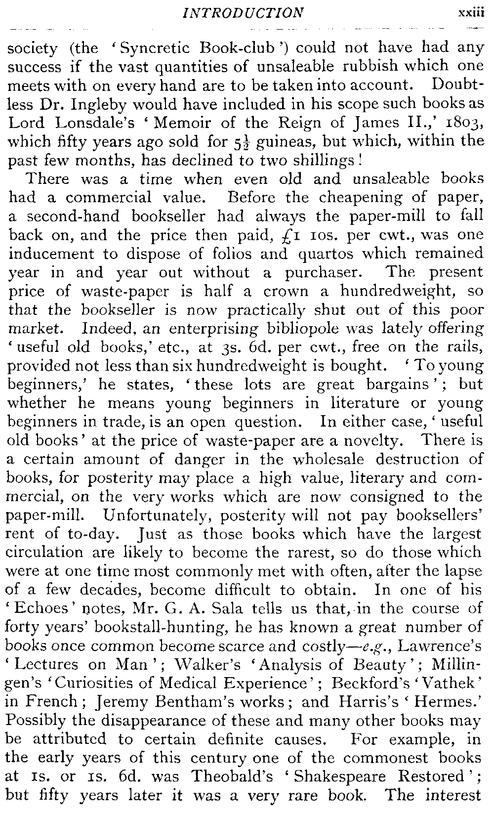 There was a time when even old and unsaleable books had a commercial value. Before the cheapening of paper, a second-hand bookseller had always the paper-mill to fall back on, and the price then paid, £1 10s. per cwt., was one inducement to dispose of folios and quartos which remained year in and year out without a purchaser. The present price of waste-paper is half a crown a hundredweight, so that the bookseller is now practically shut out of this poor market. Indeed, an enterprising bibliopole was lately offering 'useful old books,' etc., at 3s. 6d. per cwt., free on the rails, provided not less than six hundredweight is bought. 'To young beginners,' he states, 'these lots are great bargains'; but whether he means young beginners in literature or young beginners in trade, is an open question. In either case, 'useful old books' at the price of waste-paper are a novelty. There is a certain amount of danger in the wholesale destruction of books, for posterity may place a high value, literary and commercial, on the very works which are now consigned to the paper-mill. Unfortunately, posterity will not pay booksellers' rent of to-day. Just as those books which have the largest circulation are likely to become the rarest, so do those which were at one time most commonly met with often, after the lapse of a few decades, become difficult to obtain. In one of his 'Echoes' notes, Mr. G. A. Sala tells us that, in the course of forty years' bookstall-hunting, he has known a great number of books once common become scarce and costly—e.g., Lawrence's 'Lectures on Man'; Walker's 'Analysis of Beauty'; Millingen's 'Curiosities of Medical Experience'; Beckford's 'Vathek' in French; Jeremy Bentham's works; and Harris's 'Hermes.' Possibly the disappearance of these and many other books may be attributed to certain definite causes. For example, in the early years of this century one of the commonest books at 1s. or 1s. 6d. was Theobald's 'Shakespeare Restored'; but fifty years later it was a very rare book. The interest [xxiv]in Shakespeare and his editors had become quite wide-spread in literary circles, and literature in any way bearing on the subject found ready purchasers.