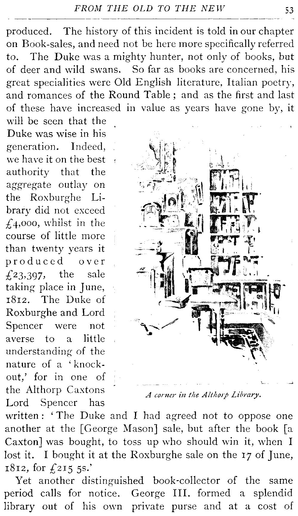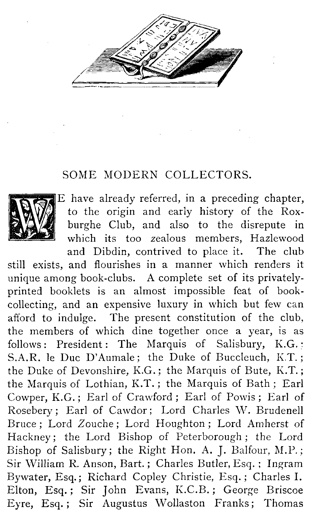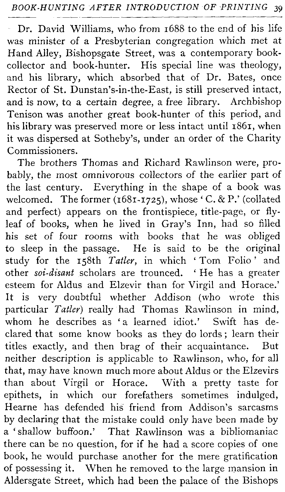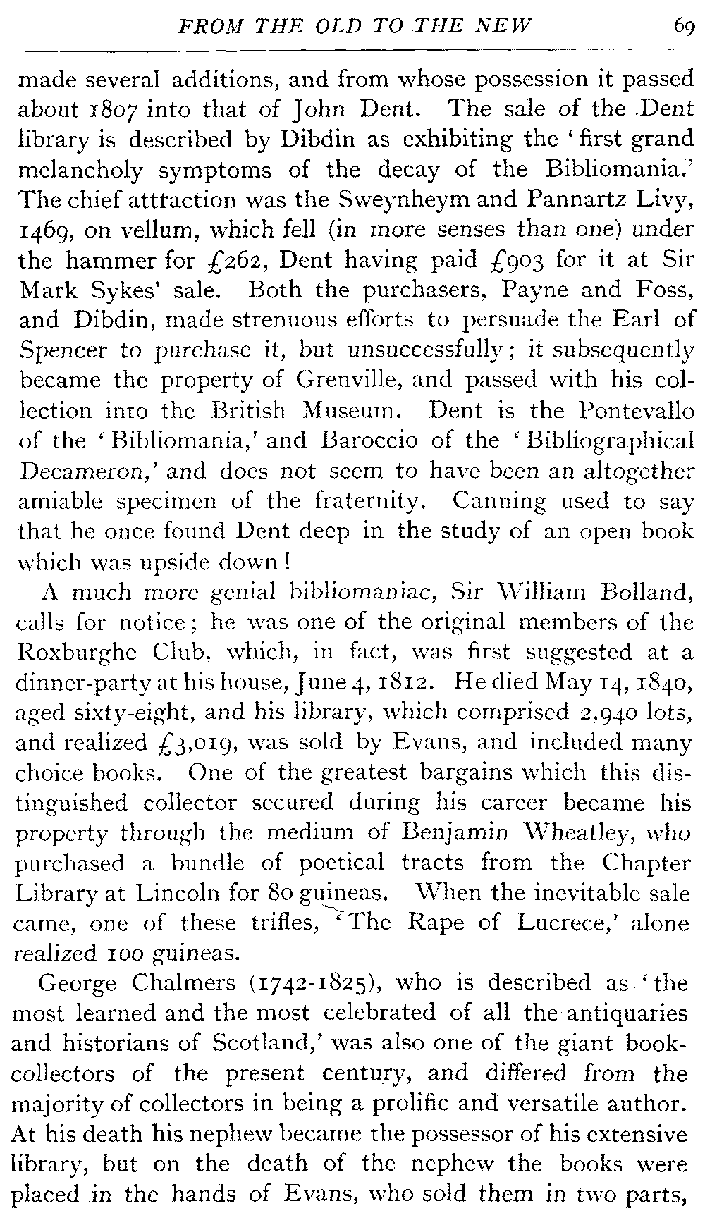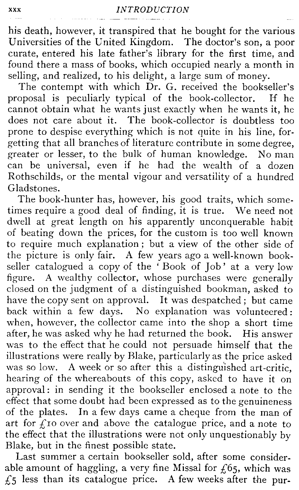 The contempt with which Dr. G. received the bookseller's proposal is peculiarly typical of the book-collector. If he cannot obtain what he wants just exactly when he wants it, he does not care about it. The book-collector is doubtless too prone to despise everything which is not quite in his line, forgetting that all branches of literature contribute in some degree, greater or lesser, to the bulk of human knowledge. No man can be universal, even if he had the wealth of a dozen Rothschilds, or the mental vigour and versatility of a hundred Gladstones.