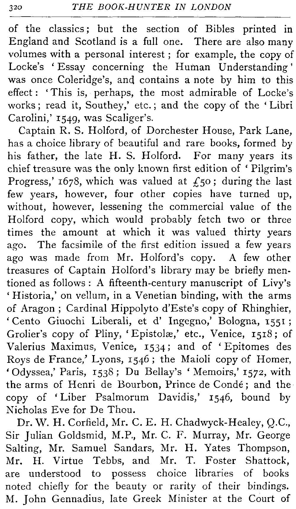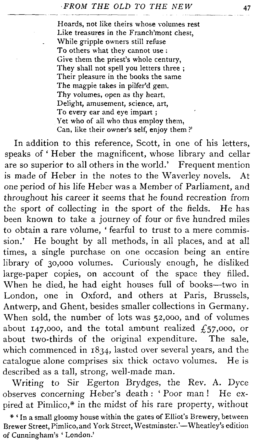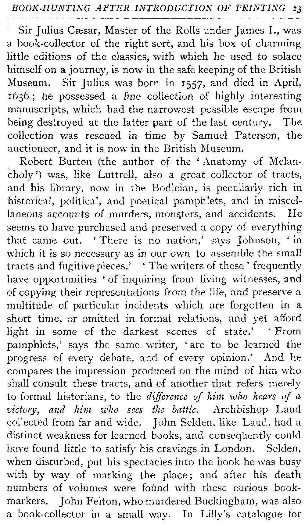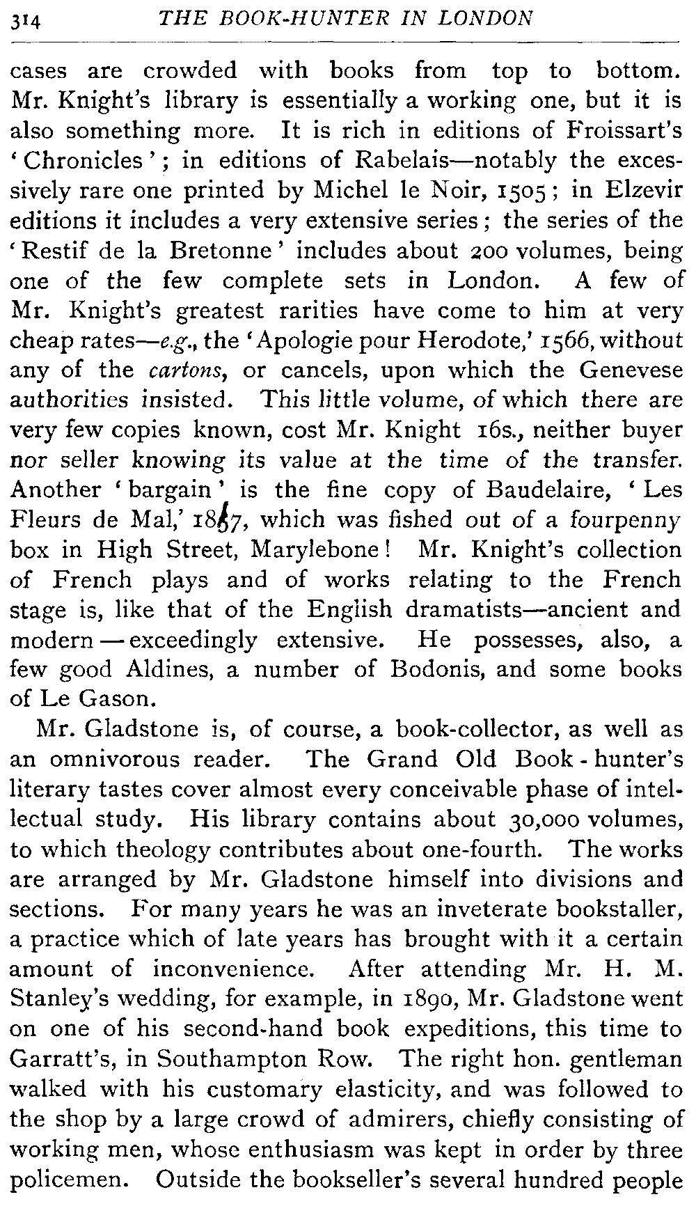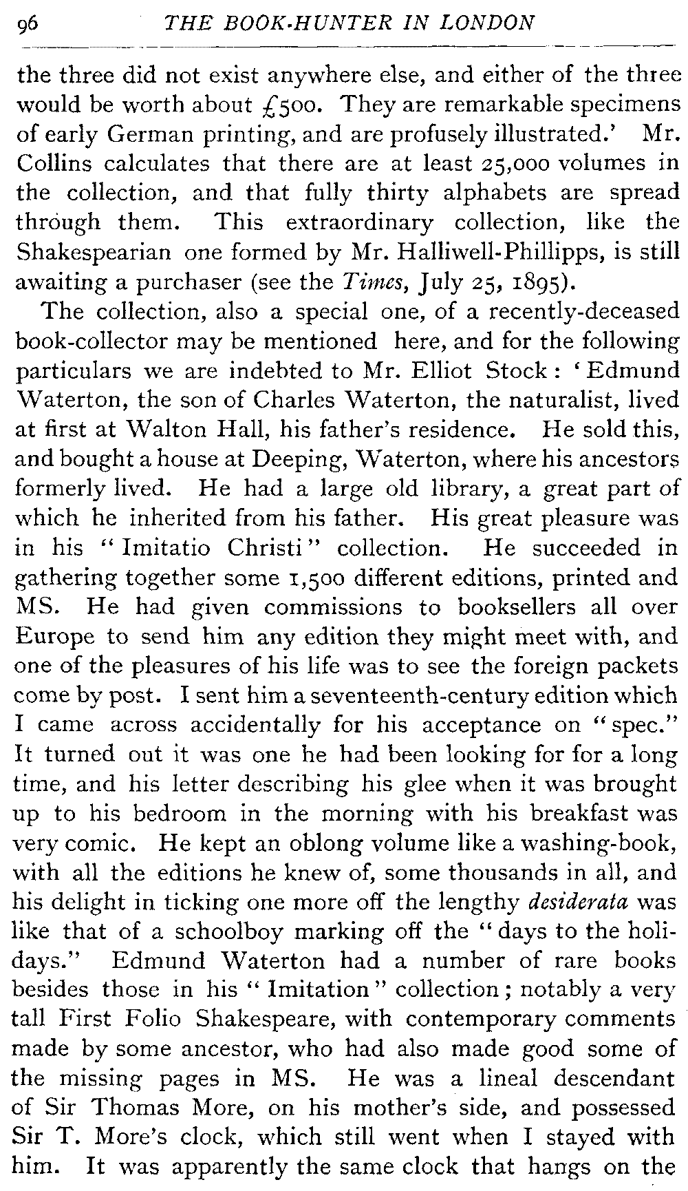 The contempt with which Dr. G. received the bookseller's proposal is peculiarly typical of the book-collector. If he cannot obtain what he wants just exactly when he wants it, he does not care about it. The book-collector is doubtless too prone to despise everything which is not quite in his line, forgetting that all branches of literature contribute in some degree, greater or lesser, to the bulk of human knowledge. No man can be universal, even if he had the wealth of a dozen Rothschilds, or the mental vigour and versatility of a hundred Gladstones.
