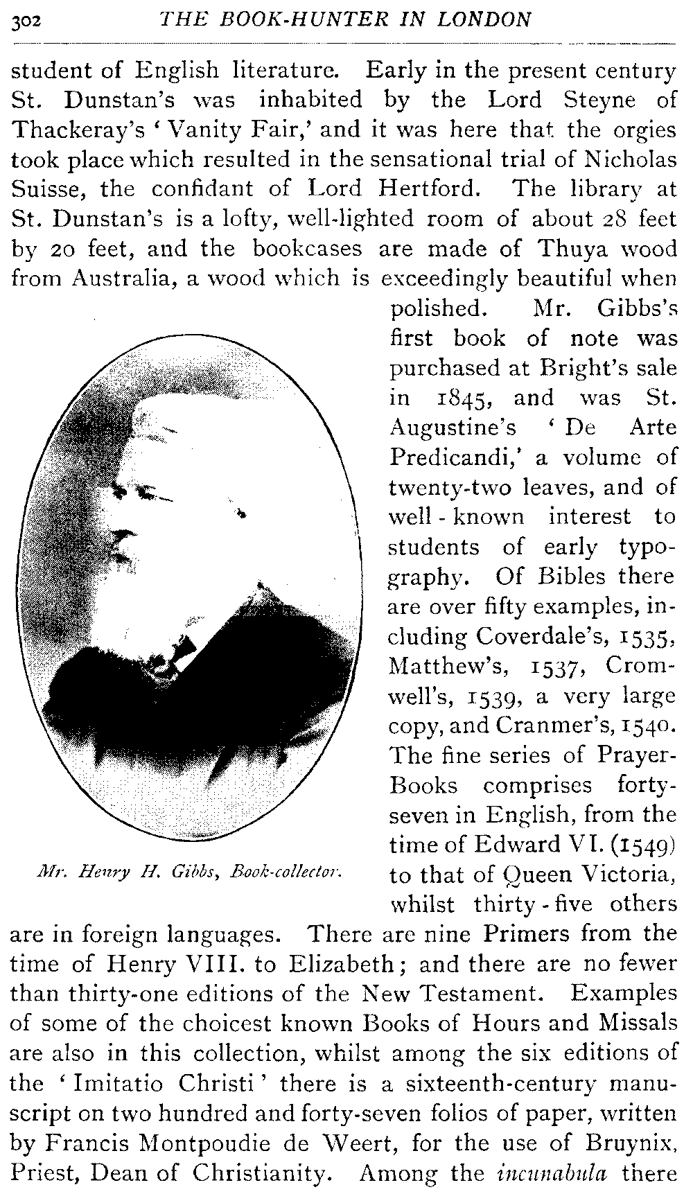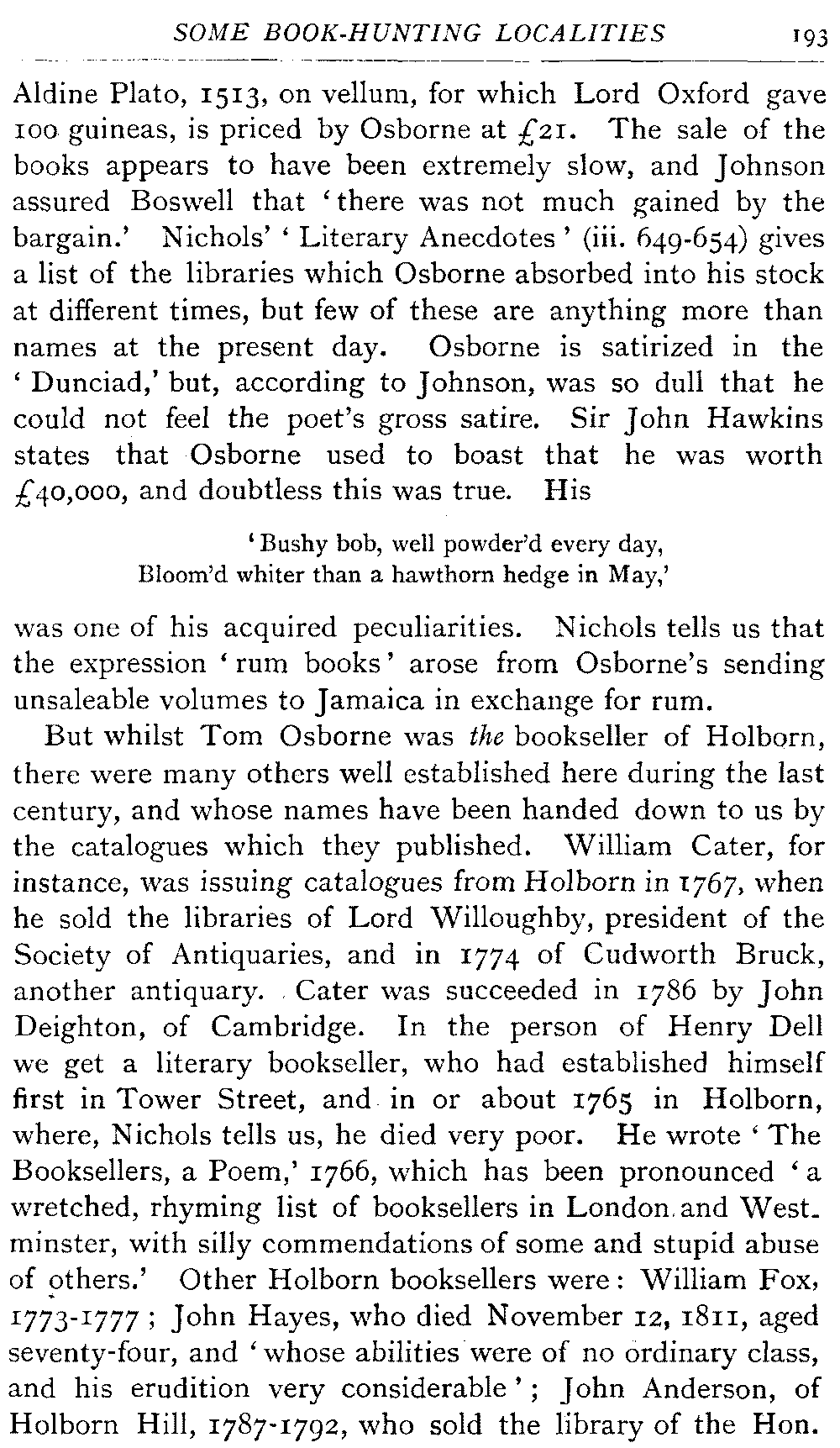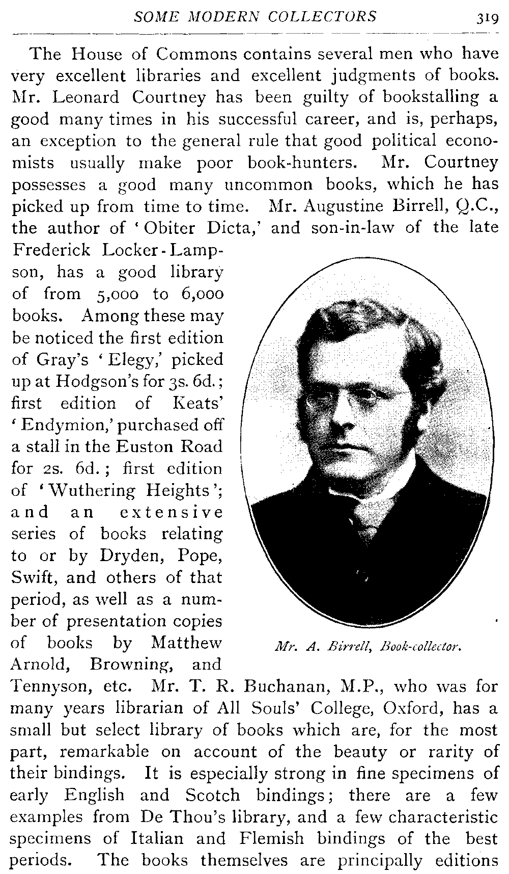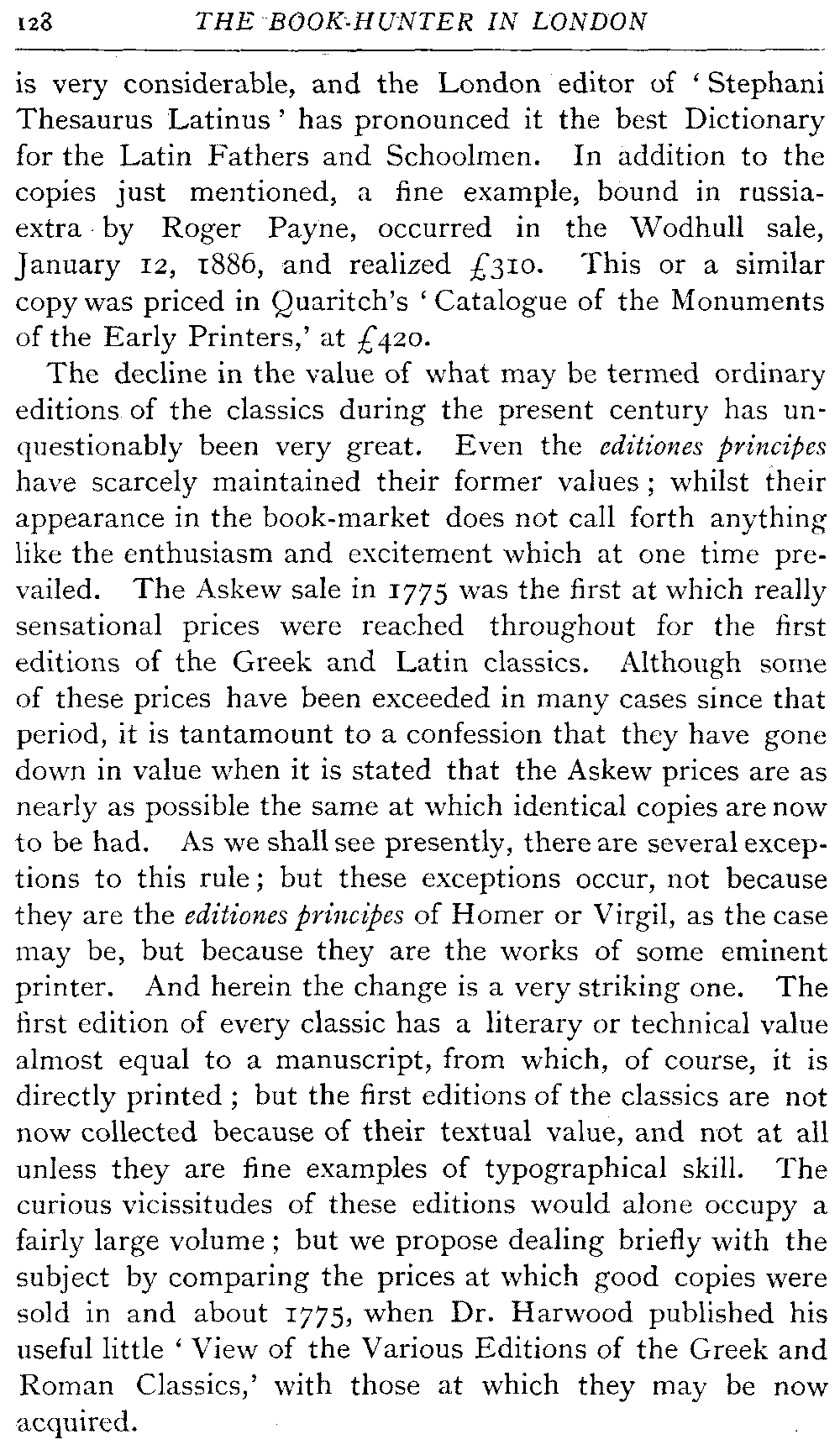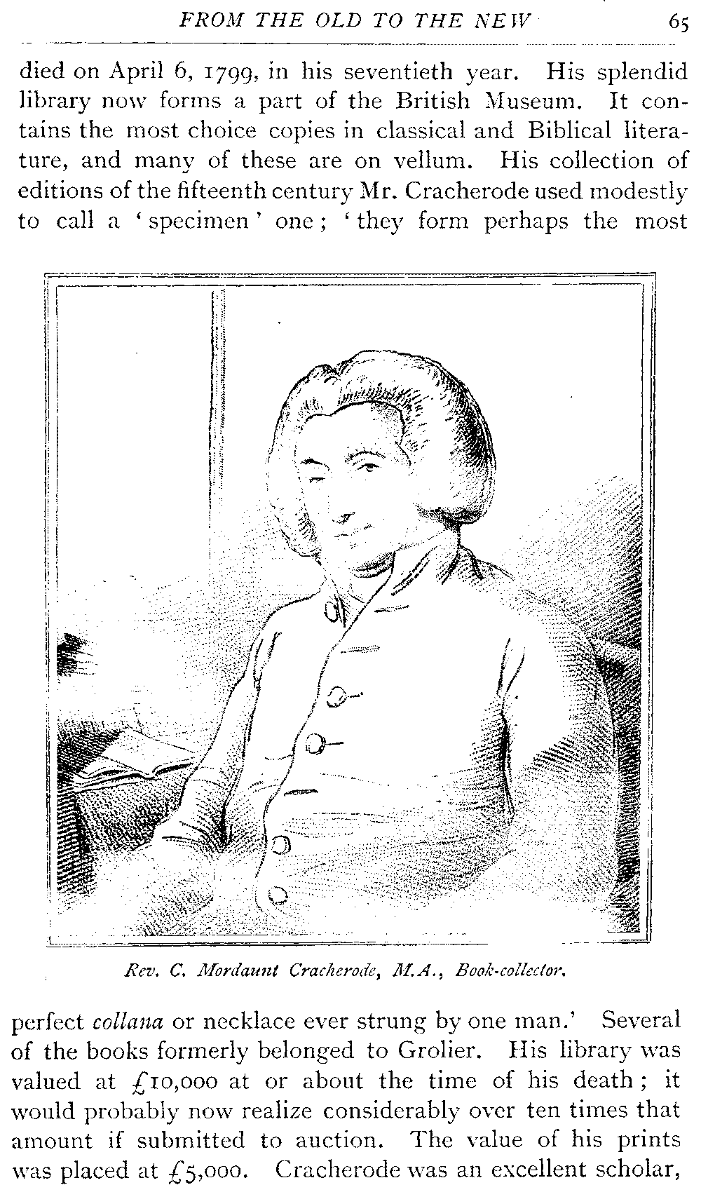 The contempt with which Dr. G. received the bookseller's proposal is peculiarly typical of the book-collector. If he cannot obtain what he wants just exactly when he wants it, he does not care about it. The book-collector is doubtless too prone to despise everything which is not quite in his line, forgetting that all branches of literature contribute in some degree, greater or lesser, to the bulk of human knowledge. No man can be universal, even if he had the wealth of a dozen Rothschilds, or the mental vigour and versatility of a hundred Gladstones.