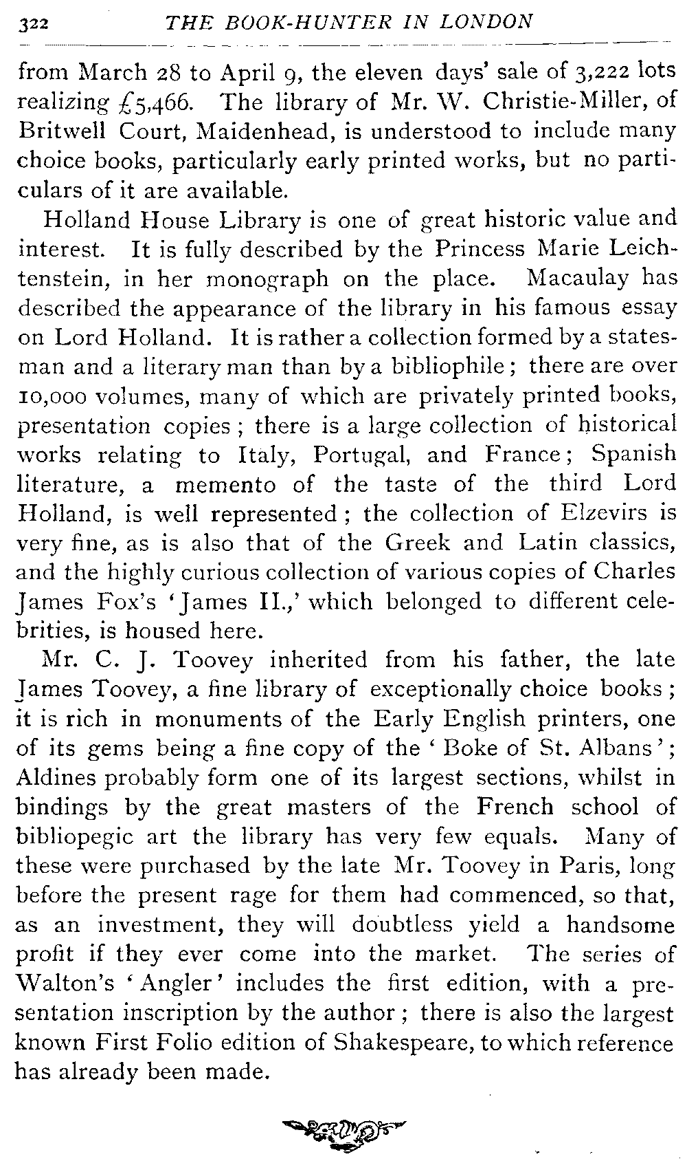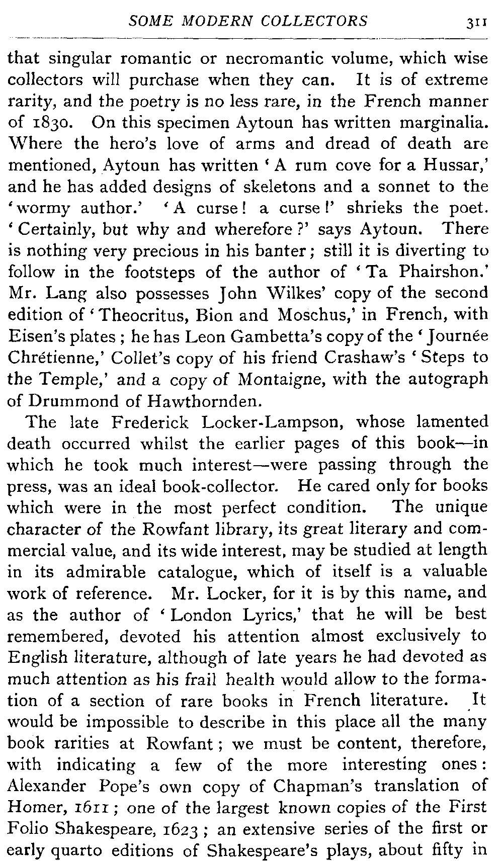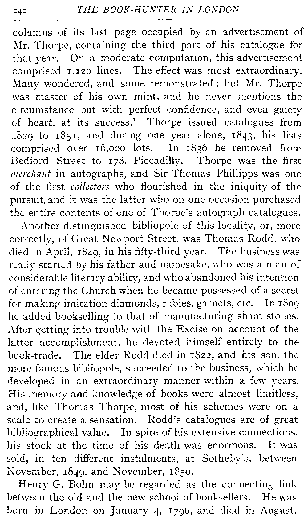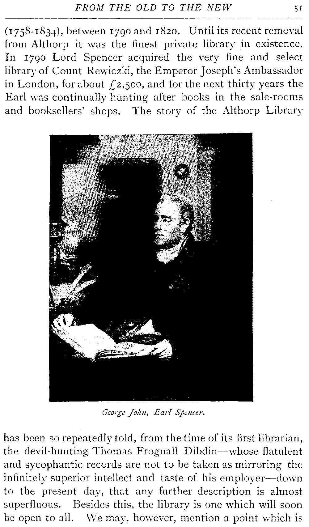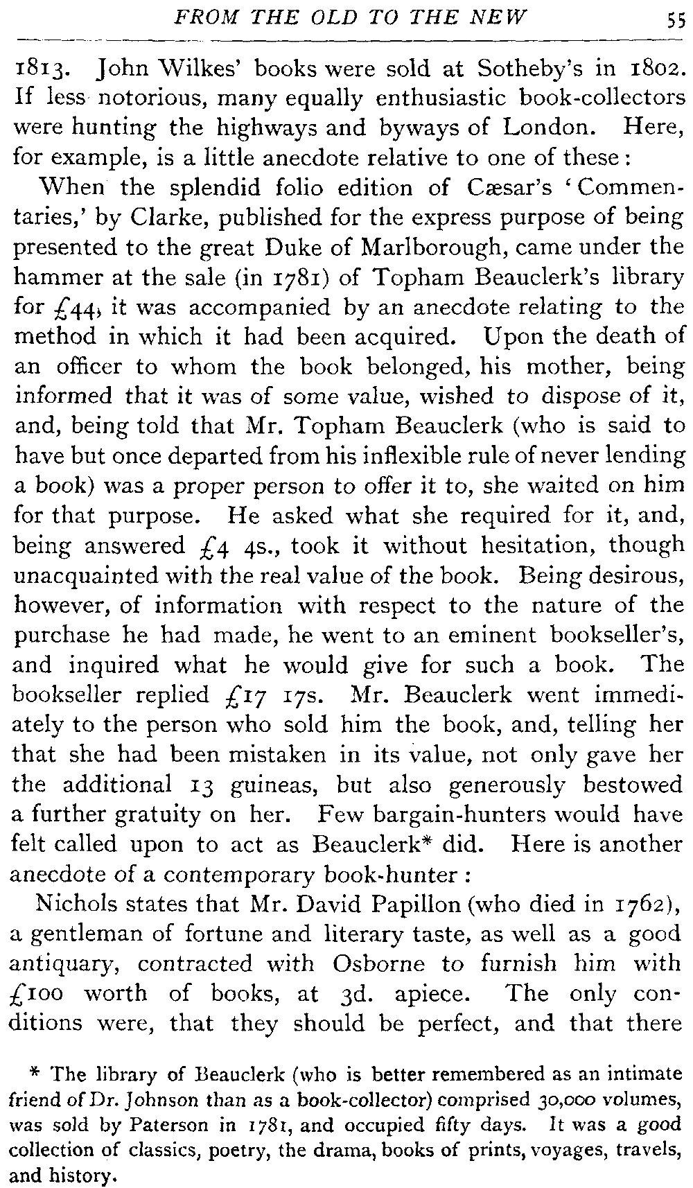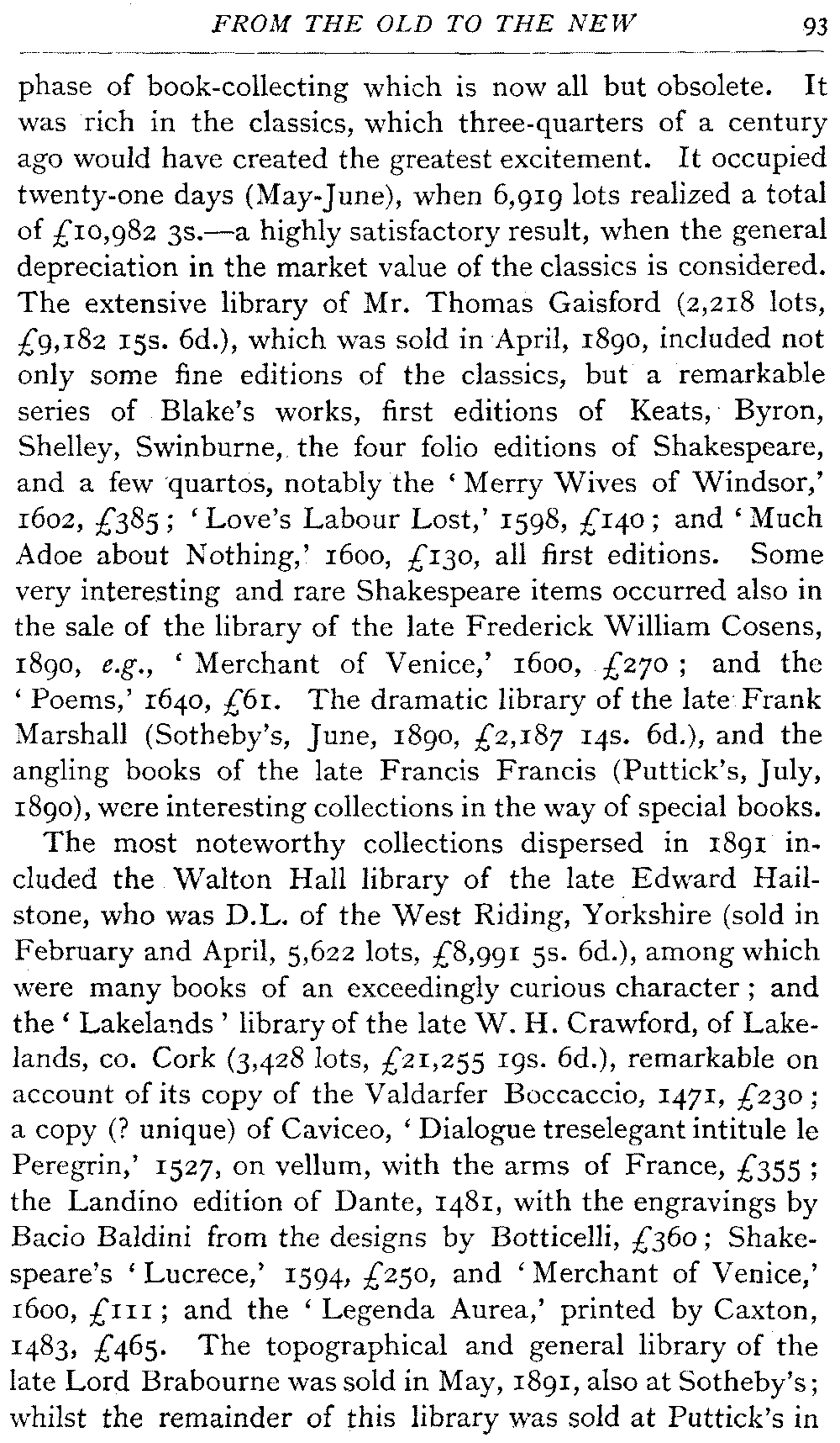 The contempt with which Dr. G. received the bookseller's proposal is peculiarly typical of the book-collector. If he cannot obtain what he wants just exactly when he wants it, he does not care about it. The book-collector is doubtless too prone to despise everything which is not quite in his line, forgetting that all branches of literature contribute in some degree, greater or lesser, to the bulk of human knowledge. No man can be universal, even if he had the wealth of a dozen Rothschilds, or the mental vigour and versatility of a hundred Gladstones.