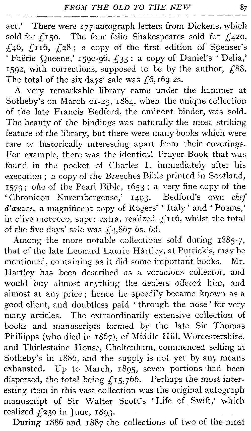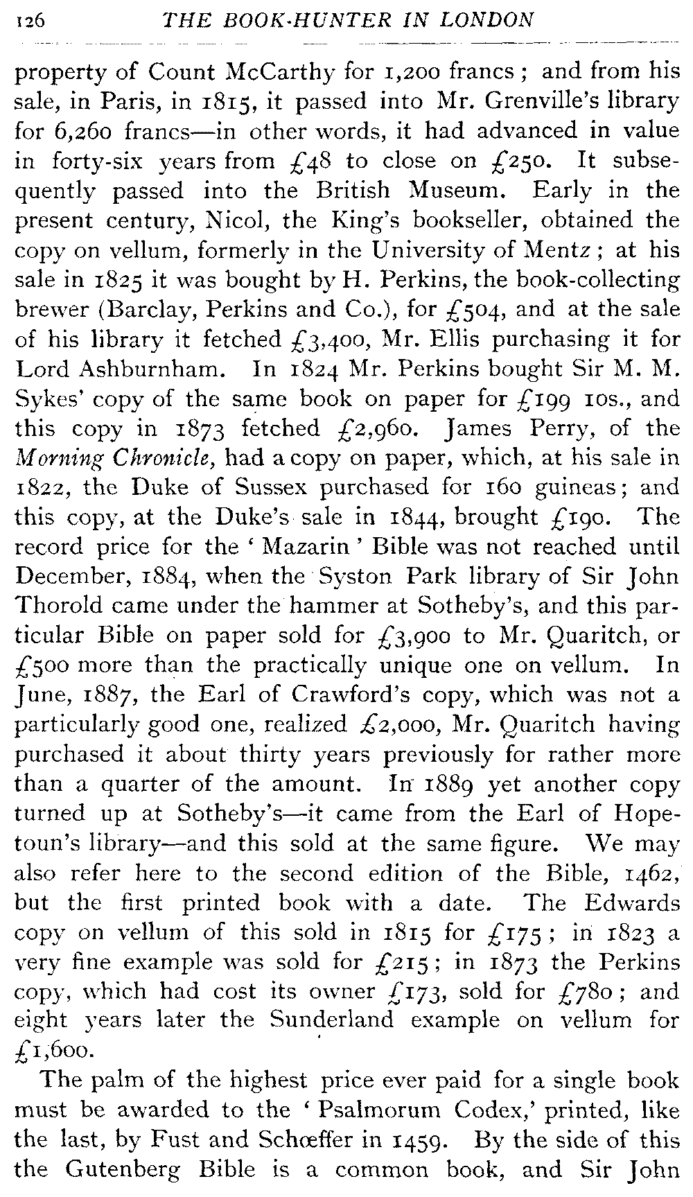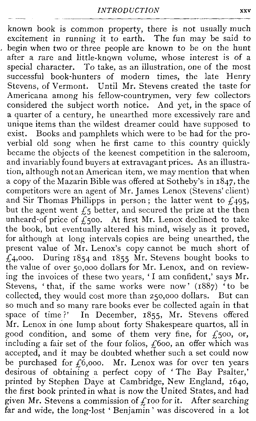 The subject of book-finds is one about which a volume might be written. Every 'special' collector has his fund of book-hunting anecdotes and incidents, for, where the rarity of a well-known [xxv]book is common property, there is not usually much excitement in running it to earth. The fun may be said to begin when two or three people are known to be on the hunt after a rare and little-known volume, whose interest is of a special character. To take, as an illustration, one of the most successful book-hunters of modern times, the late Henry Stevens, of Vermont. Until Mr. Stevens created the taste for Americana among his fellow-countrymen, very few collectors considered the subject worth notice. And yet, in the space of a quarter of a century, he unearthed more excessively rare and unique items than the wildest dreamer could have supposed to exist. Books and pamphlets which were to be had for the proverbial old song when he first came to this country quickly became the objects of the keenest competition in the saleroom, and invariably found buyers at extravagant prices. As an illustration, although not an American item, we may mention that when a copy of the Mazarin Bible was offered at Sotheby's in 1847, the competitors were an agent of Mr. James Lenox (Stevens' client) and Sir Thomas Phillipps in person; the latter went to £495, but the agent went £5 better, and secured the prize at the then unheard-of price of £500. At first Mr. Lenox declined to take the book, but eventually altered his mind, wisely as it proved, for although at long intervals copies are being unearthed, the present value of Mr. Lenox's copy cannot be much short of £4,000. During 1854 and 1855 Mr. Stevens bought books to the value of over 50,000 dollars for Mr. Lenox, and on reviewing the invoices of these two years, 'I am confident,' says Mr. Stevens, 'that, if the same works were now' (1887) 'to be collected, they would cost more than 250,000 dollars. But can so much and so many rare books ever be collected again in that space of time?' In December, 1855, Mr. Stevens offered Mr. Lenox in one lump about forty Shakespeare quartos, all in good condition, and some of them very fine, for £500, or, including a fair set of the four folios, £600, an offer which was accepted, and it may be doubted whether such a set could now be purchased for £6,000. Mr. Lenox was for over ten years desirous of obtaining a perfect copy of 'The Bay Psalter,' printed by Stephen Daye at Cambridge, New England, 1640, the first book printed in what is now the United States, and had given Mr. Stevens a commission of £100 for it. After searching far and wide, the long-lost 'Benjamin' was discovered in a lot [xxvi]at the sale of Pickering's stock at Sotheby's in 1855. 'A cold-blooded coolness seized me, and advancing towards the table behind Mr. Lilly, I quietly bid, in a perfectly neutral tone, "Sixpence"; and so the bids went on, increasing by sixpences, until half a crown was reached and Mr. Lilly had loosened the string. Taking up this very volume, he turned to me and remarked, "This looks a rare edition, Mr. Stevens; don't you think so? I do not remember having seen it before," and raised the bid to 5s. I replied that I had little doubt of its rarity, though comparatively a late edition of the Psalms, and at the same time gave Mr. Wilkinson a sixpenny nod. Thenceforward a "spirited competition" arose between Mr. Lilly and myself, until finally the lot was knocked down to Stevens for 19s.' The volume had cost the late Mr. Pickering 3s. It became Mr. Lenox's property for £80. Twenty-three years later another copy was bought by Mr. Cornelius Vanderbilt for 1,200 dollars.