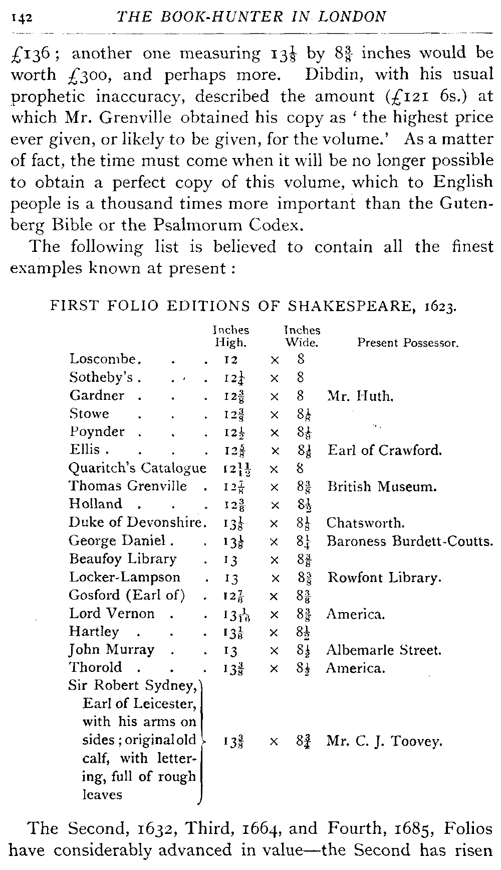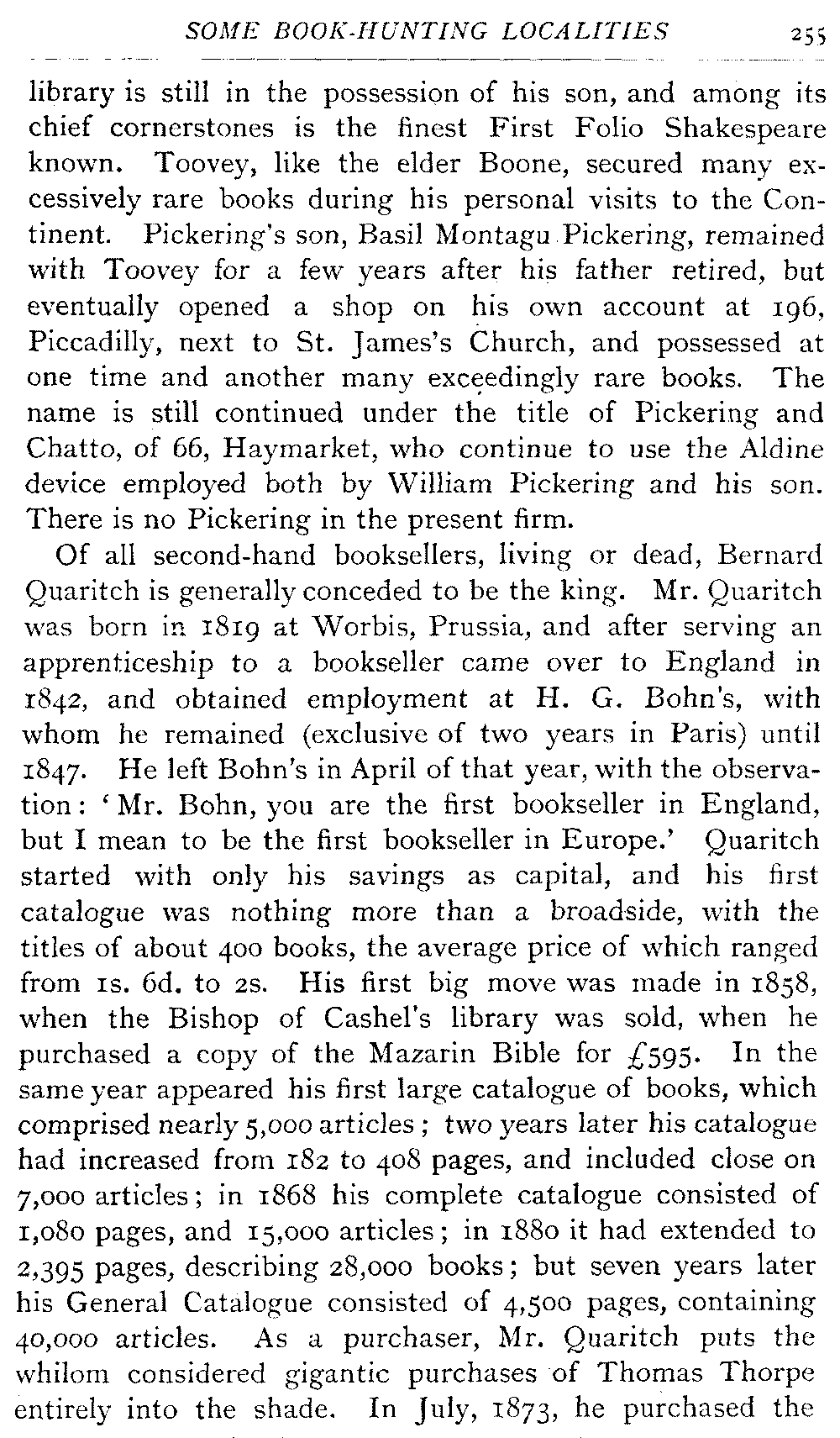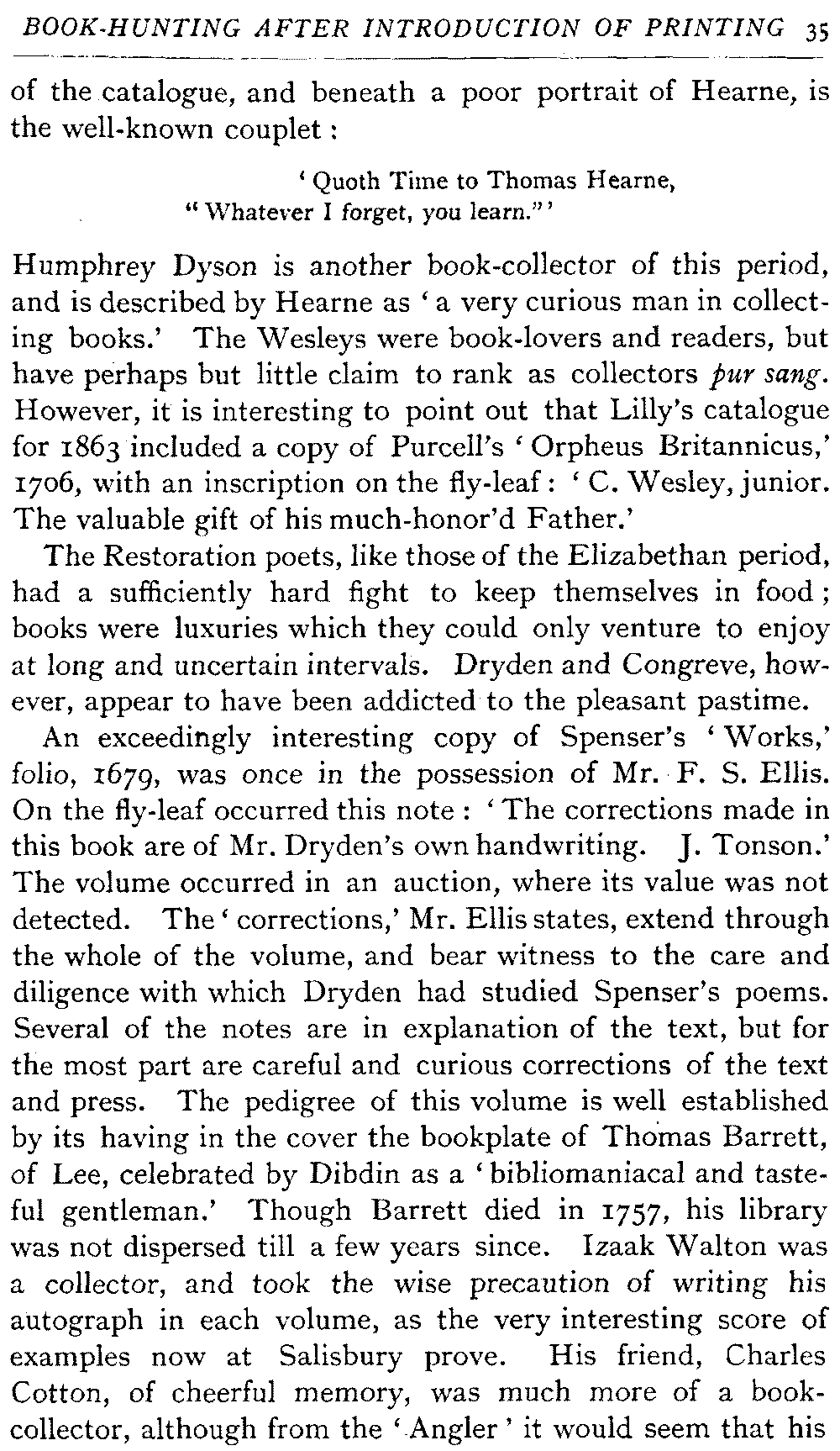 The subject of book-finds is one about which a volume might be written. Every 'special' collector has his fund of book-hunting anecdotes and incidents, for, where the rarity of a well-known [xxv]book is common property, there is not usually much excitement in running it to earth. The fun may be said to begin when two or three people are known to be on the hunt after a rare and little-known volume, whose interest is of a special character. To take, as an illustration, one of the most successful book-hunters of modern times, the late Henry Stevens, of Vermont. Until Mr. Stevens created the taste for Americana among his fellow-countrymen, very few collectors considered the subject worth notice. And yet, in the space of a quarter of a century, he unearthed more excessively rare and unique items than the wildest dreamer could have supposed to exist. Books and pamphlets which were to be had for the proverbial old song when he first came to this country quickly became the objects of the keenest competition in the saleroom, and invariably found buyers at extravagant prices. As an illustration, although not an American item, we may mention that when a copy of the Mazarin Bible was offered at Sotheby's in 1847, the competitors were an agent of Mr. James Lenox (Stevens' client) and Sir Thomas Phillipps in person; the latter went to £495, but the agent went £5 better, and secured the prize at the then unheard-of price of £500. At first Mr. Lenox declined to take the book, but eventually altered his mind, wisely as it proved, for although at long intervals copies are being unearthed, the present value of Mr. Lenox's copy cannot be much short of £4,000. During 1854 and 1855 Mr. Stevens bought books to the value of over 50,000 dollars for Mr. Lenox, and on reviewing the invoices of these two years, 'I am confident,' says Mr. Stevens, 'that, if the same works were now' (1887) 'to be collected, they would cost more than 250,000 dollars. But can so much and so many rare books ever be collected again in that space of time?' In December, 1855, Mr. Stevens offered Mr. Lenox in one lump about forty Shakespeare quartos, all in good condition, and some of them very fine, for £500, or, including a fair set of the four folios, £600, an offer which was accepted, and it may be doubted whether such a set could now be purchased for £6,000. Mr. Lenox was for over ten years desirous of obtaining a perfect copy of 'The Bay Psalter,' printed by Stephen Daye at Cambridge, New England, 1640, the first book printed in what is now the United States, and had given Mr. Stevens a commission of £100 for it. After searching far and wide, the long-lost 'Benjamin' was discovered in a lot [xxvi]at the sale of Pickering's stock at Sotheby's in 1855. 'A cold-blooded coolness seized me, and advancing towards the table behind Mr. Lilly, I quietly bid, in a perfectly neutral tone, "Sixpence"; and so the bids went on, increasing by sixpences, until half a crown was reached and Mr. Lilly had loosened the string. Taking up this very volume, he turned to me and remarked, "This looks a rare edition, Mr. Stevens; don't you think so? I do not remember having seen it before," and raised the bid to 5s. I replied that I had little doubt of its rarity, though comparatively a late edition of the Psalms, and at the same time gave Mr. Wilkinson a sixpenny nod. Thenceforward a "spirited competition" arose between Mr. Lilly and myself, until finally the lot was knocked down to Stevens for 19s.' The volume had cost the late Mr. Pickering 3s. It became Mr. Lenox's property for £80. Twenty-three years later another copy was bought by Mr. Cornelius Vanderbilt for 1,200 dollars.