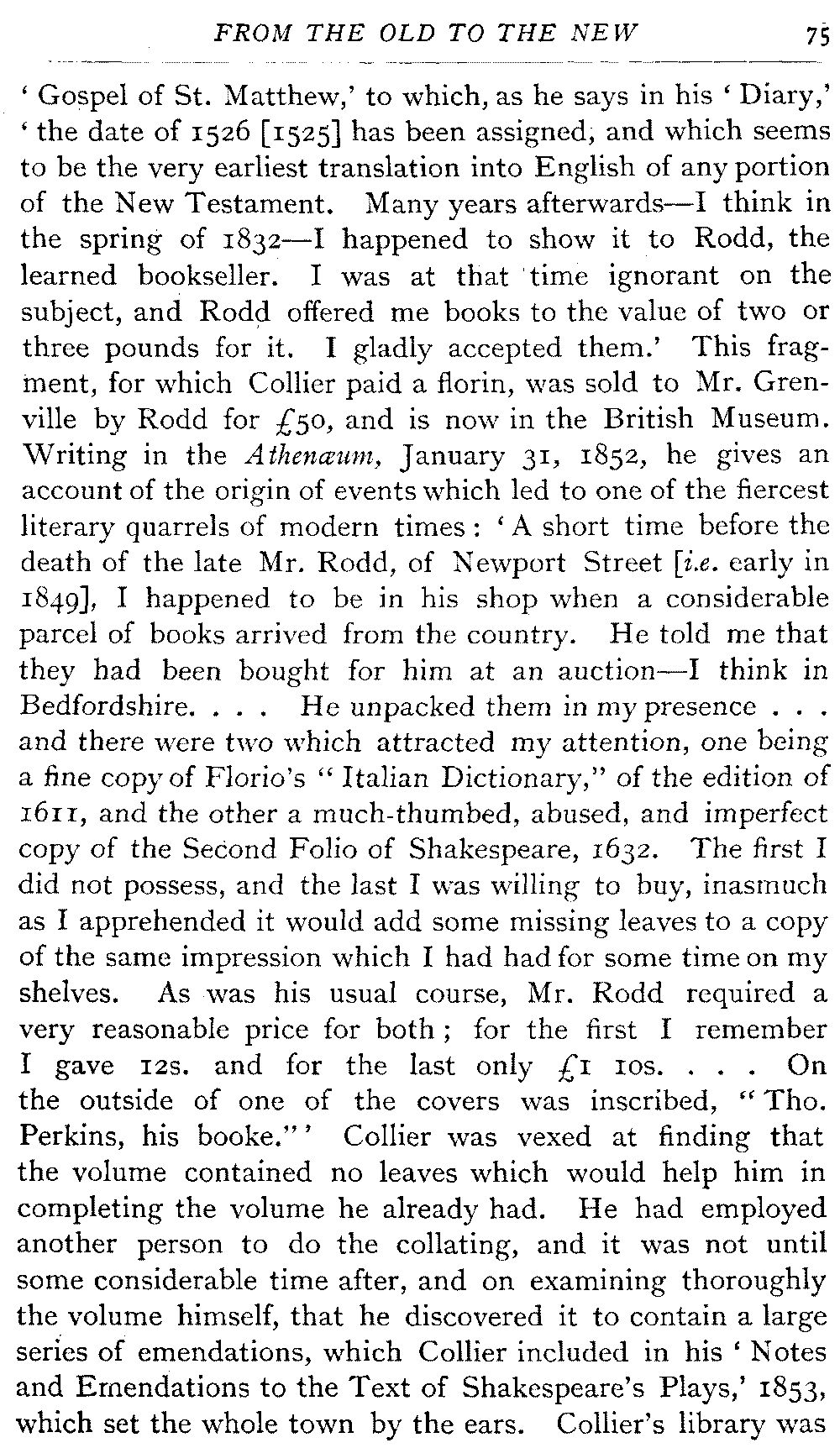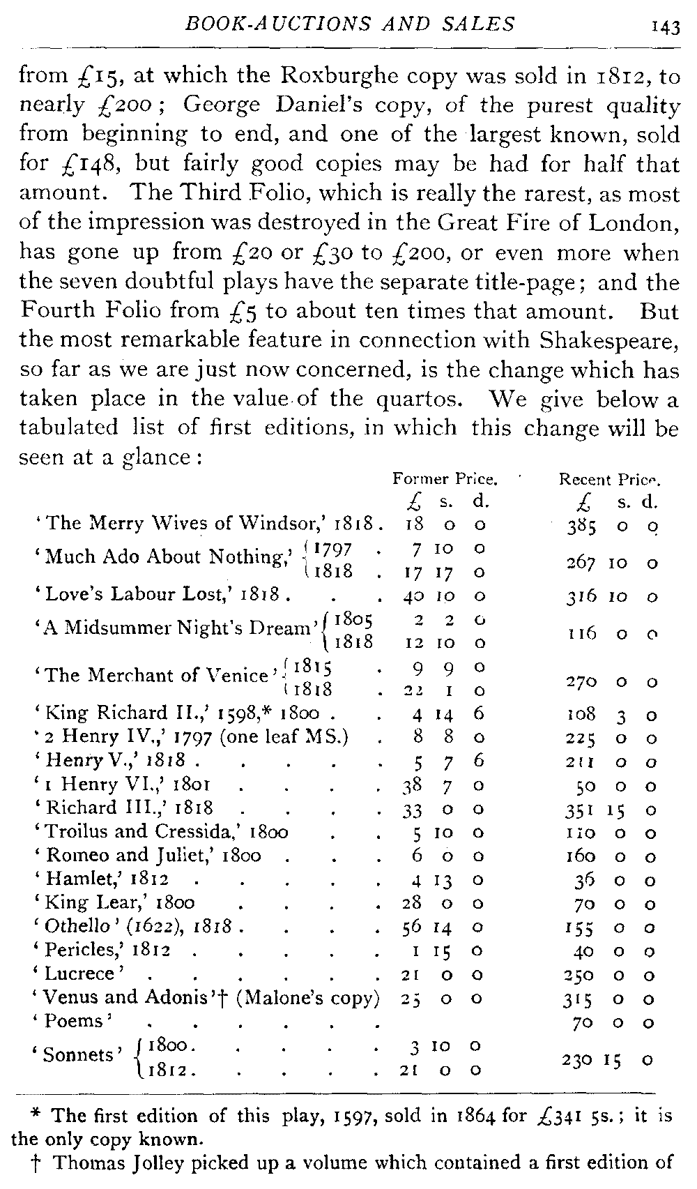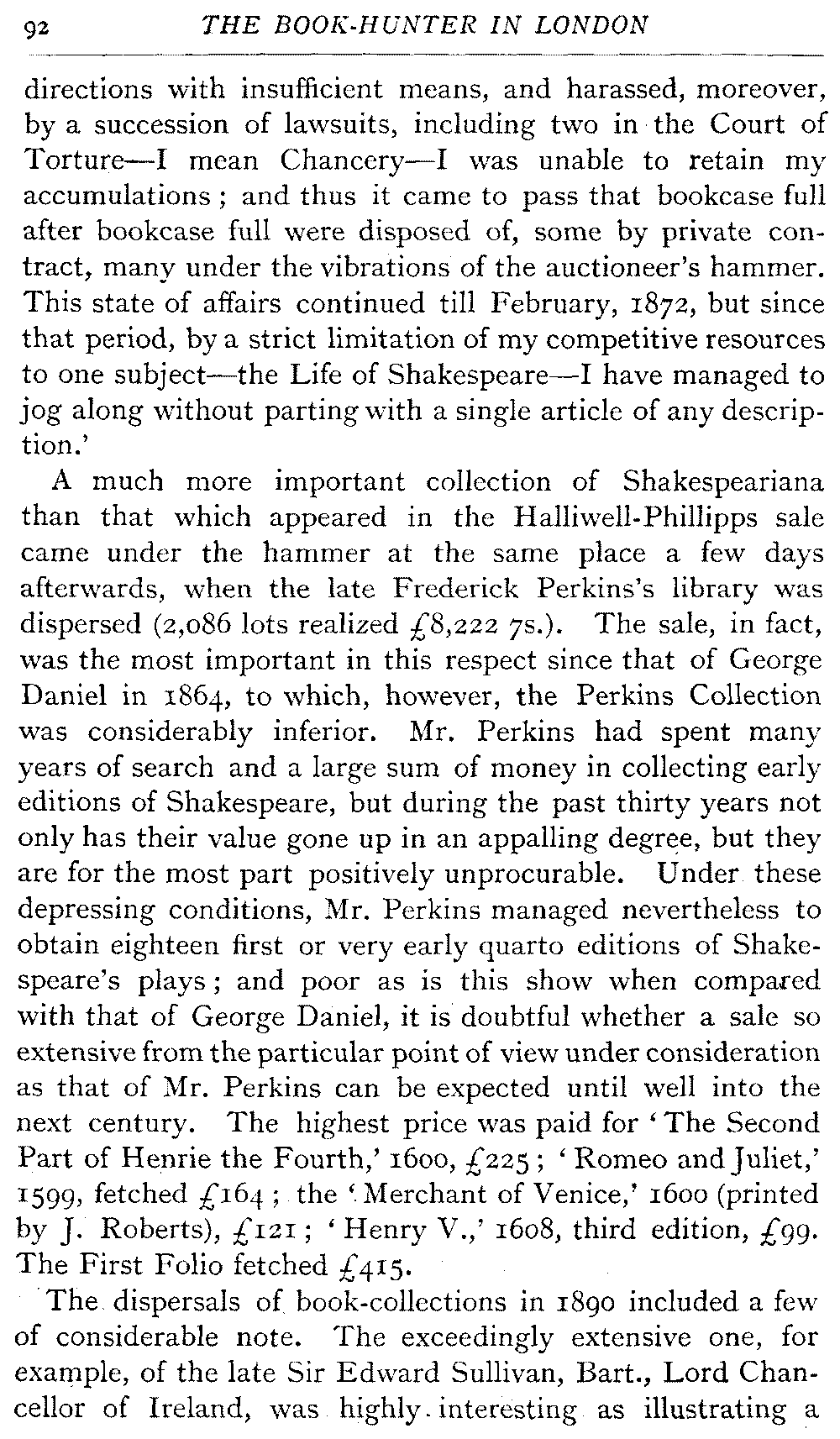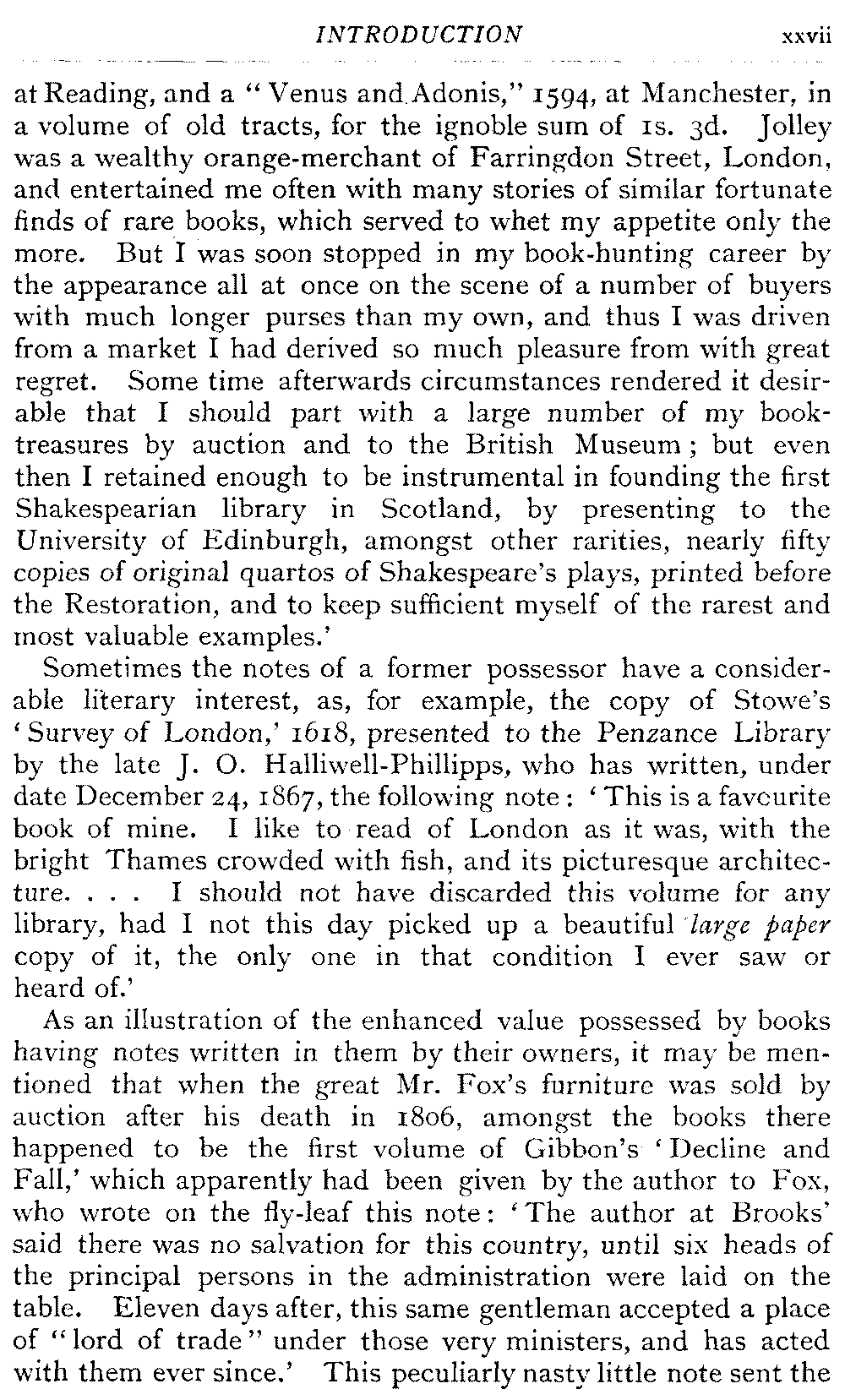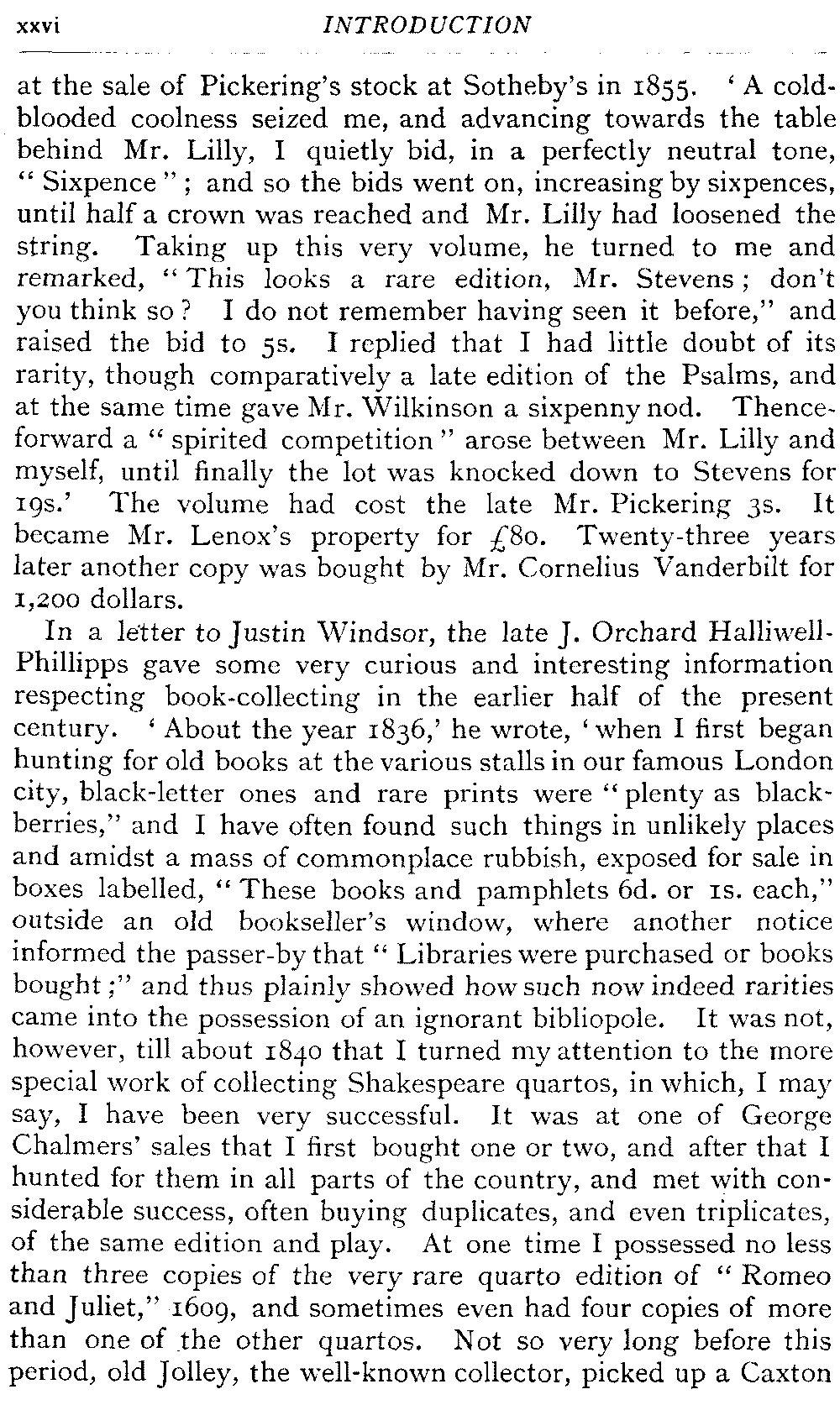In a letter to Justin Windsor, the late J. Orchard Halliwell-Phillipps gave some very curious and interesting information respecting book-collecting in the earlier half of the present century. 'About the year 1836,' he wrote, 'when I first began hunting for old books at the various stalls in our famous London city, black-letter ones and rare prints were "plenty as blackberries," and I have often found such things in unlikely places and amidst a mass of commonplace rubbish, exposed for sale in boxes labelled, "These books and pamphlets 6d. or 1s. each," outside an old bookseller's window, where another notice informed the passer-by that "Libraries were purchased or books bought;" and thus plainly showed how such now indeed rarities came into the possession of an ignorant bibliopole. It was not, however, till about 1840 that I turned my attention to the more special work of collecting Shakespeare quartos, in which, I may say, I have been very successful. It was at one of George Chalmers' sales that I first bought one or two, and after that I hunted for them in all parts of the country, and met with considerable success, often buying duplicates, and even triplicates, of the same edition and play. At one time I possessed no less than three copies of the very rare quarto edition of "Romeo and Juliet," 1609, and sometimes even had four copies of more than one of the other quartos. Not so very long before this period, old Jolley, the well-known collector, picked up a Caxton [xxvii]at Reading, and a "Venus and Adonis," 1594, at Manchester, in a volume of old tracts, for the ignoble sum of 1s. 3d. Jolley was a wealthy orange-merchant of Farringdon Street, London, and entertained me often with many stories of similar fortunate finds of rare books, which served to whet my appetite only the more. But I was soon stopped in my book-hunting career by the appearance all at once on the scene of a number of buyers with much longer purses than my own, and thus I was driven from a market I had derived so much pleasure from with great regret. Some time afterwards circumstances rendered it desirable that I should part with a large number of my book-treasures by auction and to the British Museum; but even then I retained enough to be instrumental in founding the first Shakespearian library in Scotland, by presenting to the University of Edinburgh, amongst other rarities, nearly fifty copies of original quartos of Shakespeare's plays, printed before the Restoration, and to keep sufficient myself of the rarest and most valuable examples.'