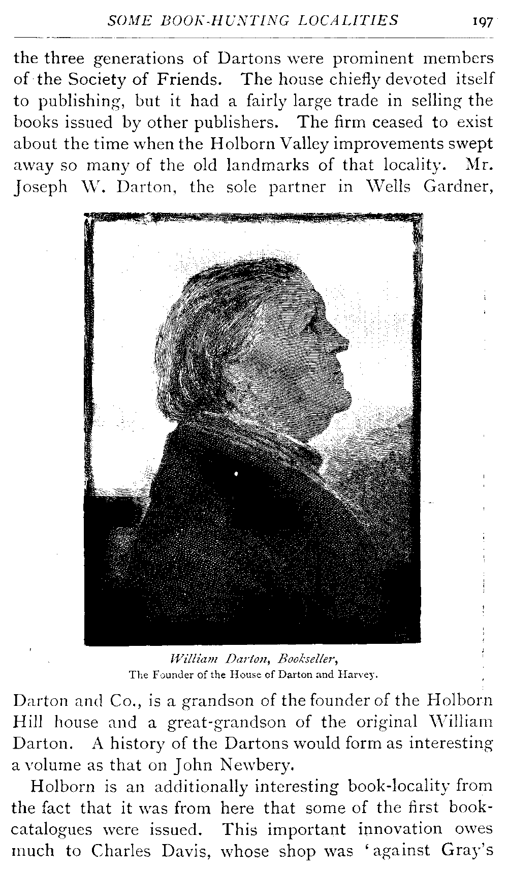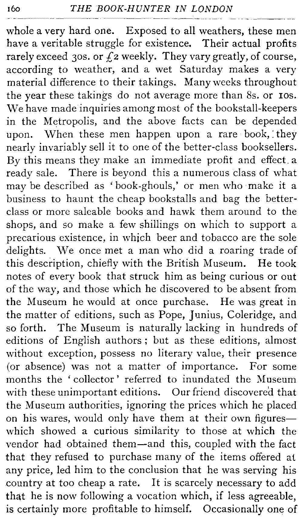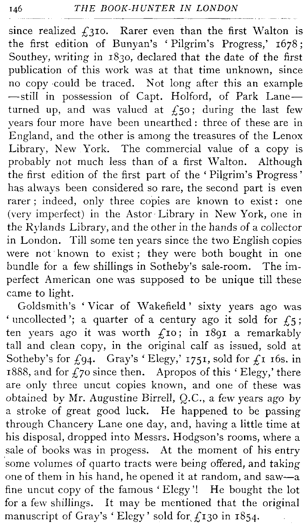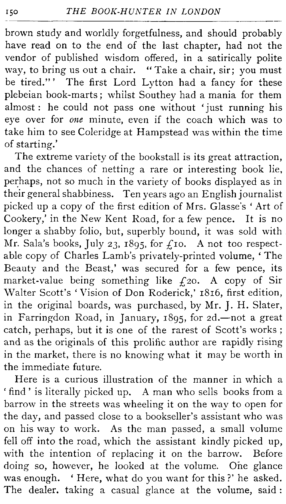 The book-hunter has, however, his good traits, which sometimes require a good deal of finding, it is true. We need not dwell at great length on his apparently unconquerable habit of beating down the prices, for the custom is too well known to require much explanation; but a view of the other side of the picture is only fair. A few years ago a well-known bookseller catalogued a copy of the 'Book of Job' at a very low figure. A wealthy collector, whose purchases were generally closed on the judgment of a distinguished bookman, asked to have the copy sent on approval. It was despatched; but came back within a few days. No explanation was volunteered: when, however, the collector came into the shop a short time after, he was asked why he had returned the book. His answer was to the effect that he could not persuade himself that the illustrations were really by Blake, particularly as the price asked was so low. A week or so after this a distinguished art-critic, hearing of the whereabouts of this copy, asked to have it on approval: in sending it the bookseller enclosed a note to the effect that some doubt had been expressed as to the genuineness of the plates. In a few days came a cheque from the man of art for £10 over and above the catalogue price, and a note to the effect that the illustrations were not only unquestionably by Blake, but in the finest possible state.