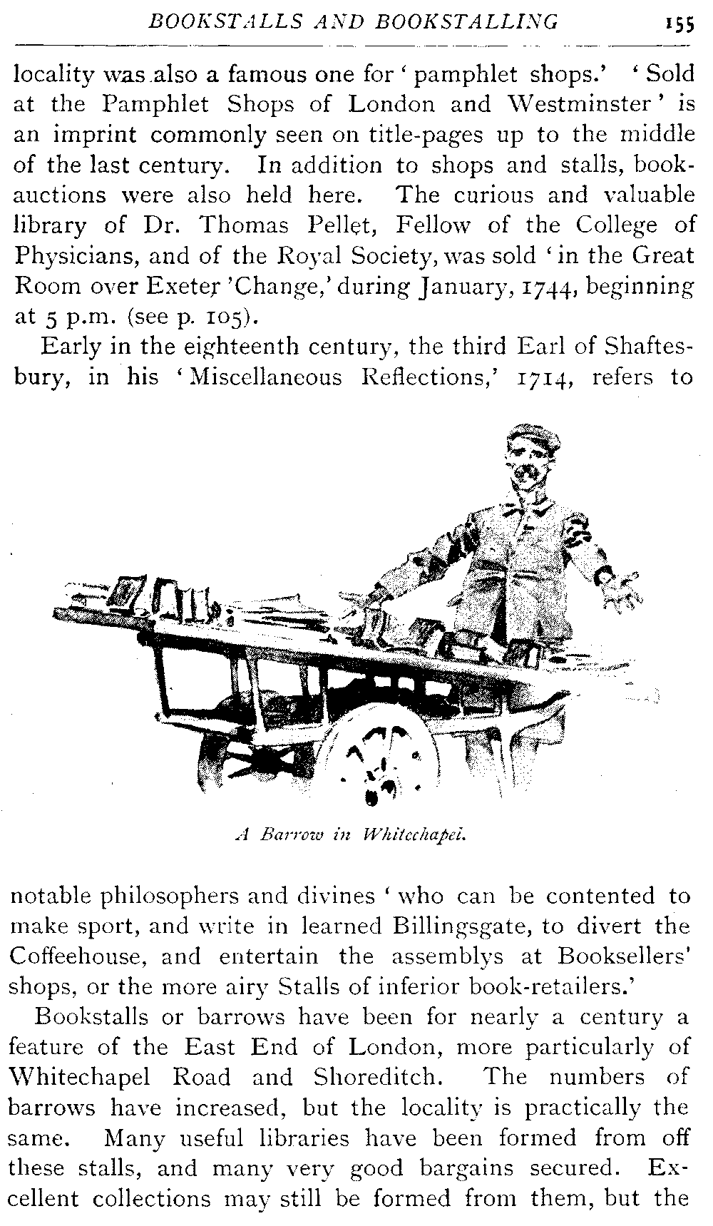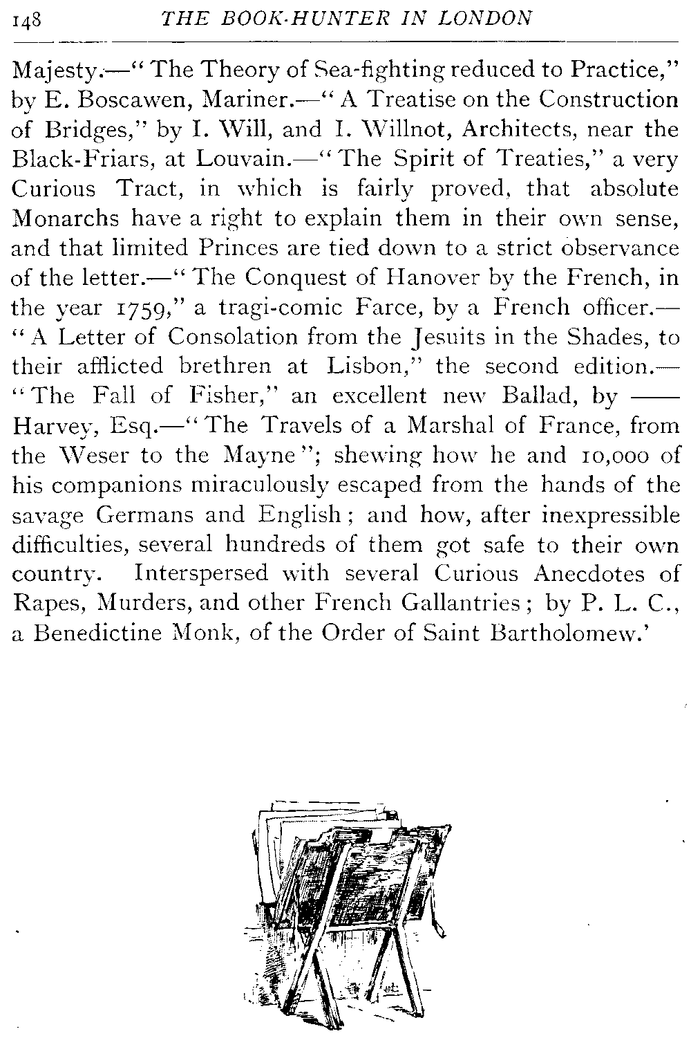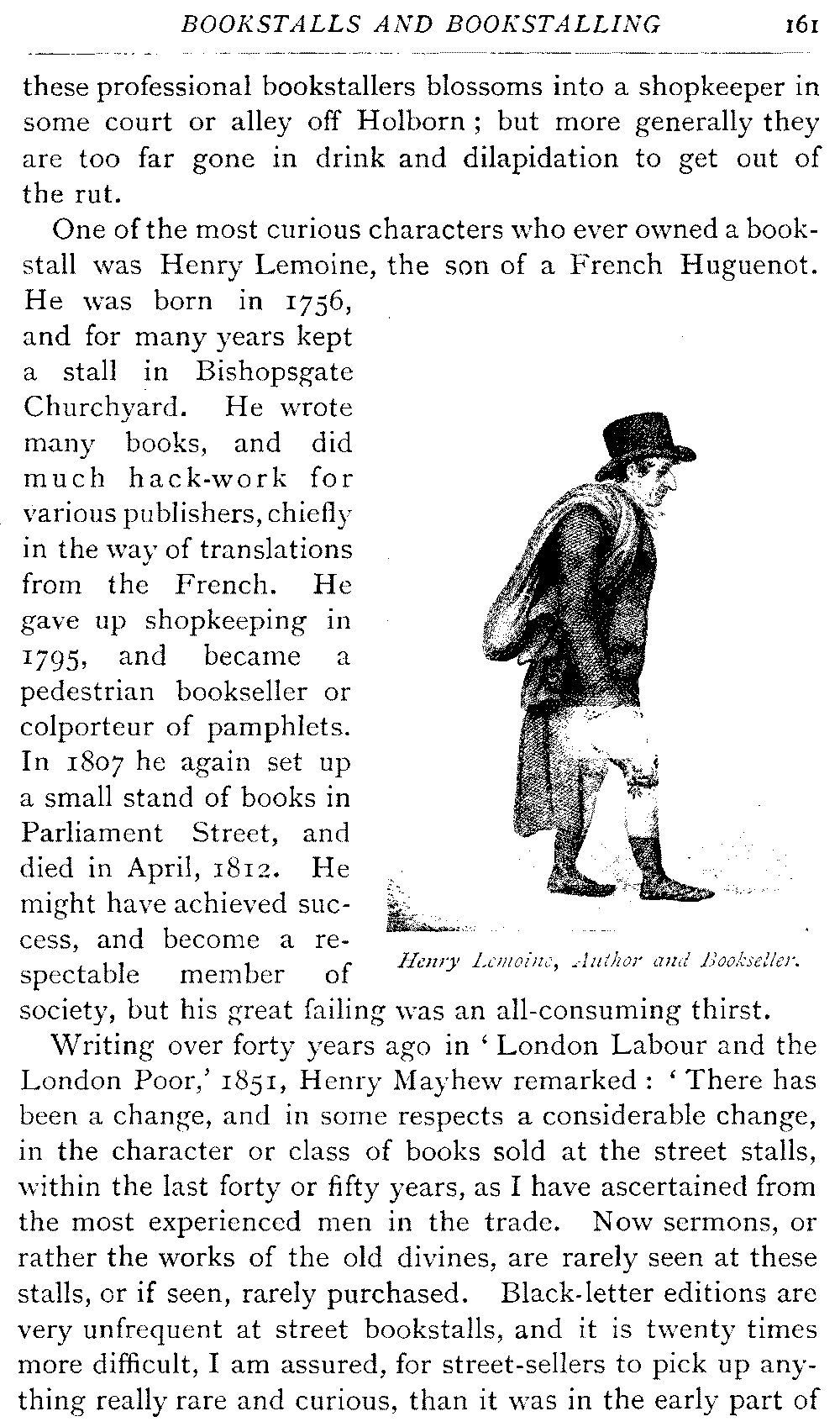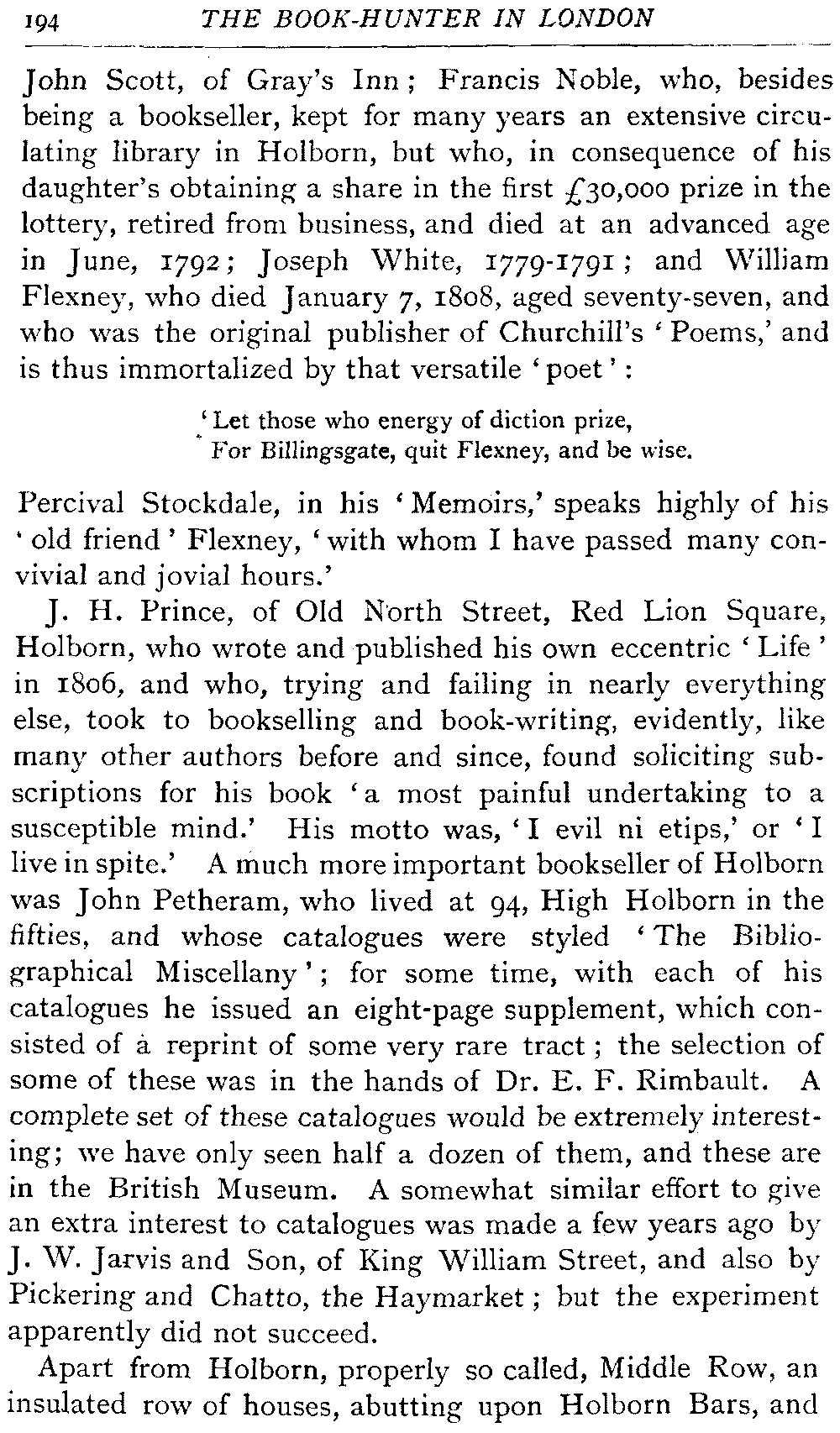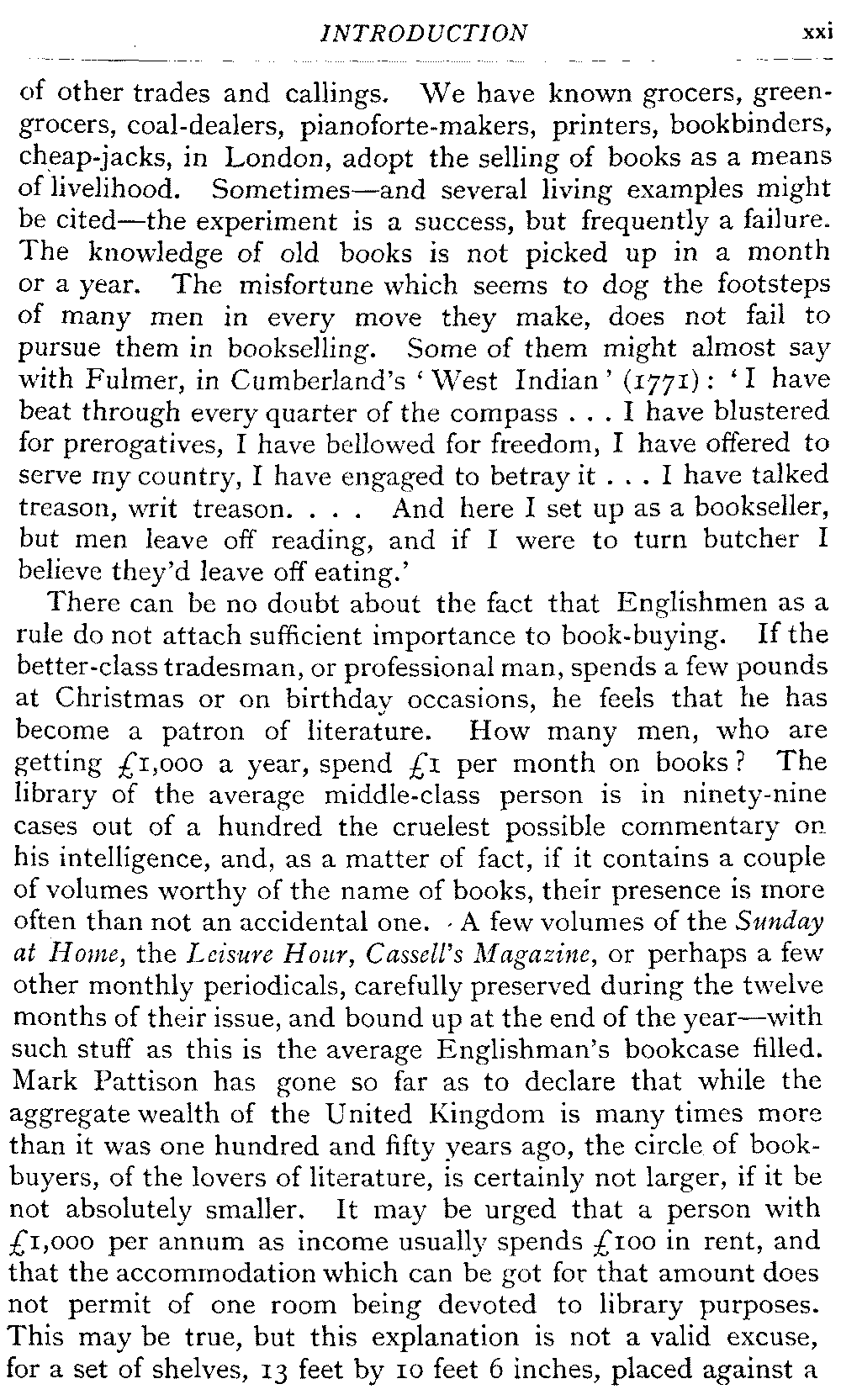 À propos of a literary man turning bookseller, the experiment has often been tried, but it has generally failed. Second-hand bookselling seems to be a frequent experiment after the failures [xxi]of other trades and callings. We have known grocers, greengrocers, coal-dealers, pianoforte-makers, printers, bookbinders, cheap-jacks, in London, adopt the selling of books as a means of livelihood. Sometimes—and several living examples might be cited—the experiment is a success, but frequently a failure. The knowledge of old books is not picked up in a month or a year. The misfortune which seems to dog the footsteps of many men in every move they make, does not fail to pursue them in bookselling. Some of them might almost say with Fulmer, in Cumberland's 'West Indian' (1771): 'I have beat through every quarter of the compass . . . I have blustered for prerogatives, I have bellowed for freedom, I have offered to serve my country, I have engaged to betray it . . . I have talked treason, writ treason. . . . And here I set up as a bookseller, but men leave off reading, and if I were to turn butcher I believe they'd leave off eating.'
