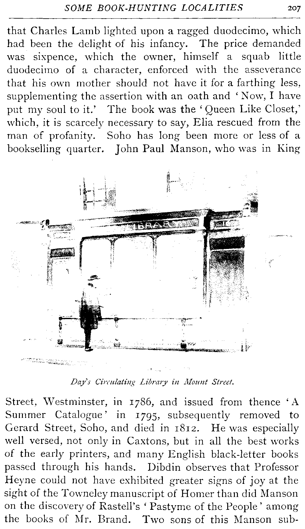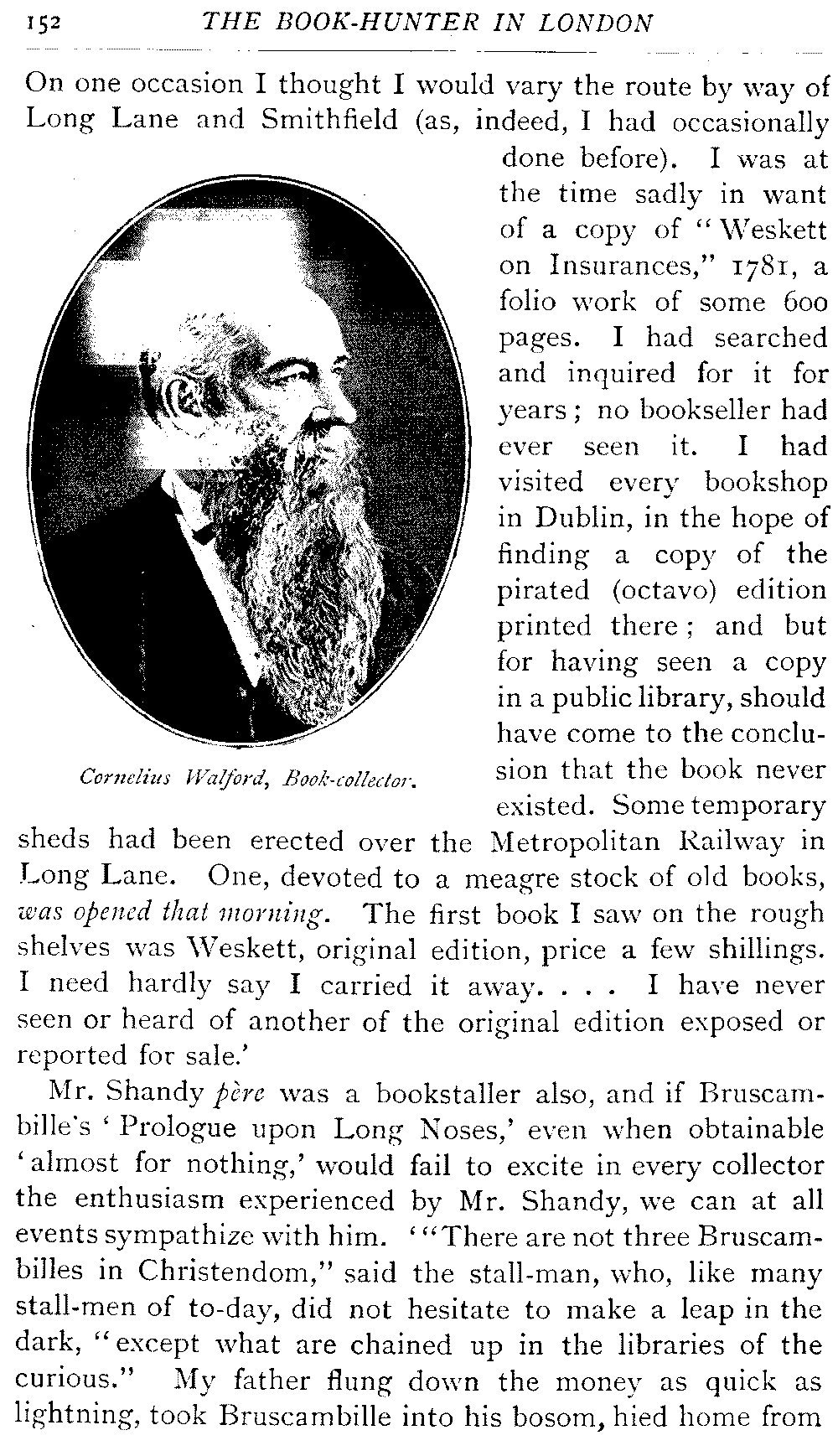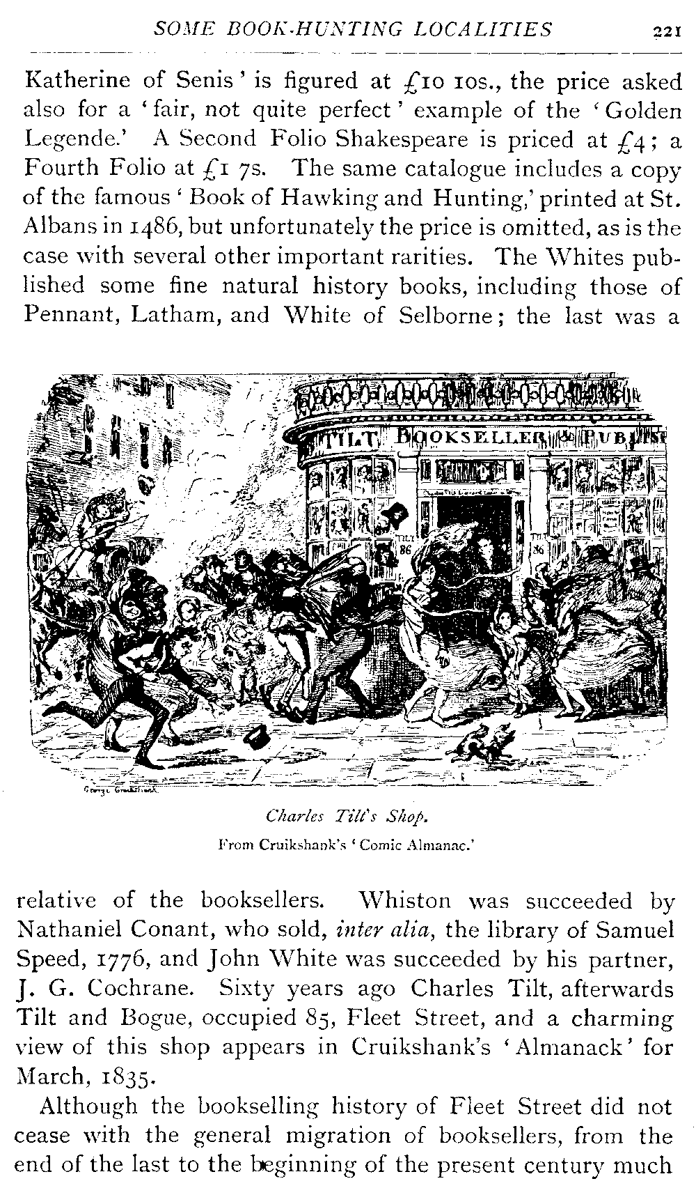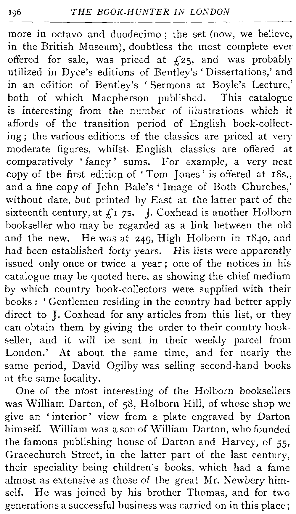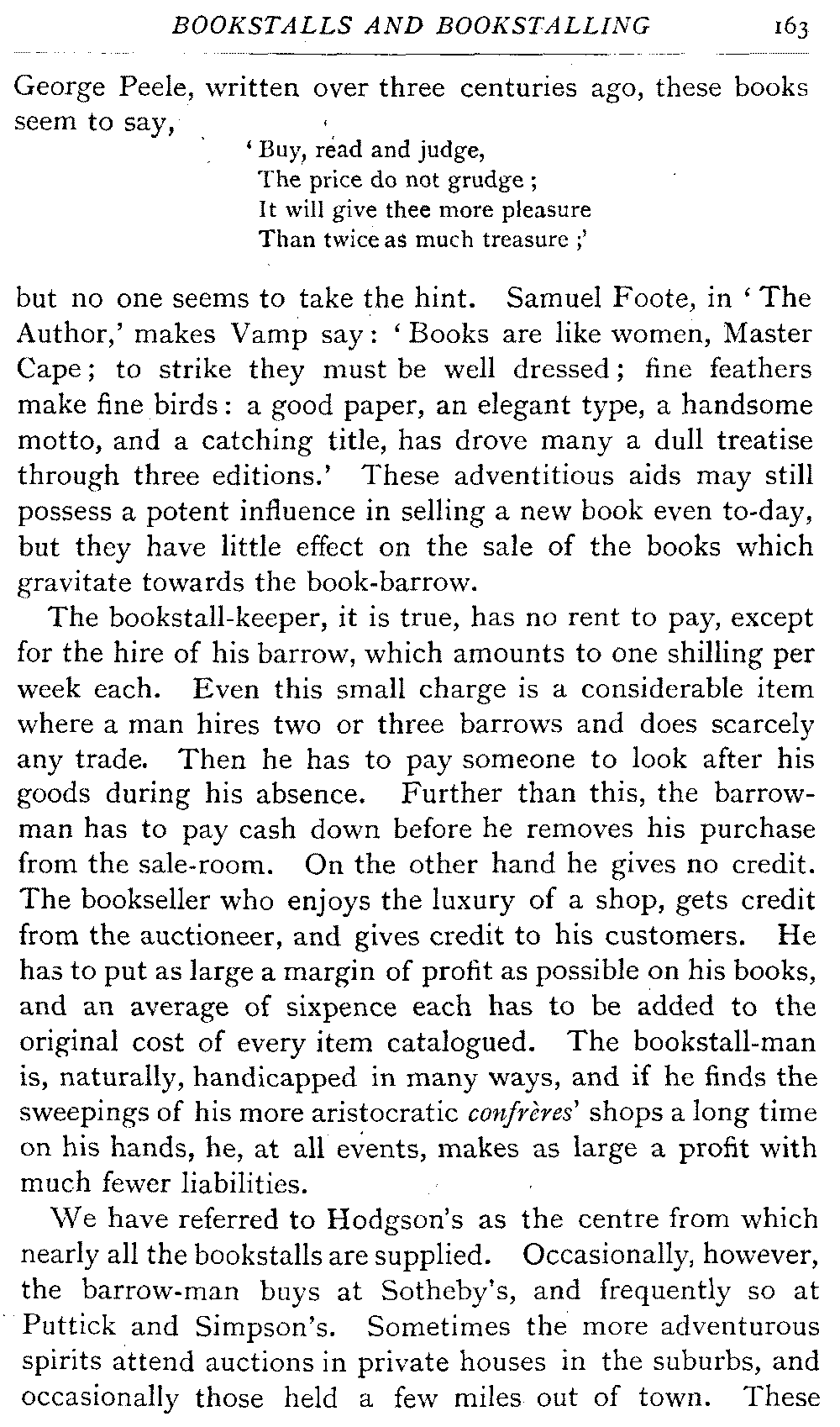 À propos of a literary man turning bookseller, the experiment has often been tried, but it has generally failed. Second-hand bookselling seems to be a frequent experiment after the failures [xxi]of other trades and callings. We have known grocers, greengrocers, coal-dealers, pianoforte-makers, printers, bookbinders, cheap-jacks, in London, adopt the selling of books as a means of livelihood. Sometimes—and several living examples might be cited—the experiment is a success, but frequently a failure. The knowledge of old books is not picked up in a month or a year. The misfortune which seems to dog the footsteps of many men in every move they make, does not fail to pursue them in bookselling. Some of them might almost say with Fulmer, in Cumberland's 'West Indian' (1771): 'I have beat through every quarter of the compass . . . I have blustered for prerogatives, I have bellowed for freedom, I have offered to serve my country, I have engaged to betray it . . . I have talked treason, writ treason. . . . And here I set up as a bookseller, but men leave off reading, and if I were to turn butcher I believe they'd leave off eating.'