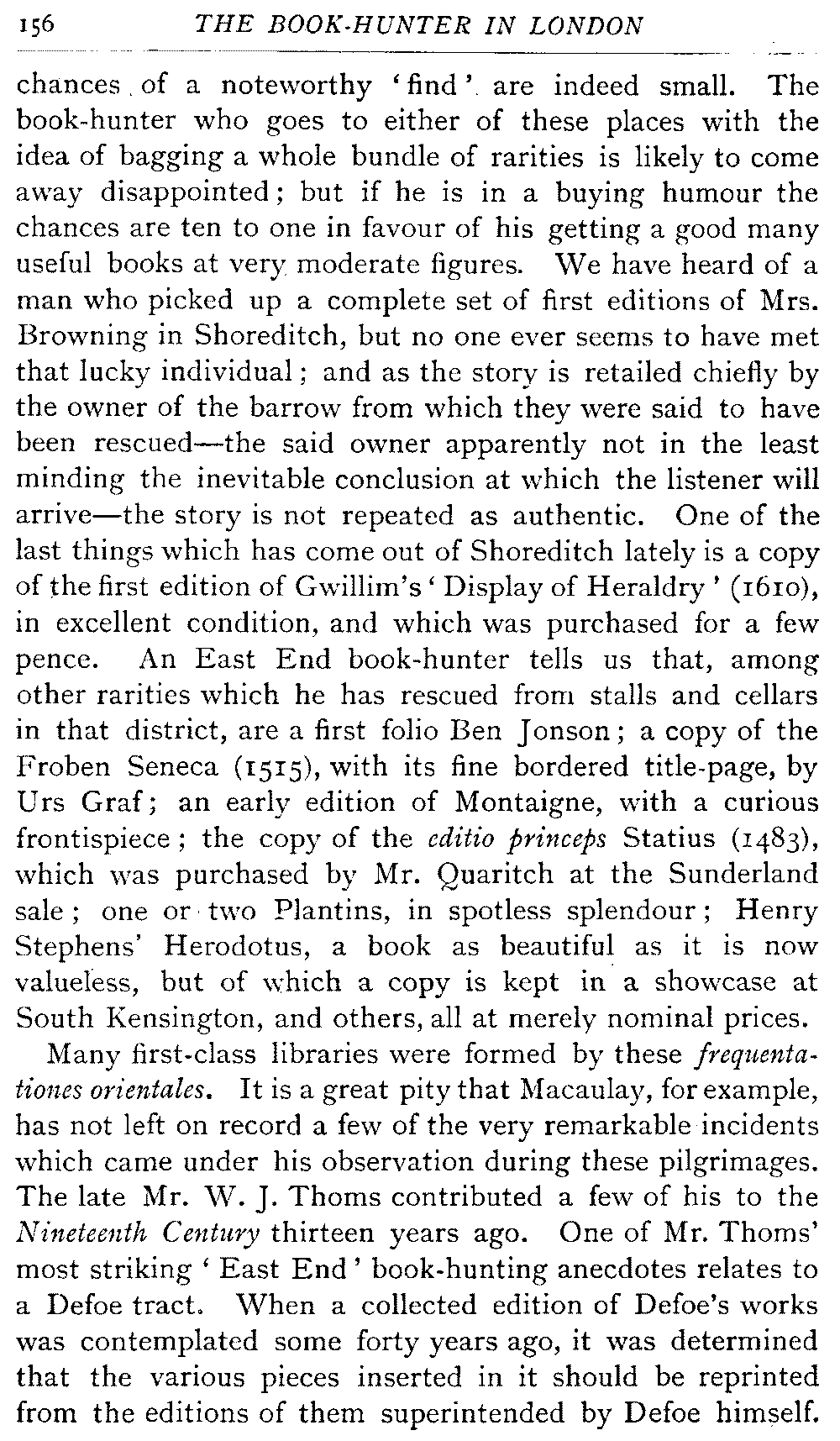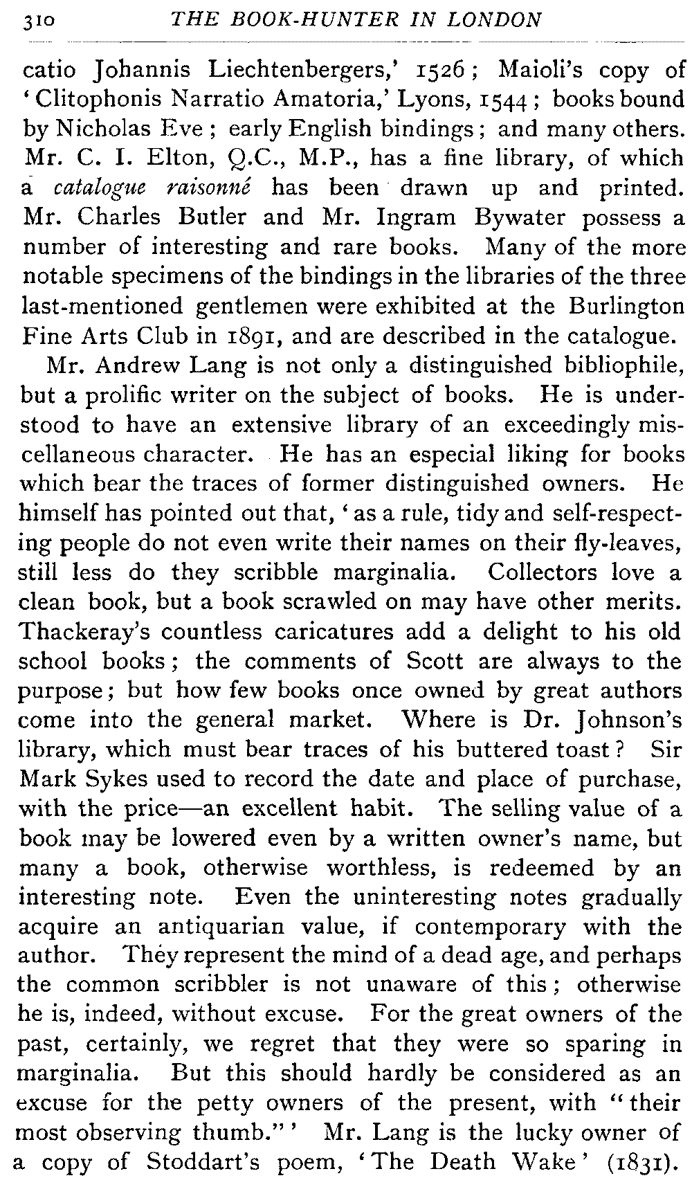 Sometimes the notes of a former possessor have a considerable literary interest, as, for example, the copy of Stowe's 'Survey of London,' 1618, presented to the Penzance Library by the late J. O. Halliwell-Phillipps, who has written, under date December 24, 1867, the following note: 'This is a favourite book of mine. I like to read of London as it was, with the bright Thames crowded with fish, and its picturesque architecture. . . . I should not have discarded this volume for any library, had I not this day picked up a beautiful large paper copy of it, the only one in that condition I ever saw or heard of.'
