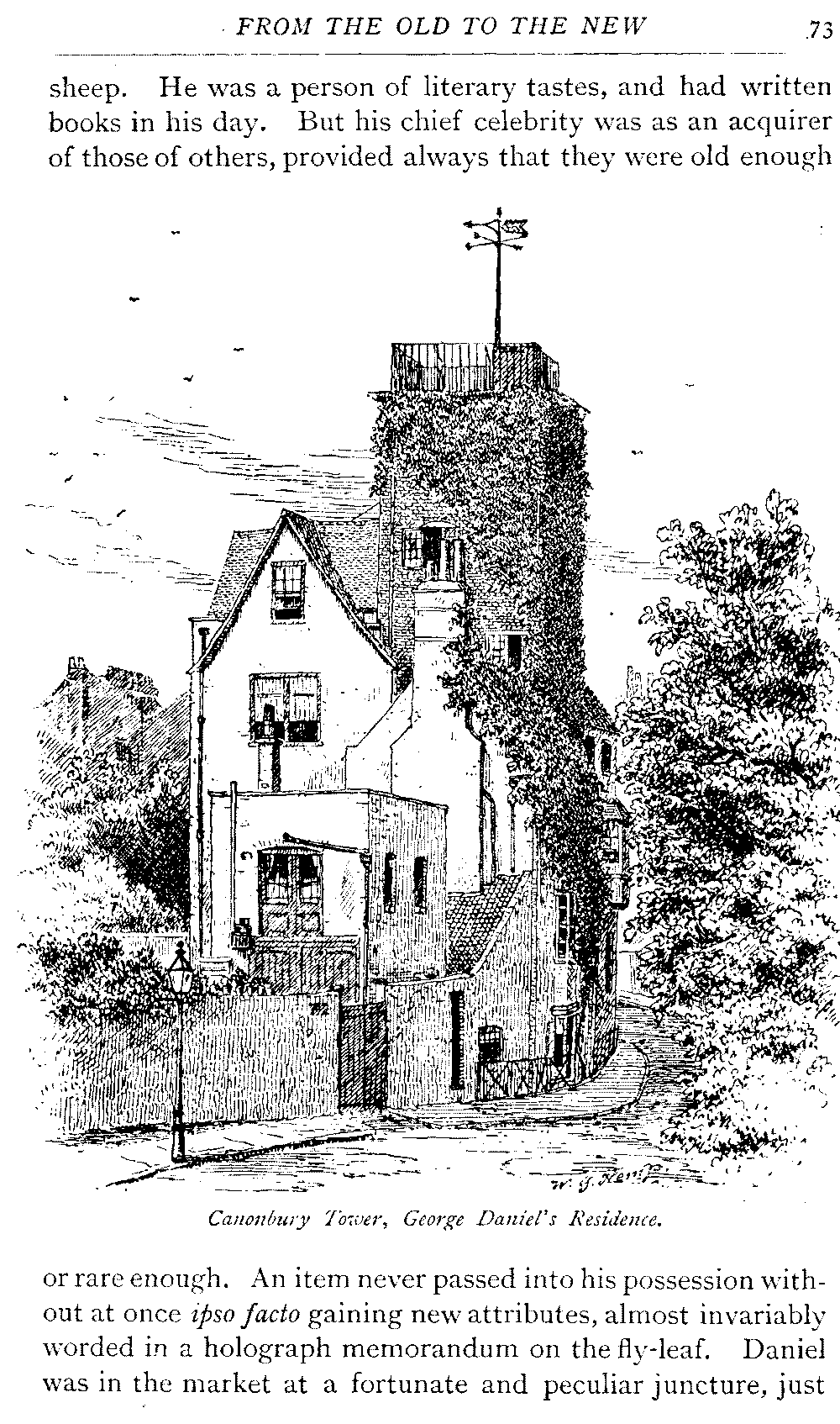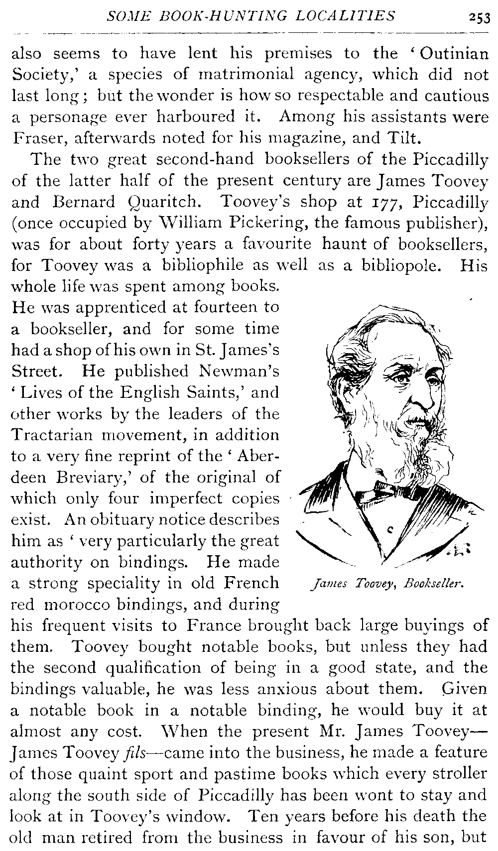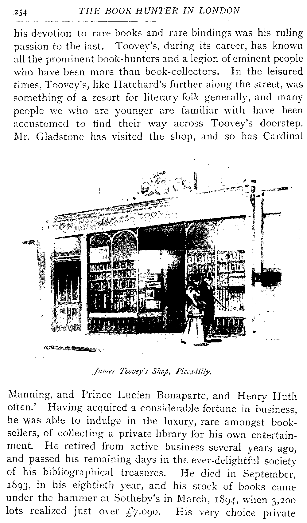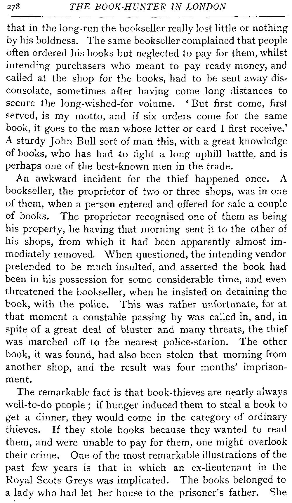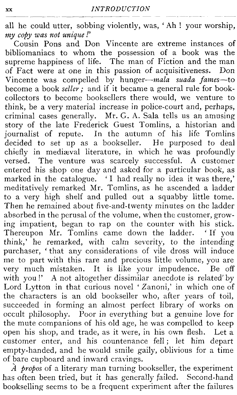 Cousin Pons and Don Vincente are extreme instances of bibliomaniacs to whom the possession of a book was the supreme happiness of life. The man of Fiction and the man of Fact were at one in this passion of acquisitiveness. Don Vincente was compelled by hunger—mala suada fames—to become a book seller; and if it became a general rule for book-collectors to become booksellers there would, we venture to think, be a very material increase in police-court and, perhaps, criminal cases generally. Mr. G. A. Sala tells us an amusing story of the late Frederick Guest Tomlins, a historian and journalist of repute. In the autumn of his life Tomlins decided to set up as a bookseller. He purposed to deal chiefly in mediæval literature, in which he was profoundly versed. The venture was scarcely successful. A customer entered his shop one day and asked for a particular book, as marked in the catalogue. 'I had really no idea it was there,' meditatively remarked Mr. Tomlins, as he ascended a ladder to a very high shelf and pulled out a squabby little tome. Then he remained about five-and-twenty minutes on the ladder absorbed in the perusal of the volume, when the customer, growing impatient, began to rap on the counter with his stick. Thereupon Mr. Tomlins came down the ladder. 'If you think,' he remarked, with calm severity, to the intending purchaser, 'that any considerations of vile dross will induce me to part with this rare and precious little volume, you are very much mistaken. It is like your impudence. Be off with you!' A not altogether dissimilar anecdote is related by Lord Lytton in that curious novel 'Zanoni,' in which one of the characters is an old bookseller who, after years of toil, succeeded in forming an almost perfect library of works on occult philosophy. Poor in everything but a genuine love for the mute companions of his old age, he was compelled to keep open his shop, and trade, as it were, in his own flesh. Let a customer enter, and his countenance fell; let him depart empty-handed, and he would smile gaily, oblivious for a time of bare cupboard and inward cravings.