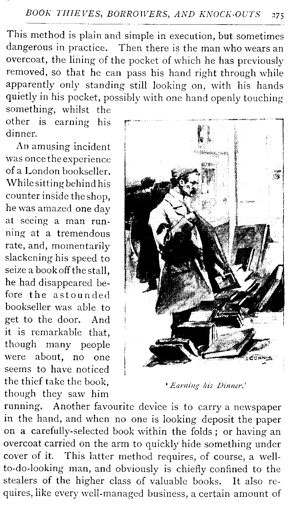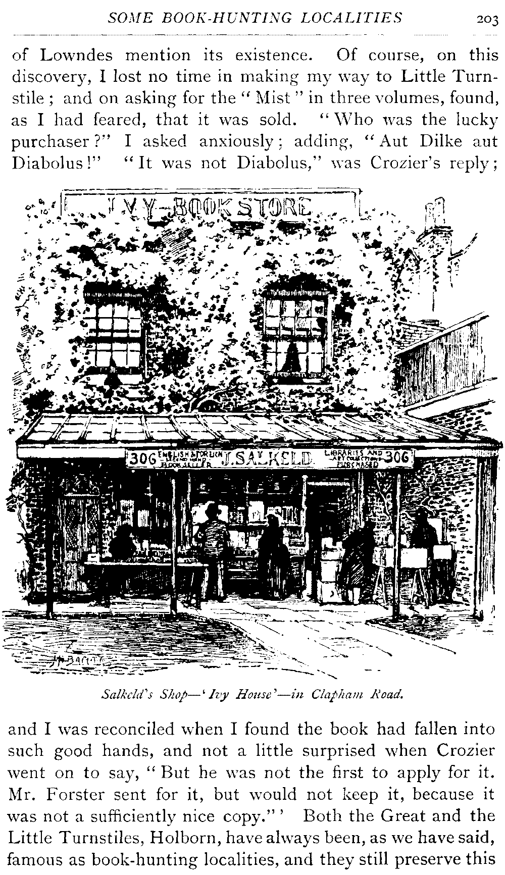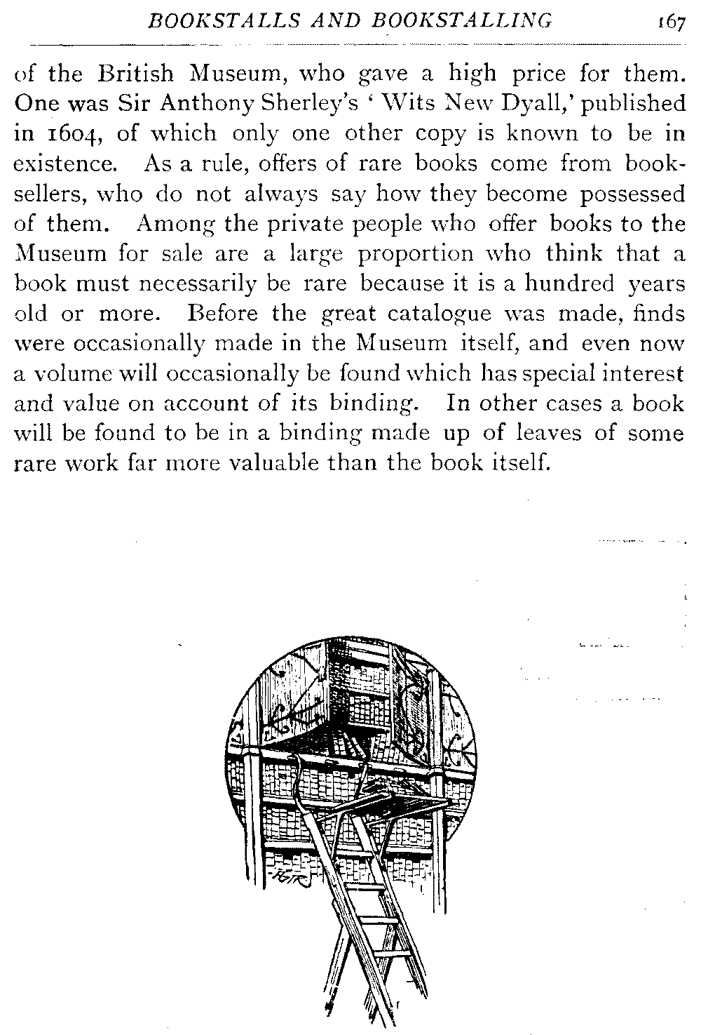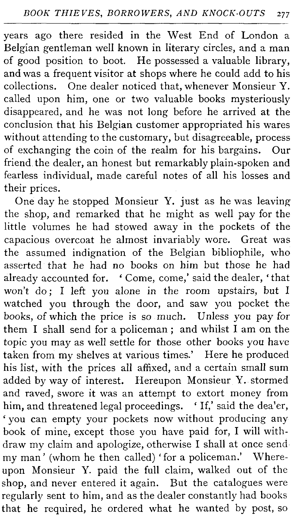 Cousin Pons and Don Vincente are extreme instances of bibliomaniacs to whom the possession of a book was the supreme happiness of life. The man of Fiction and the man of Fact were at one in this passion of acquisitiveness. Don Vincente was compelled by hunger—mala suada fames—to become a book seller; and if it became a general rule for book-collectors to become booksellers there would, we venture to think, be a very material increase in police-court and, perhaps, criminal cases generally. Mr. G. A. Sala tells us an amusing story of the late Frederick Guest Tomlins, a historian and journalist of repute. In the autumn of his life Tomlins decided to set up as a bookseller. He purposed to deal chiefly in mediæval literature, in which he was profoundly versed. The venture was scarcely successful. A customer entered his shop one day and asked for a particular book, as marked in the catalogue. 'I had really no idea it was there,' meditatively remarked Mr. Tomlins, as he ascended a ladder to a very high shelf and pulled out a squabby little tome. Then he remained about five-and-twenty minutes on the ladder absorbed in the perusal of the volume, when the customer, growing impatient, began to rap on the counter with his stick. Thereupon Mr. Tomlins came down the ladder. 'If you think,' he remarked, with calm severity, to the intending purchaser, 'that any considerations of vile dross will induce me to part with this rare and precious little volume, you are very much mistaken. It is like your impudence. Be off with you!' A not altogether dissimilar anecdote is related by Lord Lytton in that curious novel 'Zanoni,' in which one of the characters is an old bookseller who, after years of toil, succeeded in forming an almost perfect library of works on occult philosophy. Poor in everything but a genuine love for the mute companions of his old age, he was compelled to keep open his shop, and trade, as it were, in his own flesh. Let a customer enter, and his countenance fell; let him depart empty-handed, and he would smile gaily, oblivious for a time of bare cupboard and inward cravings.