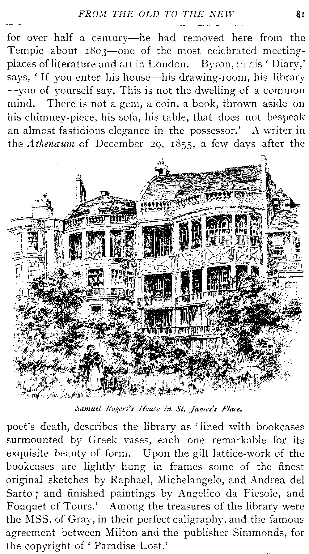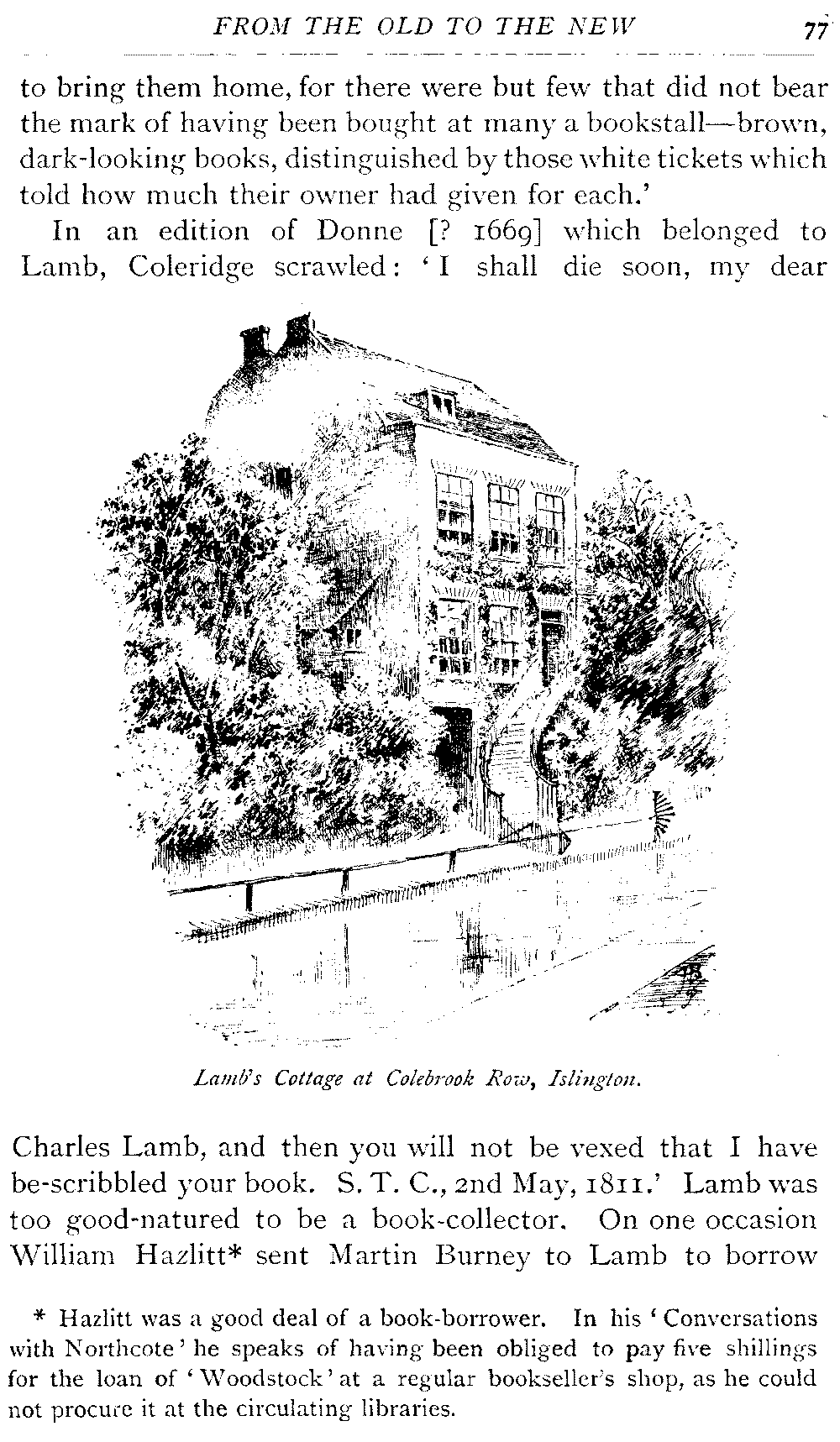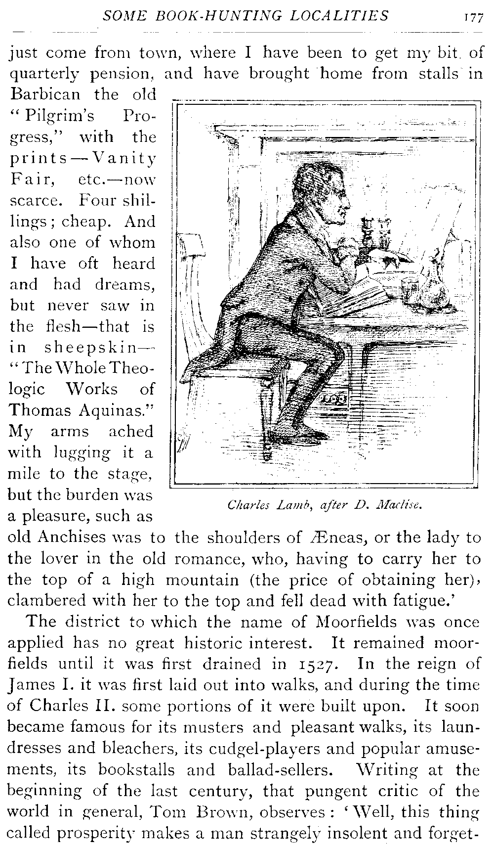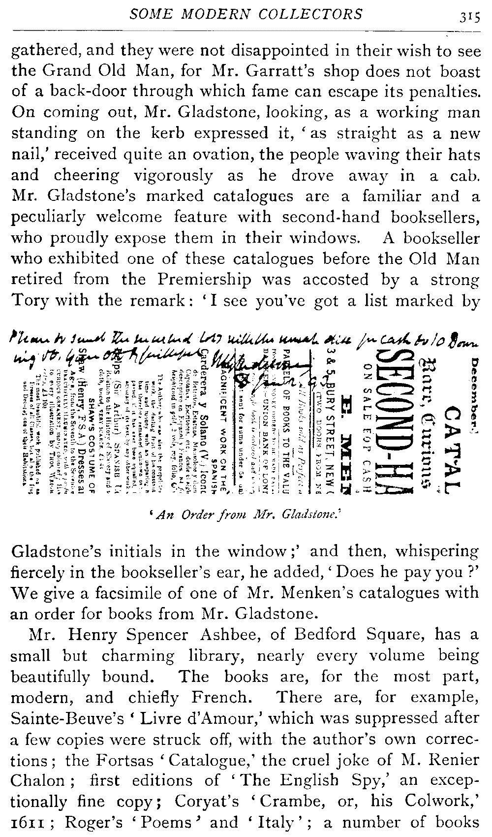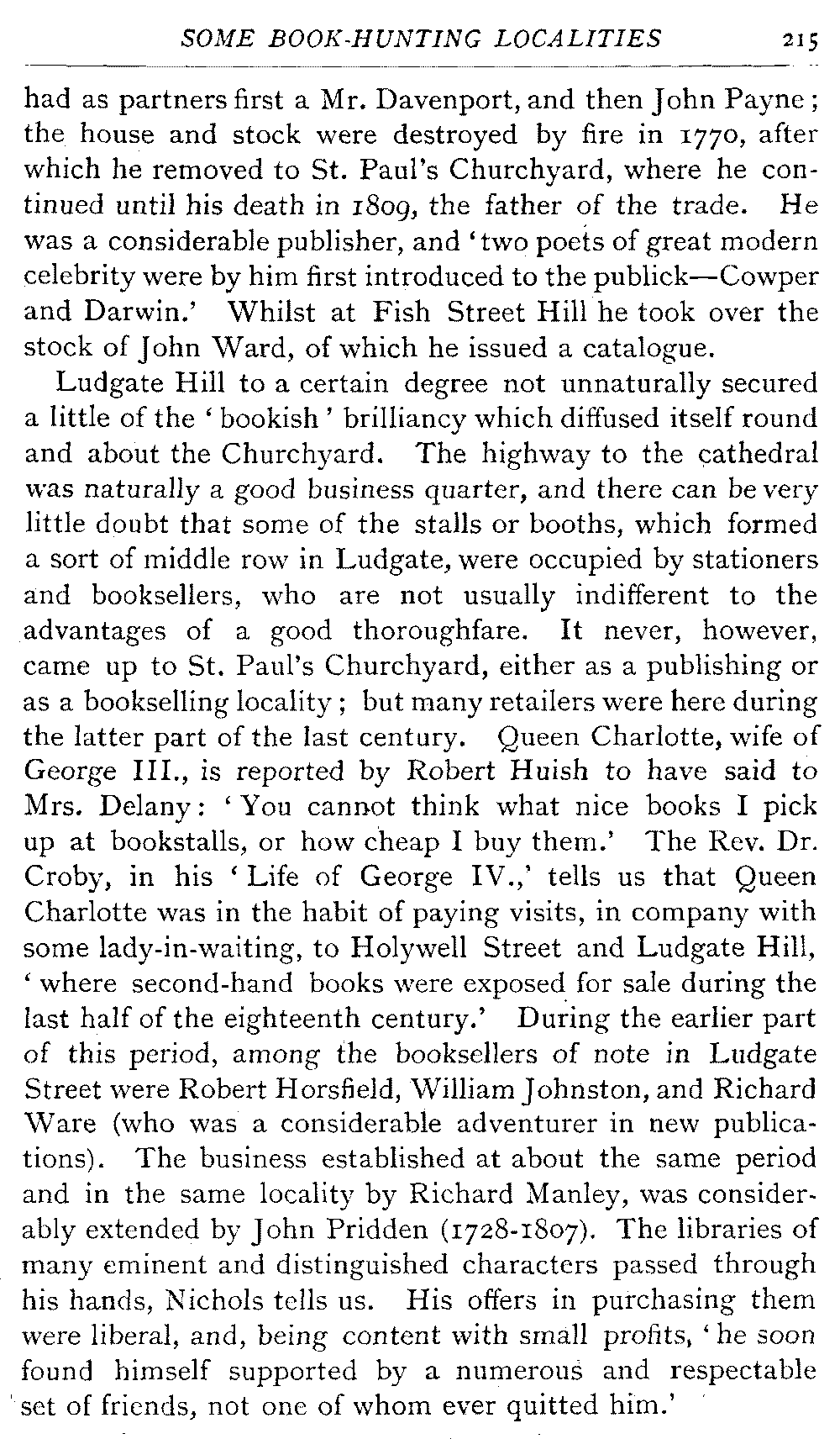Cousin Pons and Don Vincente are extreme instances of bibliomaniacs to whom the possession of a book was the supreme happiness of life. The man of Fiction and the man of Fact were at one in this passion of acquisitiveness. Don Vincente was compelled by hunger—mala suada fames—to become a book seller; and if it became a general rule for book-collectors to become booksellers there would, we venture to think, be a very material increase in police-court and, perhaps, criminal cases generally. Mr. G. A. Sala tells us an amusing story of the late Frederick Guest Tomlins, a historian and journalist of repute. In the autumn of his life Tomlins decided to set up as a bookseller. He purposed to deal chiefly in mediæval literature, in which he was profoundly versed. The venture was scarcely successful. A customer entered his shop one day and asked for a particular book, as marked in the catalogue. 'I had really no idea it was there,' meditatively remarked Mr. Tomlins, as he ascended a ladder to a very high shelf and pulled out a squabby little tome. Then he remained about five-and-twenty minutes on the ladder absorbed in the perusal of the volume, when the customer, growing impatient, began to rap on the counter with his stick. Thereupon Mr. Tomlins came down the ladder. 'If you think,' he remarked, with calm severity, to the intending purchaser, 'that any considerations of vile dross will induce me to part with this rare and precious little volume, you are very much mistaken. It is like your impudence. Be off with you!' A not altogether dissimilar anecdote is related by Lord Lytton in that curious novel 'Zanoni,' in which one of the characters is an old bookseller who, after years of toil, succeeded in forming an almost perfect library of works on occult philosophy. Poor in everything but a genuine love for the mute companions of his old age, he was compelled to keep open his shop, and trade, as it were, in his own flesh. Let a customer enter, and his countenance fell; let him depart empty-handed, and he would smile gaily, oblivious for a time of bare cupboard and inward cravings.