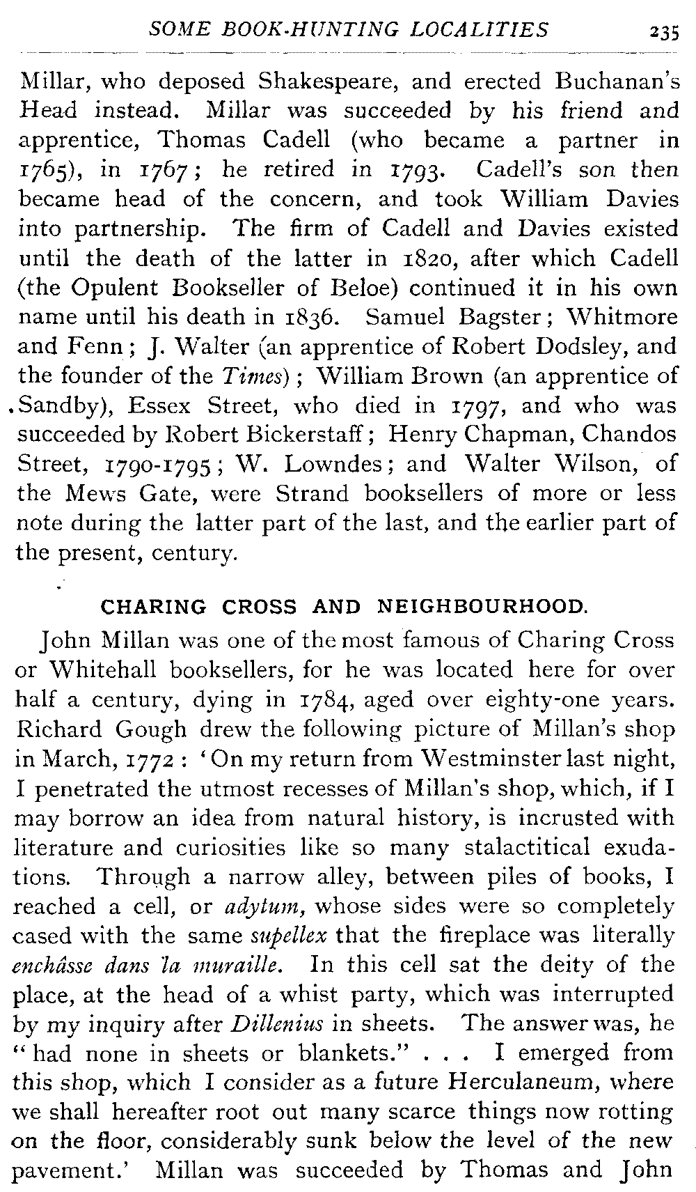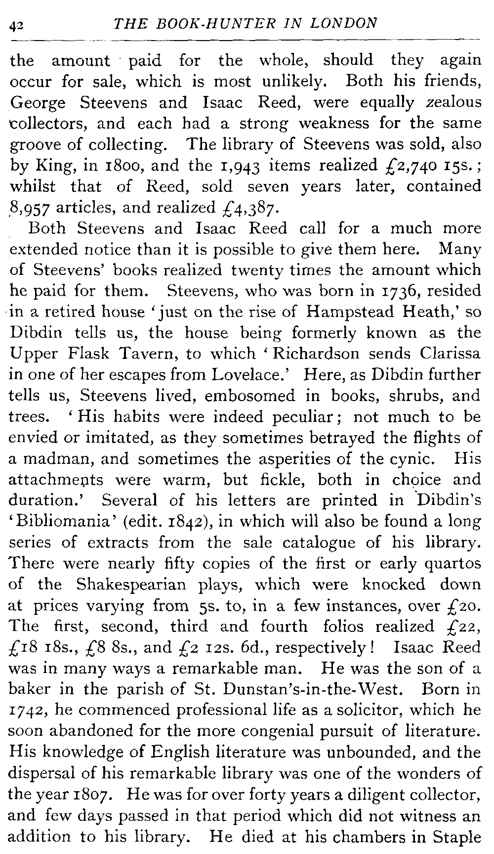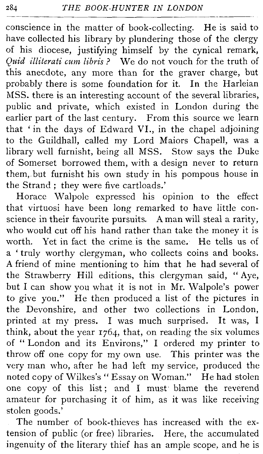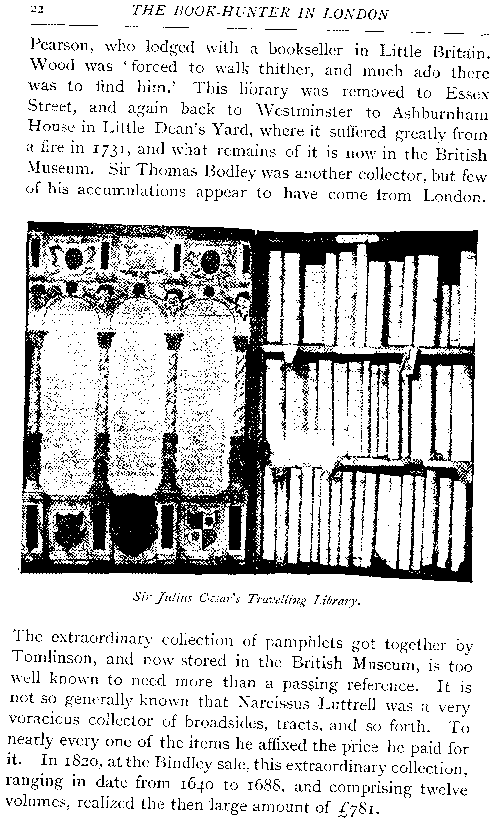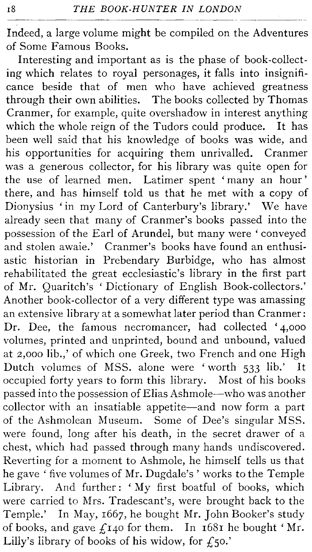 It is infinitely easier to name those who have collected books in this vast and unwieldy London of ours, than it is to classify them. To adopt botanical phraseology, the genus is defined in a word or two, but the species, the varieties, the hybrids, and the seedlings, how varied and impossible their classification! Most men have bought books, some have read a few, and others many; but beyond this rough grouping together we shall not attempt anything. One thing, however, the majority of book-collectors agree in, and that is in regarding their own generation as a revolution—they have, as Butler has described it in his picture of an antiquary, 'a great value for that which is past and gone, like the madman that fell in love with Cleopatra.'