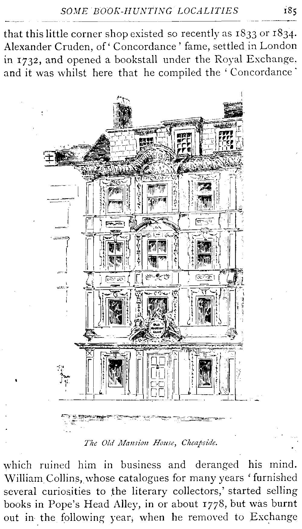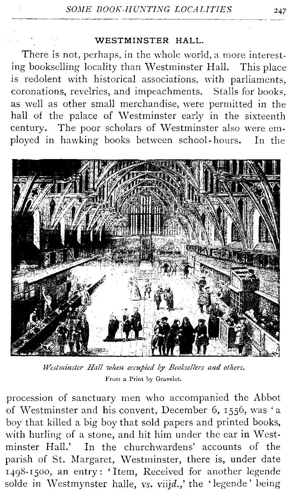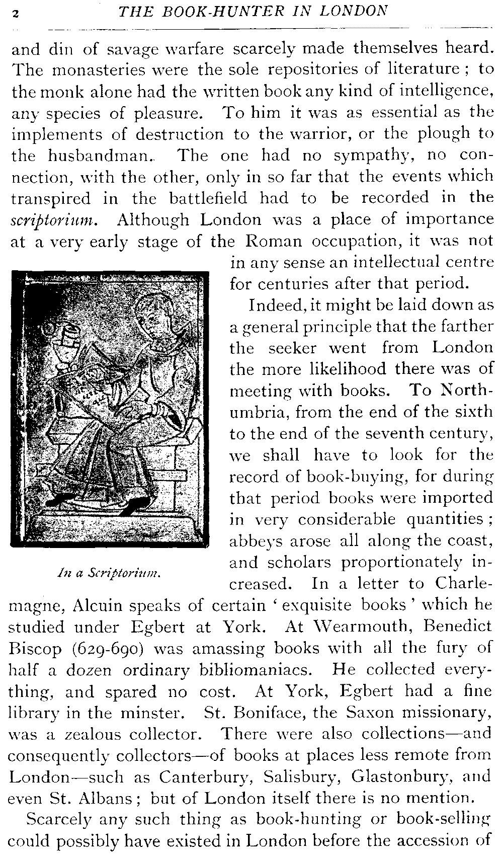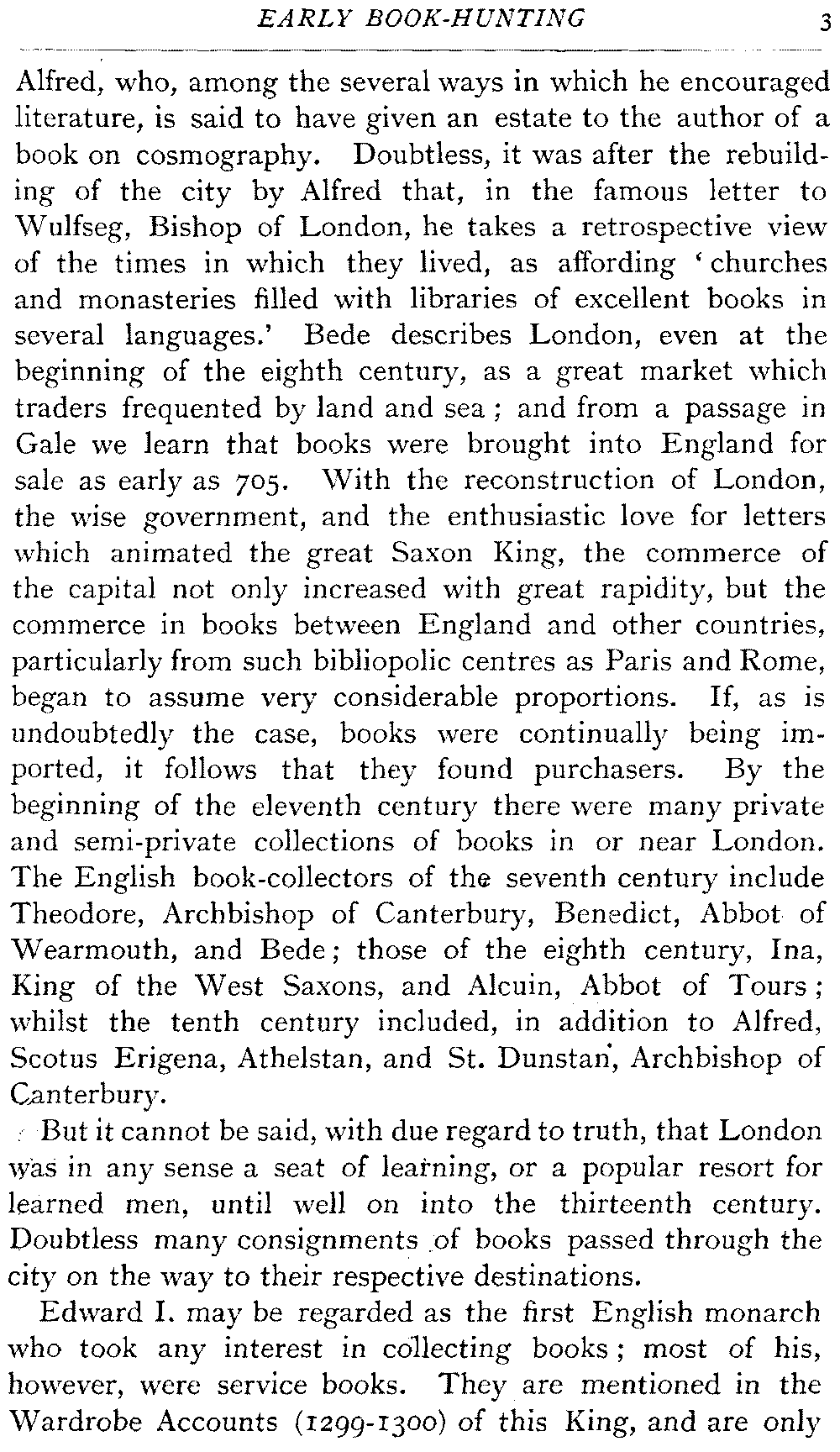 Scarcely any such thing as book-hunting or book-selling could possibly have existed in London before the accession of [3]Alfred, who, among the several ways in which he encouraged literature, is said to have given an estate to the author of a book on cosmography. Doubtless, it was after the rebuilding of the city by Alfred that, in the famous letter to Wulfseg, Bishop of London, he takes a retrospective view of the times in which they lived, as affording 'churches and monasteries filled with libraries of excellent books in several languages.' Bede describes London, even at the beginning of the eighth century, as a great market which traders frequented by land and sea; and from a passage in Gale we learn that books were brought into England for sale as early as 705. With the reconstruction of London, the wise government, and the enthusiastic love for letters which animated the great Saxon King, the commerce of the capital not only increased with great rapidity, but the commerce in books between England and other countries, particularly from such bibliopolic centres as Paris and Rome, began to assume very considerable proportions. If, as is undoubtedly the case, books were continually being imported, it follows that they found purchasers. By the beginning of the eleventh century there were many private and semi-private collections of books in or near London. The English book-collectors of the seventh century include Theodore, Archbishop of Canterbury, Benedict, Abbot of Wearmouth, and Bede; those of the eighth century, Ina, King of the West Saxons, and Alcuin, Abbot of Tours; whilst the tenth century included, in addition to Alfred, Scotus Erigena, Athelstan, and St. Dunstan, Archbishop of Canterbury.