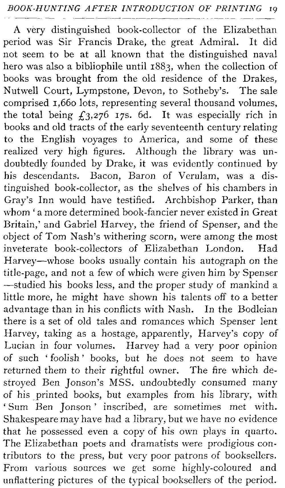 IT would be quite as great a fallacy to assume that a rich man is also a wise one, as to take for granted that he who has accumulated a large library is necessarily a learned man. It is a very curious fact, but none the less a fact, that just as the greatest men have the shortest biographies, so have they been content with the smallest libraries. Shakespeare, Voltaire, Humboldt, Comte, Goethe had no collection of books to which the term library could fairly be applied. But though each preferred to find in Nature and in Nature's handiworks the mental exercise which less gifted men obtain from books, that did not prevent them from being ardent book-lovers. Shakespeare—to mention one only—must have possessed a Plutarch, a Stowe, a Montaigne, and a Bible, and probably half a dozen other books of less moment. And yet, with this poor show, he was as genuine a book-lover as Ben Jonson or my Lord Verulam. Lord Burleigh, Grotius, and Bonaparte are said to have carried their libraries in their pockets, and doubtless Shakespeare could have carried his under his arm.