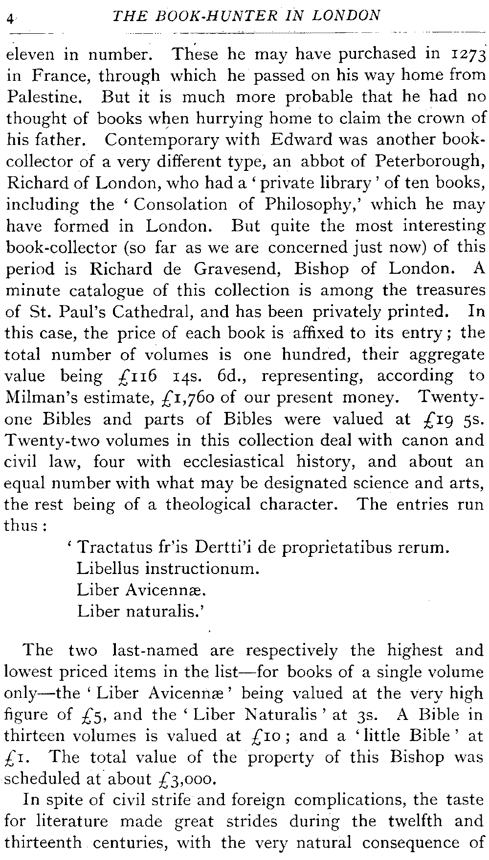 Edward I. may be regarded as the first English monarch who took any interest in collecting books; most of his, however, were service books. They are mentioned in the Wardrobe Accounts (1299-1300) of this King, and are only [4]eleven in number. These he may have purchased in 1273 in France, through which he passed on his way home from Palestine. But it is much more probable that he had no thought of books when hurrying home to claim the crown of his father. Contemporary with Edward was another book-collector of a very different type, an abbot of Peterborough, Richard of London, who had a 'private library' of ten books, including the 'Consolation of Philosophy,' which he may have formed in London. But quite the most interesting book-collector (so far as we are concerned just now) of this period is Richard de Gravesend, Bishop of London. A minute catalogue of this collection is among the treasures of St. Paul's Cathedral, and has been privately printed. In this case, the price of each book is affixed to its entry; the total number of volumes is one hundred, their aggregate value being £116 14s. 6d., representing, according to Milman's estimate, £1,760 of our present money. Twenty-one Bibles and parts of Bibles were valued at £19 5s. Twenty-two volumes in this collection deal with canon and civil law, four with ecclesiastical history, and about an equal number with what may be designated science and arts, the rest being of a theological character. The entries run thus: