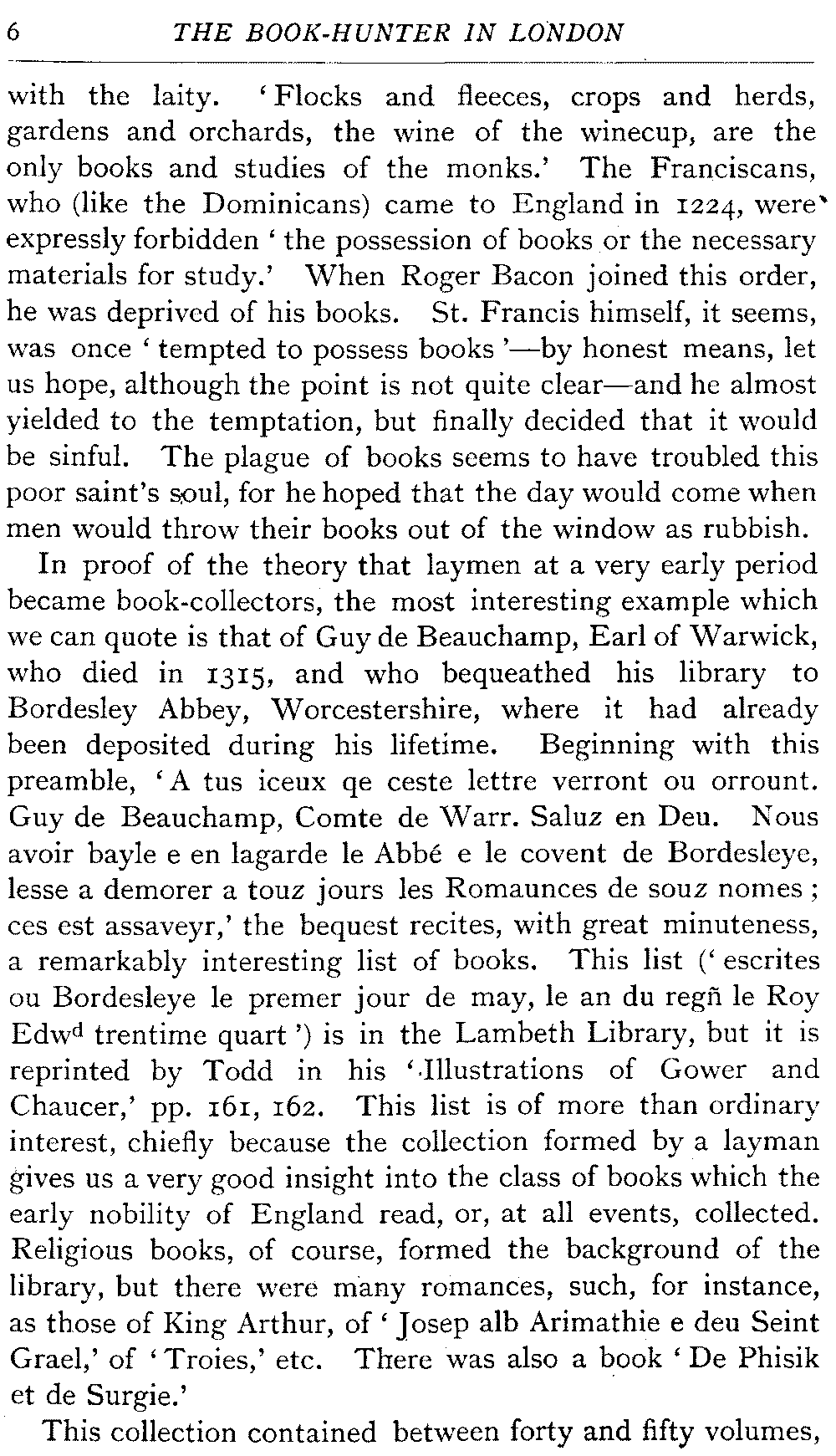 In proof of the theory that laymen at a very early period became book-collectors, the most interesting example which we can quote is that of Guy de Beauchamp, Earl of Warwick, who died in 1315, and who bequeathed his library to Bordesley Abbey, Worcestershire, where it had already been deposited during his lifetime. Beginning with this preamble, 'A tus iceux qe ceste lettre verront ou orrount. Guy de Beauchamp, Comte de Warr. Saluz en Deu. Nous avoir bayle e en lagarde le Abbé e le covent de Bordesleye, lesse a demorer a touz jours les Romaunces de souz nomes; ces est assaveyr,' the bequest recites, with great minuteness, a remarkably interesting list of books. This list ('escrites ou Bordesleye le premer jour de may, le an du regñ le Roy Edwd trentime quart') is in the Lambeth Library, but it is reprinted by Todd in his 'Illustrations of Gower and Chaucer,' pp. 161, 162. This list is of more than ordinary interest, chiefly because the collection formed by a layman gives us a very good insight into the class of books which the early nobility of England read, or, at all events, collected. Religious books, of course, formed the background of the library, but there were many romances, such, for instance, as those of King Arthur, of 'Josep alb Arimathie e deu Seint Grael,' of 'Troies,' etc. There was also a book 'De Phisik et de Surgie.'