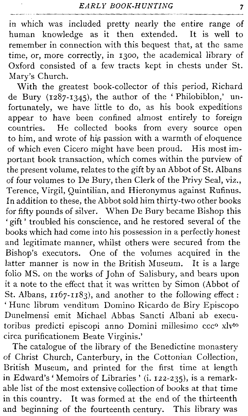 With the greatest book-collector of this period, Richard de Bury (1287-1345), the author of the 'Philobiblon,' unfortunately, we have little to do, as his book expeditions appear to have been confined almost entirely to foreign countries. He collected books from every source open to him, and wrote of his passion with a warmth of eloquence of which even Cicero might have been proud. His most important book transaction, which comes within the purview of the present volume, relates to the gift by an Abbot of St. Albans of four volumes to De Bury, then Clerk of the Privy Seal, viz., Terence, Virgil, Quintilian, and Hieronymus against Rufinus. In addition to these, the Abbot sold him thirty-two other books for fifty pounds of silver. When De Bury became Bishop this 'gift' troubled his conscience, and he restored several of the books which had come into his possession in a perfectly honest and legitimate manner, whilst others were secured from the Bishop's executors. One of the volumes acquired in the latter manner is now in the British Museum. It is a large folio MS. on the works of John of Salisbury, and bears upon it a note to the effect that it was written by Simon (Abbot of St. Albans, 1167-1183), and another to the following effect: 'Hunc librum venditum Domino Ricardo de Biry Episcopo Dunelmensi emit Michael Abbas Sancti Albani ab executoribus predicti episcopi anno Domini millesimo ccco xlvto circa purificationem Beate Virginis.'