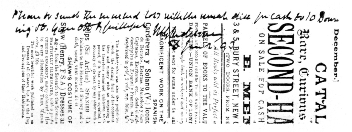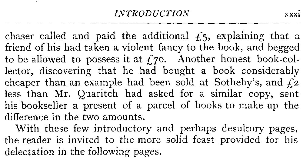 Last summer a certain bookseller sold, after some considerable amount of haggling, a very fine Missal for £65, which was £5 less than its catalogue price. A few weeks after the [xxxi]purchaser called and paid the additional £5, explaining that a friend of his had taken a violent fancy to the book, and begged to be allowed to possess it at £70. Another honest book-collector, discovering that he had bought a book considerably cheaper than an example had been sold at Sotheby's, and £2 less than Mr. Quaritch had asked for a similar copy, sent his bookseller a present of a parcel of books to make up the difference in the two amounts.