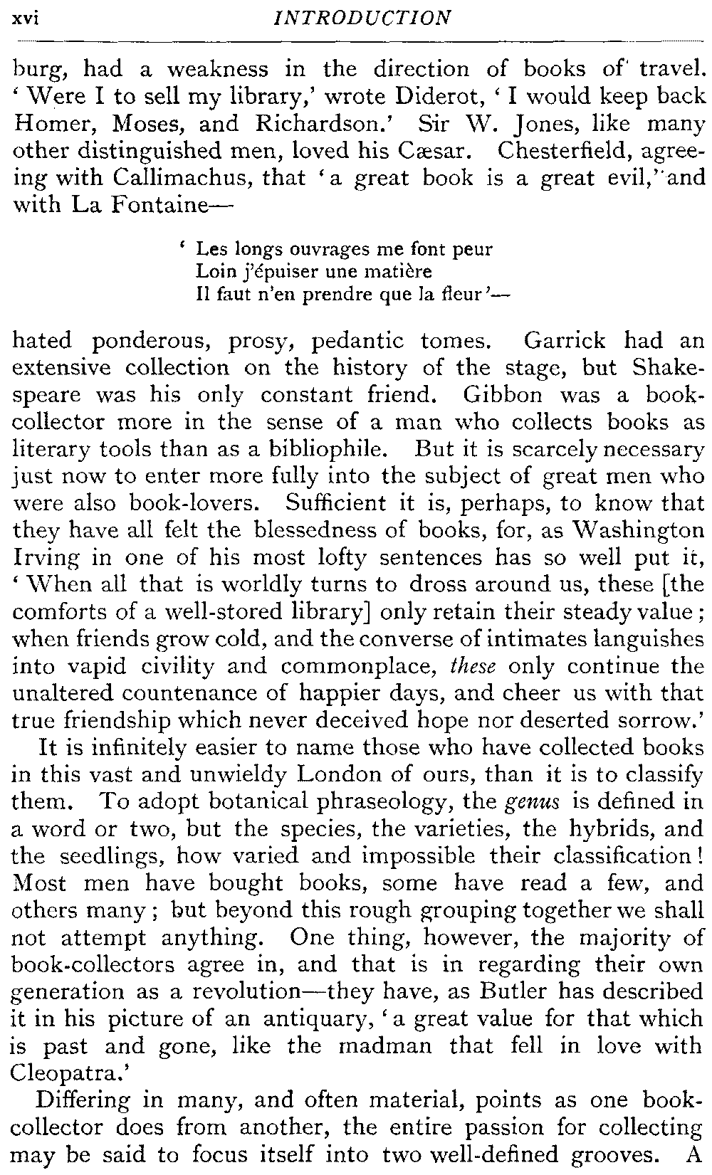 If all great men have not been book-collectors in the manner which is generally understood by the phrase, it is certain that they have, perhaps without a single exception, been book-lovers. They appear, for the most part, to have made a constant companion of some particularly favourite book; for instance, St. Jerome slept with a copy of Aristotle under his pillow; Lord Clarendon had a couple of favourites, Livy and Tacitus; Lord Chatham had a good classical library, with an especial fondness for Barrow; Leibnitz died in a chair with the 'Argenis' of Barclay in his hand; Kant, who never left his birthplace, Königsburg, [xvi]had a weakness in the direction of books of travel. 'Were I to sell my library,' wrote Diderot, 'I would keep back Homer, Moses, and Richardson.' Sir W. Jones, like many other distinguished men, loved his Cæsar. Chesterfield, agreeing with Callimachus, that 'a great book is a great evil,' and with La Fontaine—