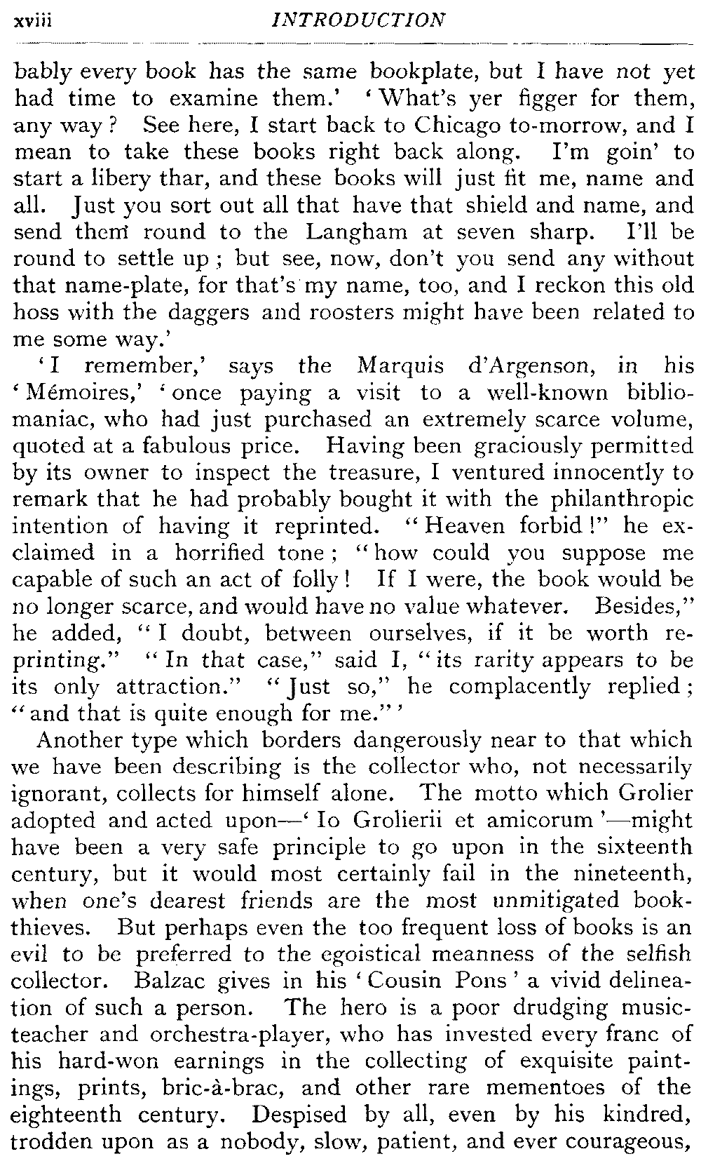 There are many varieties of the ignorant collector type. The most fruitful source is the nouveau riche. Book-collecting is greatly a matter of fashion; and most of us will remember what Benjamin Franklin said of this prevailing vice: 'There are numbers that, perhaps, fear less the being in hell, than out of the fashion.' The enterprising individual who, on receipt of a catalogue of medical books, wired to the bookseller, 'What will you take for the lot?' and on a price being quoted, again telegraphed, 'Send them along,' was clearly a person who wished to be fashionable. Another characteristically amusing illustration of this type of book-collector is related by an old-established second-hand bookseller, who had bought at a country sale some two or three hundred volumes in a fair condition. But they were principally old sermons, or, what is worse, theology and political economy. He placed a sample lot outside his shop, leaving the bulk of the stock untouched. The little parcel attracted the attention of a stylishly dressed man, who entered the shop and said, 'I'll take these books, and, say, have you any more of this kind with this shield onto them?' pointing to the bookplate attached, which bore the arms and name of a good old county family. 'That box, sir, is full of books from the same house, and [xviii]probably every book has the same bookplate, but I have not yet had time to examine them.' 'What's yer figger for them, any way? See here, I start back to Chicago to-morrow, and I mean to take these books right back along. I'm goin' to start a libery thar, and these books will just fit me, name and all. Just you sort out all that have that shield and name, and send them round to the Langham at seven sharp. I'll be round to settle up; but see, now, don't you send any without that name-plate, for that's my name, too, and I reckon this old hoss with the daggers and roosters might have been related to me some way.'