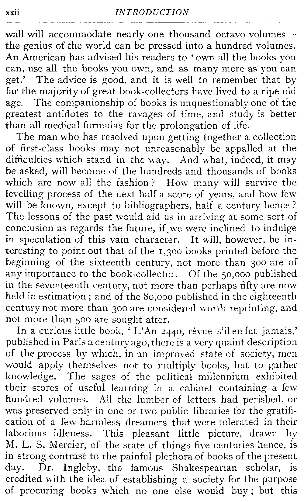 In a curious little book, 'L'An 2440, rêvue s'il en fut jamais,' published in Paris a century ago, there is a very quaint description of the process by which, in an improved state of society, men would apply themselves not to multiply books, but to gather knowledge. The sages of the political millennium exhibited their stores of useful learning in a cabinet containing a few hundred volumes. All the lumber of letters had perished, or was preserved only in one or two public libraries for the gratification of a few harmless dreamers that were tolerated in their laborious idleness. This pleasant little picture, drawn by M. L. S. Mercier, of the state of things five centuries hence, is in strong contrast to the painful plethora of books of the present day. Dr. Ingleby, the famous Shakespearian scholar, is credited with the idea of establishing a society for the purpose of procuring books which no one else would buy; but this [xxiii]society (the 'Syncretic Book-club') could not have had any success if the vast quantities of unsaleable rubbish which one meets with on every hand are to be taken into account. Doubtless Dr. Ingleby would have included in his scope such books as Lord Lonsdale's 'Memoir of the Reign of James II.,' 1803, which fifty years ago sold for 5-1/2 guineas, but which, within the past few months, has declined to two shillings!
