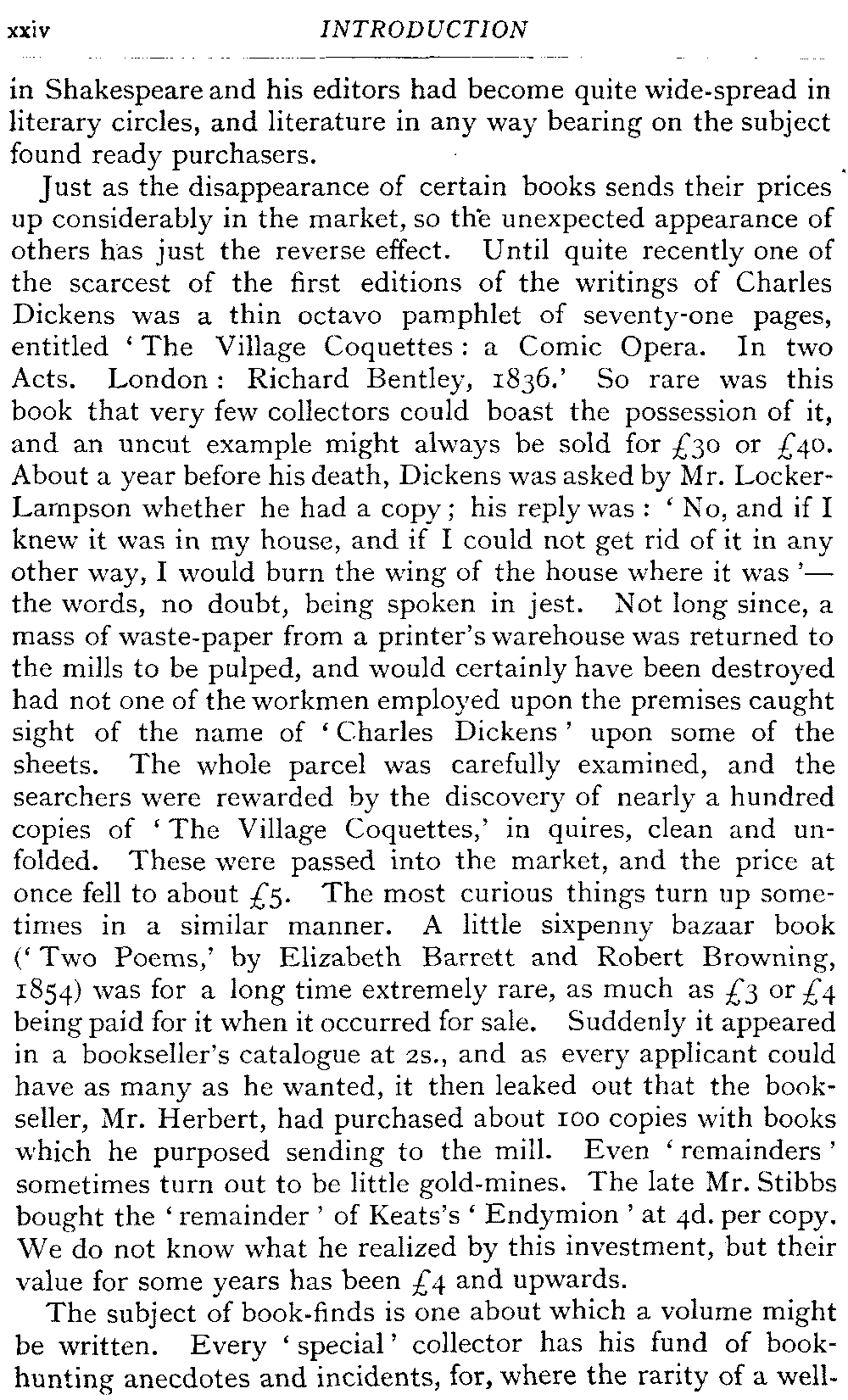 Just as the disappearance of certain books sends their prices up considerably in the market, so the unexpected appearance of others has just the reverse effect. Until quite recently one of the scarcest of the first editions of the writings of Charles Dickens was a thin octavo pamphlet of seventy-one pages, entitled 'The Village Coquettes: a Comic Opera. In two Acts. London: Richard Bentley, 1836.' So rare was this book that very few collectors could boast the possession of it, and an uncut example might always be sold for £30 or £40. About a year before his death, Dickens was asked by Mr. Locker-Lampson whether he had a copy; his reply was: 'No, and if I knew it was in my house, and if I could not get rid of it in any other way, I would burn the wing of the house where it was'—the words, no doubt, being spoken in jest. Not long since, a mass of waste-paper from a printer's warehouse was returned to the mills to be pulped, and would certainly have been destroyed had not one of the workmen employed upon the premises caught sight of the name of 'Charles Dickens' upon some of the sheets. The whole parcel was carefully examined, and the searchers were rewarded by the discovery of nearly a hundred copies of 'The Village Coquettes,' in quires, clean and unfolded. These were passed into the market, and the price at once fell to about £5. The most curious things turn up sometimes in a similar manner. A little sixpenny bazaar book ('Two Poems,' by Elizabeth Barrett and Robert Browning, 1854) was for a long time extremely rare, as much as £3 or £4 being paid for it when it occurred for sale. Suddenly it appeared in a bookseller's catalogue at 2s., and as every applicant could have as many as he wanted, it then leaked out that the bookseller, Mr. Herbert, had purchased about 100 copies with books which he purposed sending to the mill. Even 'remainders' sometimes turn out to be little gold-mines. The late Mr. Stibbs bought the 'remainder' of Keats's 'Endymion' at 4d. per copy. We do not know what he realized by this investment, but their value for some years has been £4 and upwards.