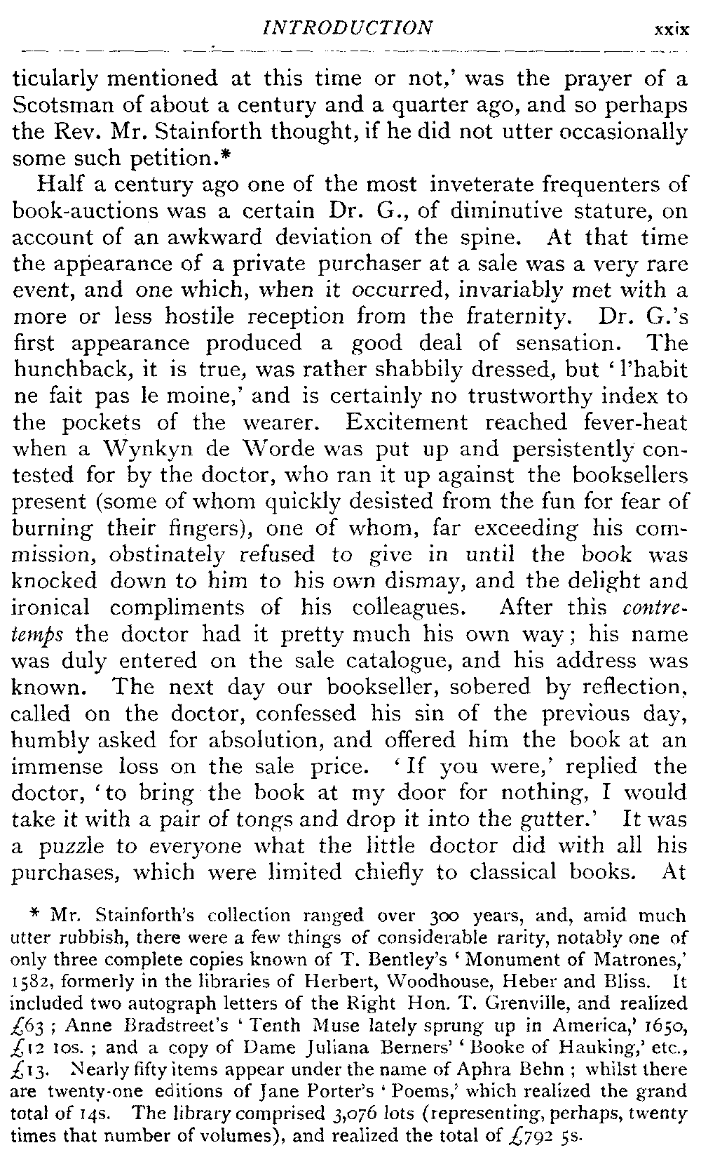 [xxix-A] Mr. Stainforth's collection ranged over 300 years, and, amid much utter rubbish, there were a few things of considerable rarity, notably one of only three complete copies known of T. Bentley's 'Monument of Matrones,' 1582, formerly in the libraries of Herbert, Woodhouse, Heber and Bliss. It included two autograph letters of the Right Hon. T. Grenville, and realized £63; Anne Bradstreet's 'Tenth Muse lately sprung up in America,' 1650, £12 10s.; and a copy of Dame Juliana Berners' 'Booke of Hauking,' etc., £13. Nearly fifty items appear under the name of Aphra Behn; whilst there are twenty-one editions of Jane Porter's 'Poems,' which realized the grand total of 14s. The library comprised 3,076 lots (representing, perhaps, twenty times that number of volumes), and realized the total of £792 5s.