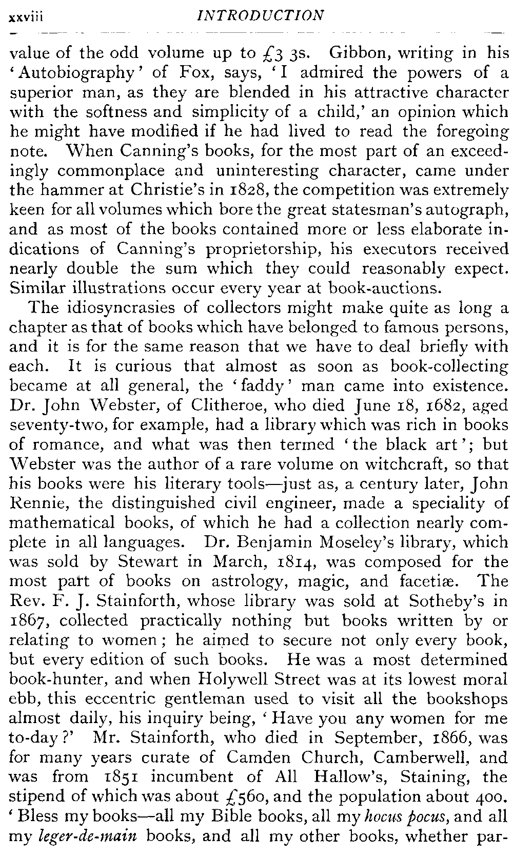 The idiosyncrasies of collectors might make quite as long a chapter as that of books which have belonged to famous persons, and it is for the same reason that we have to deal briefly with each. It is curious that almost as soon as book-collecting became at all general, the 'faddy' man came into existence. Dr. John Webster, of Clitheroe, who died June 18, 1682, aged seventy-two, for example, had a library which was rich in books of romance, and what was then termed 'the black art'; but Webster was the author of a rare volume on witchcraft, so that his books were his literary tools—just as, a century later, John Rennie, the distinguished civil engineer, made a speciality of mathematical books, of which he had a collection nearly complete in all languages. Dr. Benjamin Moseley's library, which was sold by Stewart in March, 1814, was composed for the most part of books on astrology, magic, and facetiæ. The Rev. F. J. Stainforth, whose library was sold at Sotheby's in 1867, collected practically nothing but books written by or relating to women; he aimed to secure not only every book, but every edition of such books. He was a most determined book-hunter, and when Holywell Street was at its lowest moral ebb, this eccentric gentleman used to visit all the bookshops almost daily, his inquiry being, 'Have you any women for me to-day?' Mr. Stainforth, who died in September, 1866, was for many years curate of Camden Church, Camberwell, and was from 1851 incumbent of All Hallow's, Staining, the stipend of which was about £560, and the population about 400. 'Bless my books—all my Bible books, all my hocus pocus, and all my leger-de-main books, and all my other books, whether [xxix]particularly mentioned at this time or not,' was the prayer of a Scotsman of about a century and a quarter ago, and so perhaps the Rev. Mr. Stainforth thought, if he did not utter occasionally some such petition.[xxix-A]