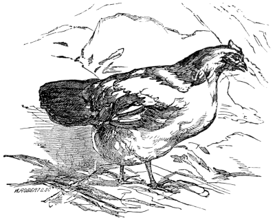One fine summer morning a Hen was picking peas in a farm-yard, under a pea-stack, when a pea fell on her head with such a thump that she thought a cloud had fallen. And she thought she would go to the court and tell the king that the clouds were falling: so she gaed, and she gaed, and she gaed, and she met a Cock, and the Cock said,—