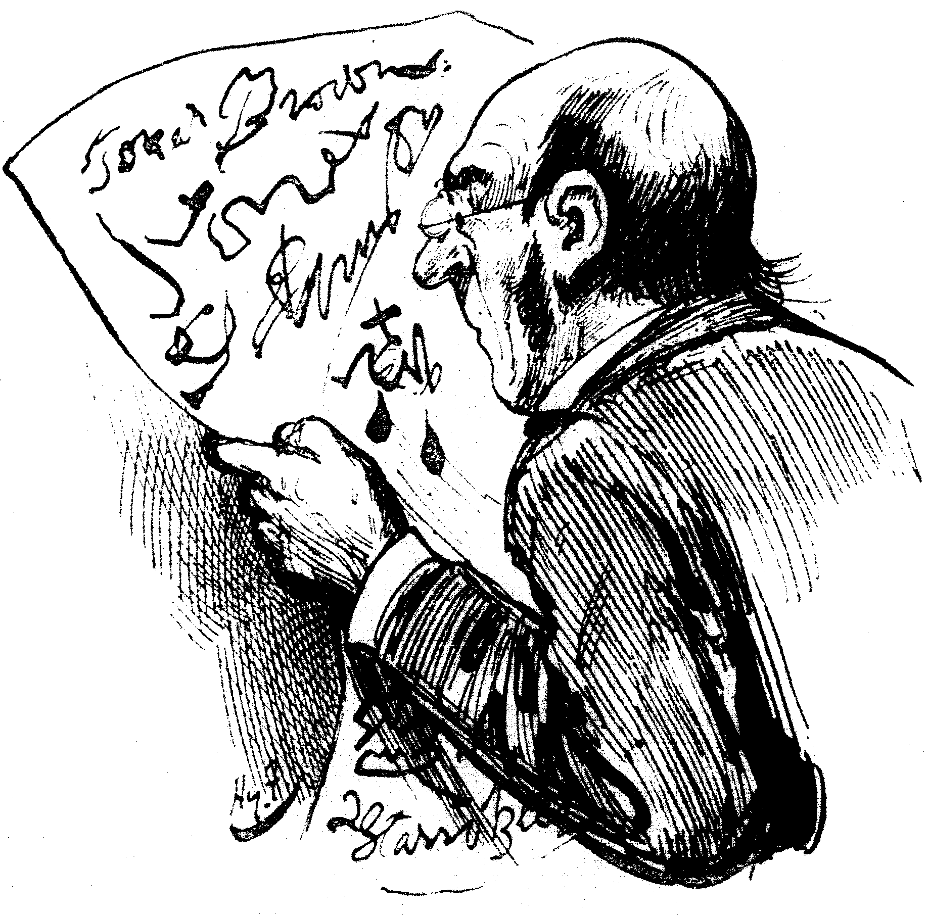 Portrait of a Member of Parliament examining the Signatures to a Petition against the Local-Veto Bill, to see if they are genuine or not. (Vide Report of the Proceedings in the Commons, March 28, which suggests that they are obtained in Public Houses.)