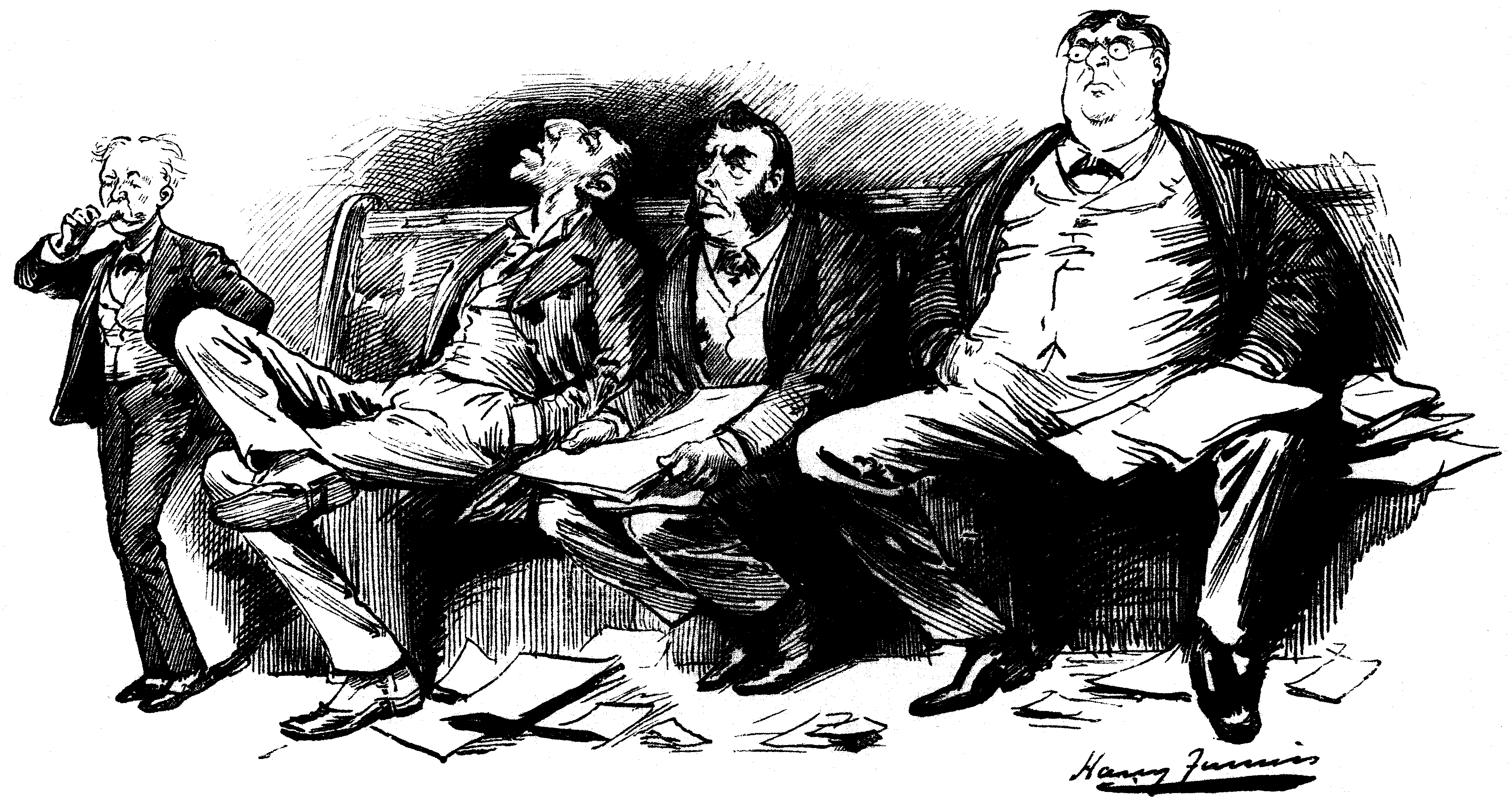 "No, my boy, you're wrong," said Caine. "Fact is, I'm going off to the country, and these protuberances you observe about my person are phonograms. All labelled, you see," he said, taking out cylinders from several pockets. "Here are a few remarks on Registration; that's my Local-Veto Speech; and here is an entirely new view of the Home-Rule question. If you like to come over to my house at Clapham—close by, you know, busses every ten minutes—you shall have a night's thorough enjoyment. Leave you in the room by yourself with the phonograph. Pop in one of these cylinders; set the phonograph whizzing; and you'll hear me on Local Veto. Take out cylinder, put in another, and you'll know more about Home Rule in five minutes than you ever dreamt. Can only let you have them for to-night. To-morrow they go down to Yorkshire, and thro' Easter Recess I shall be delivering, at various places, six speeches every night, I myself comfortably making holiday in Wales." "Thank you," I said; "but, if you'll excuse me, I think I'll go home and go to bed." In truth, a little depressed. Here's a nice prospect for the holidays! Bad enough to have Members working off at public meetings speeches that had been closured in Commons. But if every man is, during the recess, to multiply himself by phonography, the last state of this country will be worse than the first.