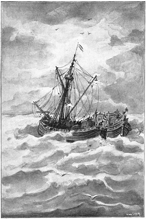 “En buitendien,” voegt de commandant er aan toe, “zou de Dover Lass het flinkste en grootste Spaansche galjoen, dat ooit de zee bevoer, bij zulk een storm ook te schande maken,” en hij kijkt met den trots en de liefde van een zeeman naar het nette kleine schip, op welks halfdek hij staat, terwijl het danst op de golven van den Scheldemond, het water, dat zijn boeg schoonveegt, vlug door zijn spuigaten werpend, met Zuid-Beveland te lij en Vlaanderen te loever.