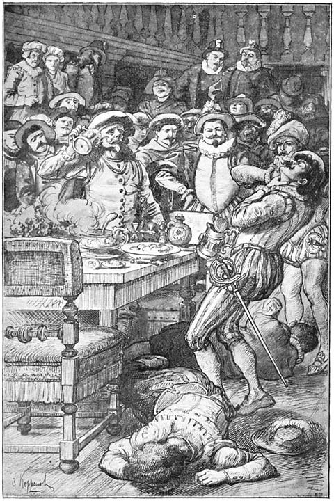 “Maar tegelijk met haar heb ik mij een aanzienlijken bruidsschat toegeëigend—een koningsdochter waardig, uw geheelen onzaligen tienden penning, hertog van Alva!” antwoordt Guy, [417]die dezen Parthischen pijl niet kan terughouden.