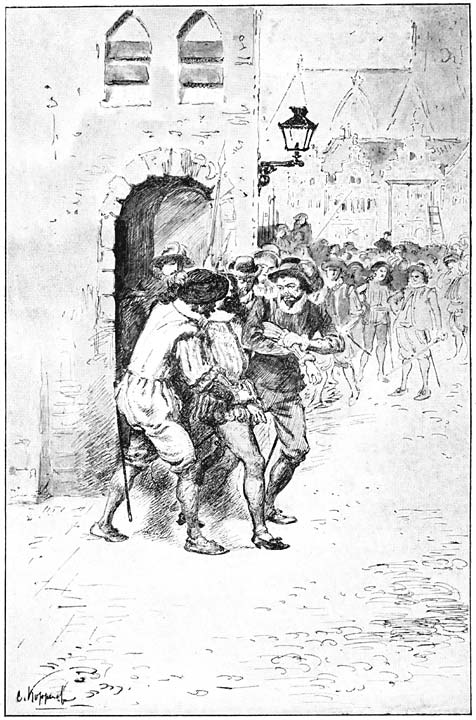 “Wel verdraaid! Gij weet best, dat ik een van de uwen ben,” lacht de jonge man, een penning toonend, dien hij om den hals draagt en waaraan twee of drie geuzennapjes hangen met deze woorden er op: “En tout fidelles au Roy!” en een borstbeeld van Philips II van Spanje.