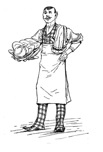 A score or more of small tables fastened securely to the floor—for many, as Bob often said, "comes here deep in liquor an' can't tell a white-pine table from a black felt hat"—were disposed about the room at measured distances from each other, equipped with four short-legged stools, a set of casters, and a jar of sugar, all so firmly fixed as to baffle both cupidity and nervousness. On walls, posts, and pillars were hung a number of allusions to the variety and excellence of Bob's larder.