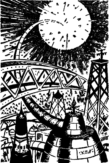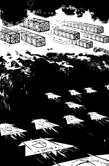 The three landing craft approached that enigmatic lattice-work of structural steel and stopped. Five grotesquely armored figures wafted themselves forward on pencils of force. Their leader, whose suit bore the number "14", reached a mammoth girder and worked his way along it up to a peculiar-looking bulge. The whole immense structure vanished, leaving men and boats in empty space.