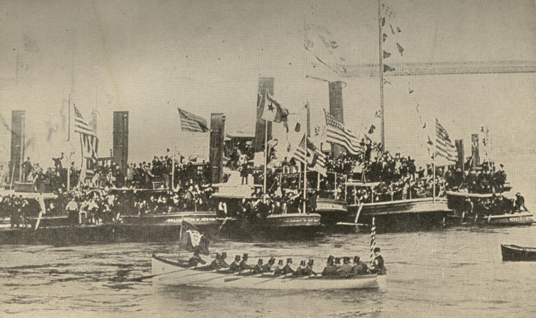 On May 20th, the day of opening, a grand procession marched from Buffalo to the Exposition grounds. Inspired by the music of twenty bands representing various nations, the parade wound through the park gate up over the Triumphal Bridge into the Esplanade. As the doors of the Temple of Music were thrown open, ten thousand pigeons were released, which, wheeling round and round, soared away to carry in all directions their messages announcing that the Exposition had begun. The Hallelujah Chorus was rendered, when Vice-President Roosevelt delivered the dedicatory address.