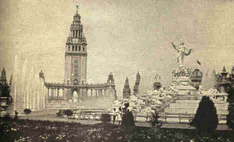 The authors of the Pan-American, architects, landscape-gardeners, sculptors, painters, and electricians, aimed first of all to create a beautiful spectacle. Entering by the Park Gateway you passed from the Forecourt, attractive by its terraces and colonnades, to the Triumphal Bridge, a noble portal, with four monumental piers surmounted by equestrian figures, “The Standard-bearers.” This dignified entrance was in striking contrast with the gaudy and barbarous opening to the Paris Exposition. From the gate the whole panorama spread out before the eye. Down the long court with its fountains, gardens, and encircling buildings, you saw the Electric Tower soaring heavenward, fit expression of the mighty power from Niagara, which at night made it so glorious. The central court bore the form of a cross. At either side of the gate lay transverse courts, each adorned with a lake, fountains, and sunken gardens, and ending in curved groups of buildings. On the east was the Government Group; on the west that devoted to horticulture, mines, and the graphic arts. The intersection of the two arms formed the Esplanade, spacious enough for a quarter of a million people, and commanding a superb view. Connected by pergolas with the building in the transverse ends two structures, the Temple of Music and the Ethnology Building, stood like sentinels at the entrance to the Court of Fountains. A group of buildings enclosed this court, terminating in the Electric Tower at the north. From the Electric Tower round to the Gateway again all the buildings were joined by cool colonnades. Beyond the Tower was the Plaza, a charming little court, its sunken garden and band-stand surrounded by colonnades holding statuary.