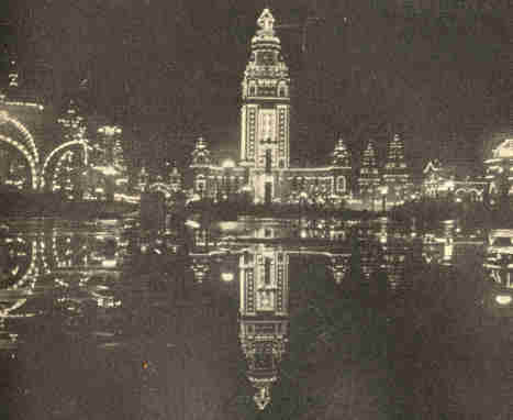 The centre of light was the Tower. It was suffused with the loveliest glow of gold, ivory, and delicate green, all blending. The lights revealed and interpreted the architecture softening the colors and adding the subtle charm of mystery. A hundred beautiful hues were reflected in the waters of the fountains. The floral effects made by submerged lights in the basin were exquisite, and the witchery of the scene was indescribable.