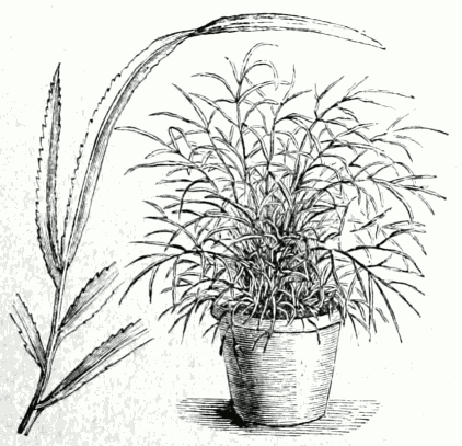 Ebenfalls für kühle Uberwinterungsräume geeignet sind Pritchardia robusta15, filifera16 und Sonorae17, von denen namentlich die zuletztgenannte Art durch ihre langen, krausen Fäden an den Wedeln, besonders [pg 40] auffallend ist. Im kühlen hellen Zimmer ist endlich [pg 41] noch die prächtige blaugrüne Erythea armata Wats.18, auch Brahea Roezli genannt, aus Nordmexiko und Californien, zu überwintern. Eine sehr dankbare Zimmerpalme, die frühzeitig einen dünnen Stamm bildet, ist *Rhapis flabelliformis l'Hérit.19 aus China und Japan, deren Fächerwedel auf langen, dünnen Stielen stehen. Die Fächer sind unregelmäßig in breite, vorn gezähnte oder gespaltene Stücke handförmig gespalten. Diese schöne Art wächst auch an weniger hellen Stellen gut. Sie verzweigt [pg 42] sich frühzeitig von unten und bildet später dichte Büsche.