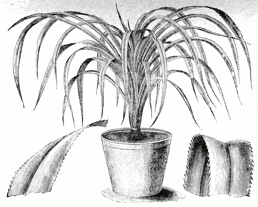 Wegen ihrer eigenartigen Blattstellung und ihres eleganten Wuchses sind die Schraubenbäume oder Pandanaceen von jeher beliebt. Sie sind sämtlich in den Tropen der alten Welt heimisch, gedeihen aber teilweise frei im Zimmer ganz vorzüglich, wenn man ihnen die nötige Pflege zukommen läßt. Dieselbe besteht in reichlicher Bewässerung des gut durchlässigen Erdreiches, [pg 35] Umwickeln der unteren Stammpartie mit Moos, das stets [pg 36] feucht zu halten ist, Begießen mit warmem Wasser von etwa 20–25° R. [25–30°C], Reinhalten der Blätter von Staub und Ungeziefer und Bewahren der Wurzeln vor starken Temperaturschwankungen. Die Anzucht geschieht aus Samen, den man etwas warm stellt oder durch Stecklinge, welche bei etwas Bodenwärme leicht Wurzeln bilden.