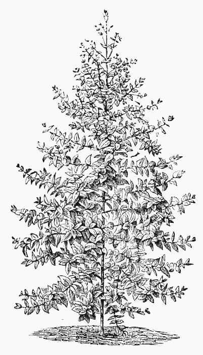 Aus dieser Familie ist der japanische Spindelbaum, Evonymus japonica Thunb.43, in verschiedenen Formen mit grünen, weiß- oder gelbgestreiften Blättern, eine der härtesten Blattpflanzen, welche aber während der Wintermonate durchaus kühl, aber frostfrei, gehalten werden muß. Im übrigen lassen sich diese Pflanzen so ziemlich alles gefallen. Ihres dicht buschigen Wuchses wegen kann man sie vielfach verwenden. Gibt man ihnen eine recht nahrhafte Erde und reichlich Wasser während des Sommers, [pg 71] so entwickeln sie ihre ovalen, lederartigen, glänzenden Blätter sehr schön.