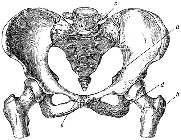 De fijne, dwarsgestreepte lijntjes over de heupkom getrokken geven de plaats aan waar de drie afzonderlijke beenderen van het heupbeen samenkomen en vergroeien. a. darmbeenskam. b. heupkom. c. neerdalende tak van het zitbeen. d. opklimmende tak van het zitbeen. e. horizontale tak van het schaambeen. f. neerdalende tak van het schaambeen. g. foramen obturatum (gesloten gat). hh. plaats, waar het heupbeen zich met het andere vereenigt en de schaambeensvereeniging ontstaat.