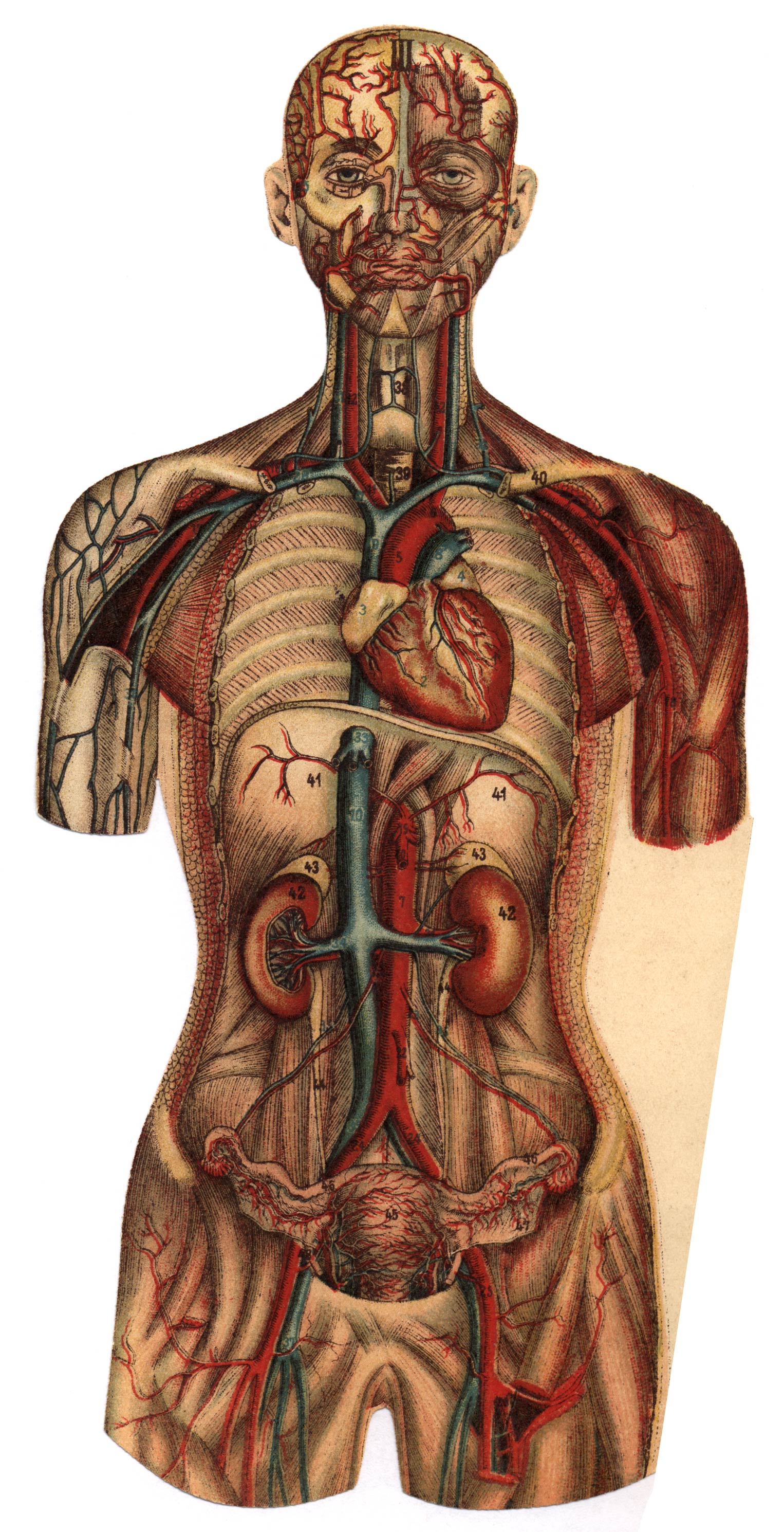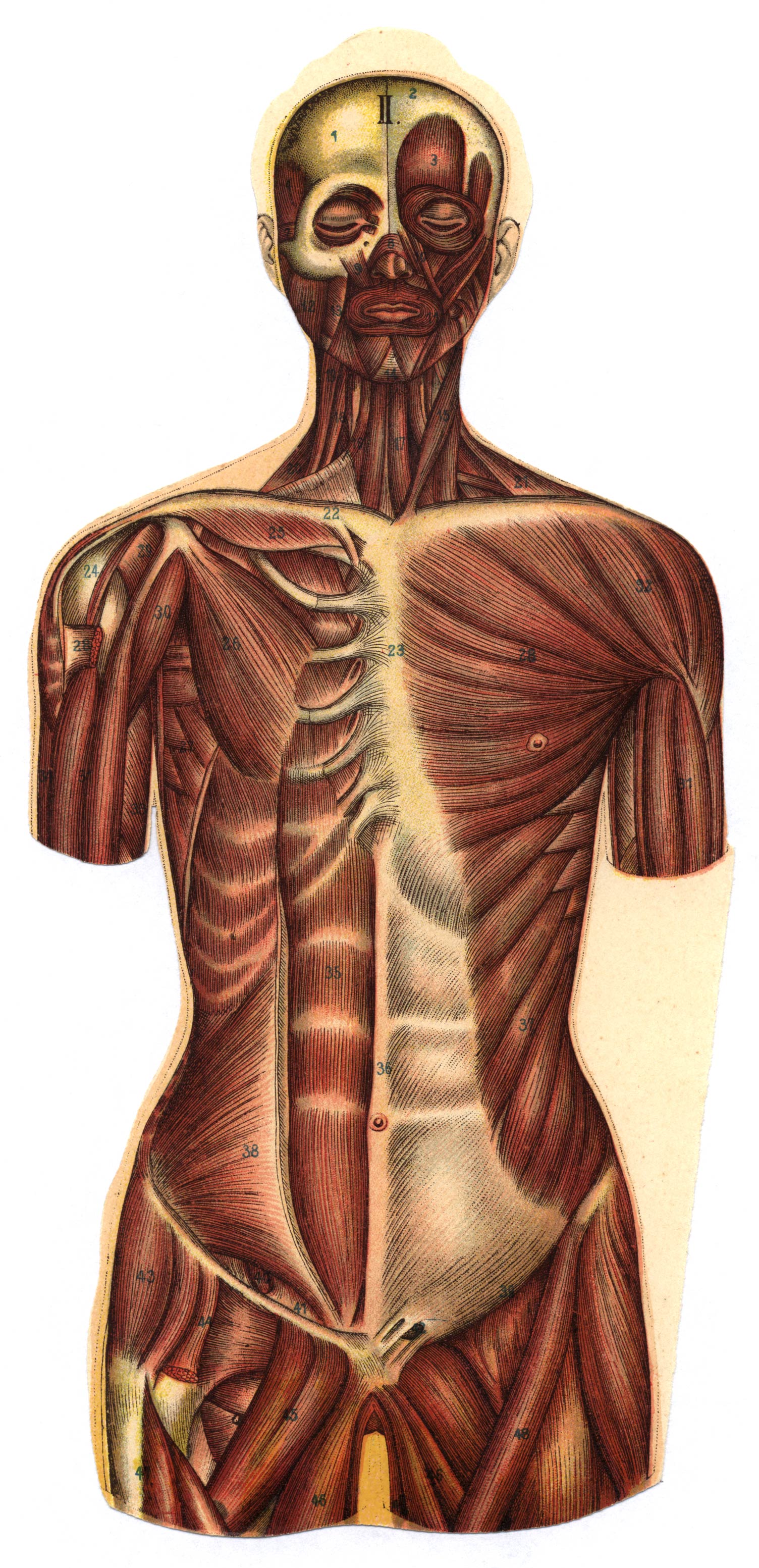 De linker lichaamshelft vertoont de oppervlakkig gelegen spieren; de rechter lichaamshelft geeft een aantal dieper gelegen spieren te zien, die eerst zichtbaar worden, als de daarboven gelegene verwijderd zijn.
