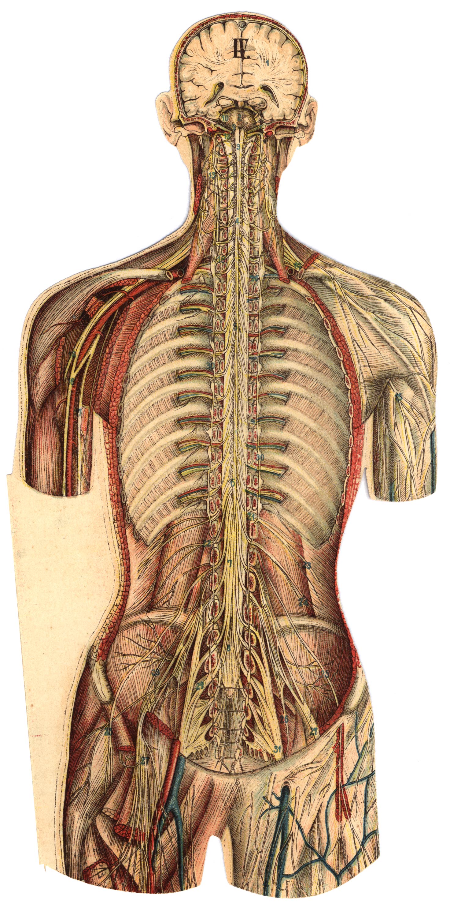 Een doorsnede van het hoofd en de wervelkolom geeft ten deele een overzicht van hersenen en ruggemerg, terwijl de armen en beenen zoodanig zijn afgesneden, dat men den aanvang der voor hen bestemde zenuwen kan overzien. [44]