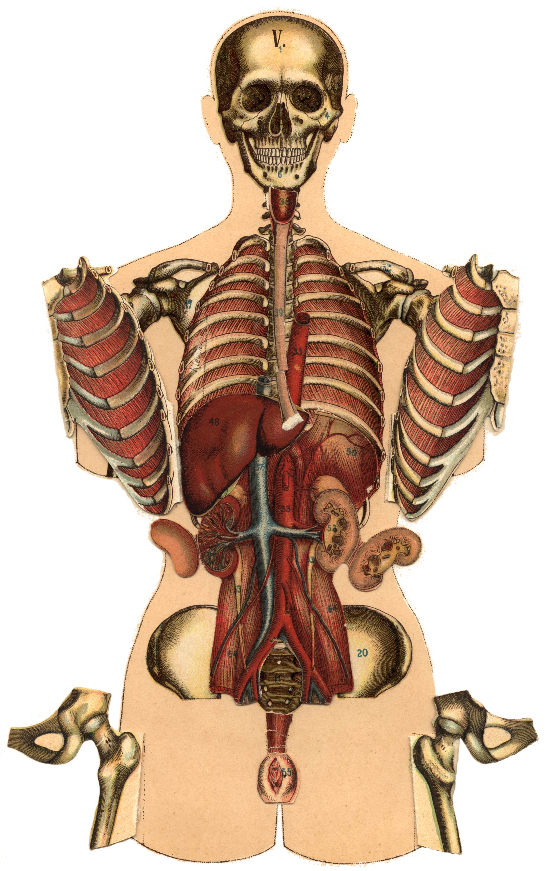 De beenderen van de bovenste en onderste ledematen bestaan uit verschillende afdeelingen. Aan de bovenste ledematen onderscheiden wij schouder, bovenarm, onderarm en hand. De schouder bestaat uit sleutelbeen (clavicula), Plaat V No. 13, en schouderblad, (scapula), Plaat V No. 17. Het sleutelbeen van de vrouw is naar verhouding langer dan dat van den man.