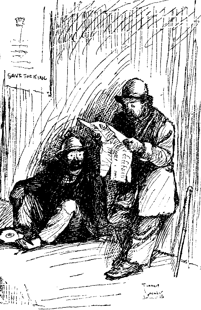 "The Birth of a Fluence," it will be seen, does not confine its energies to the office of the paper. So thorough is the scheme that various pictures have been taken—always, of course, at the usual enormous expense—at even distant places, where its activities, or the result of them, can be studied. For example, we are shown a section of the Front and the delight of the English soldier as he unfolds the paper and discovers that his country is still being goaded towards that healthy disintegration which must necessarily accelerate our victory. And we are even shown one of the paper's defeated candidates seeking the railway-station after the election; for it is notorious that, vast as are the paper's other influences, it is often unable to persuade an electorate to follow it.